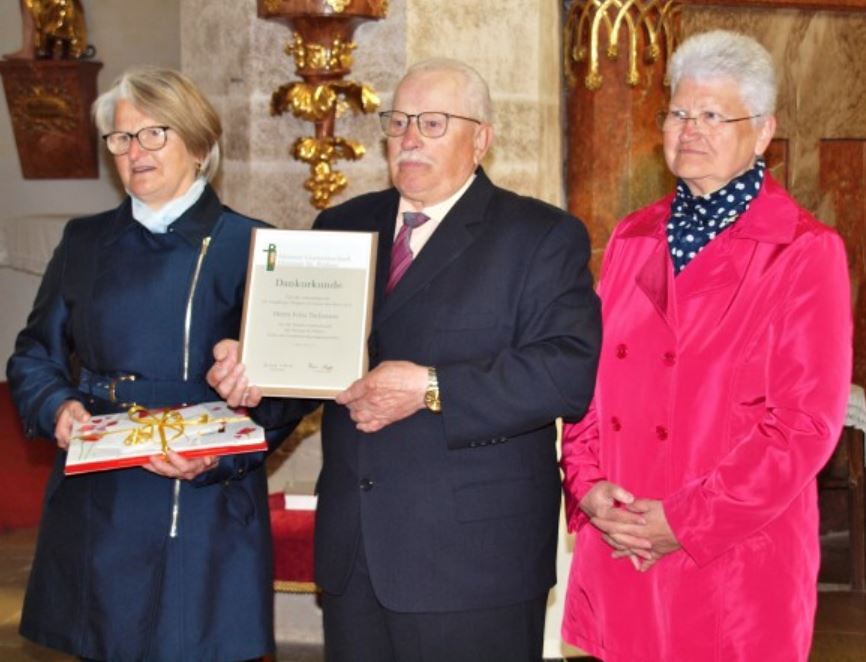 ... im Namen von Pfarrer P. Christoph Mayrhofer und der gesamten Pfarrgemeinde zu seinem 80. Geburtstag und überreichten ihm eine Dankesurkunde für viele Jahre Mesnerdienste und sonstige Hilfe bei Arbeiten in der Sakristei und Kirche.
