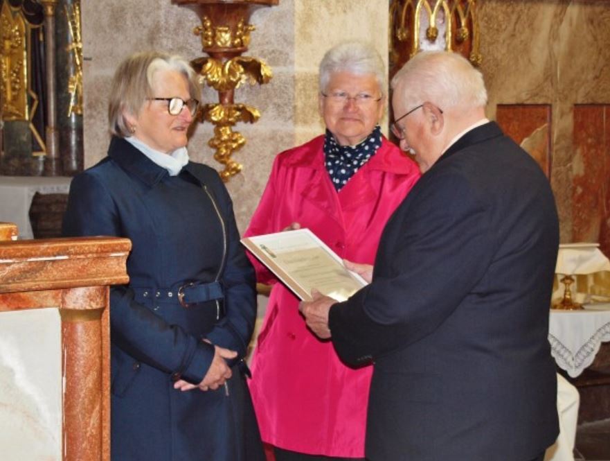 Die Obfrau des Pfarrgemeinderates Hermine Bürgmayr und die Mesnerin Adelheid Falkensteiner gratulierten Herrn Fritz Tscherner ...