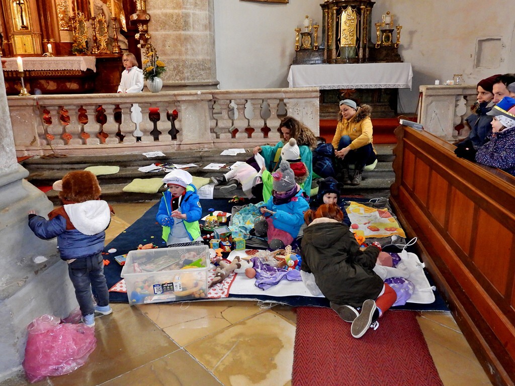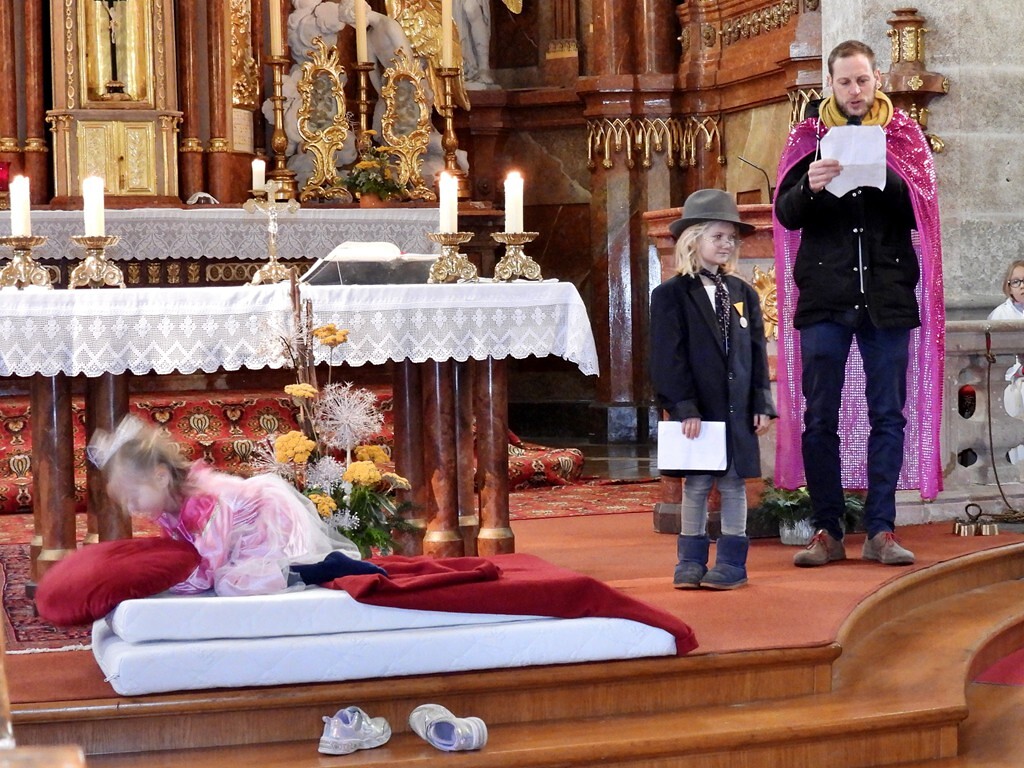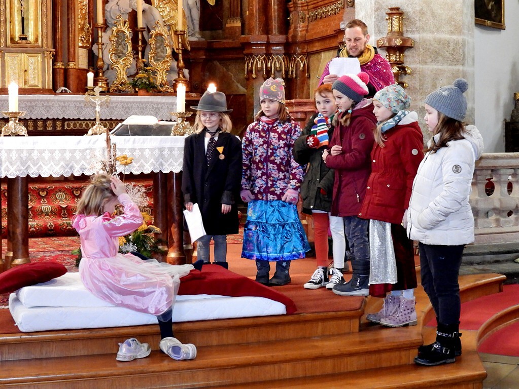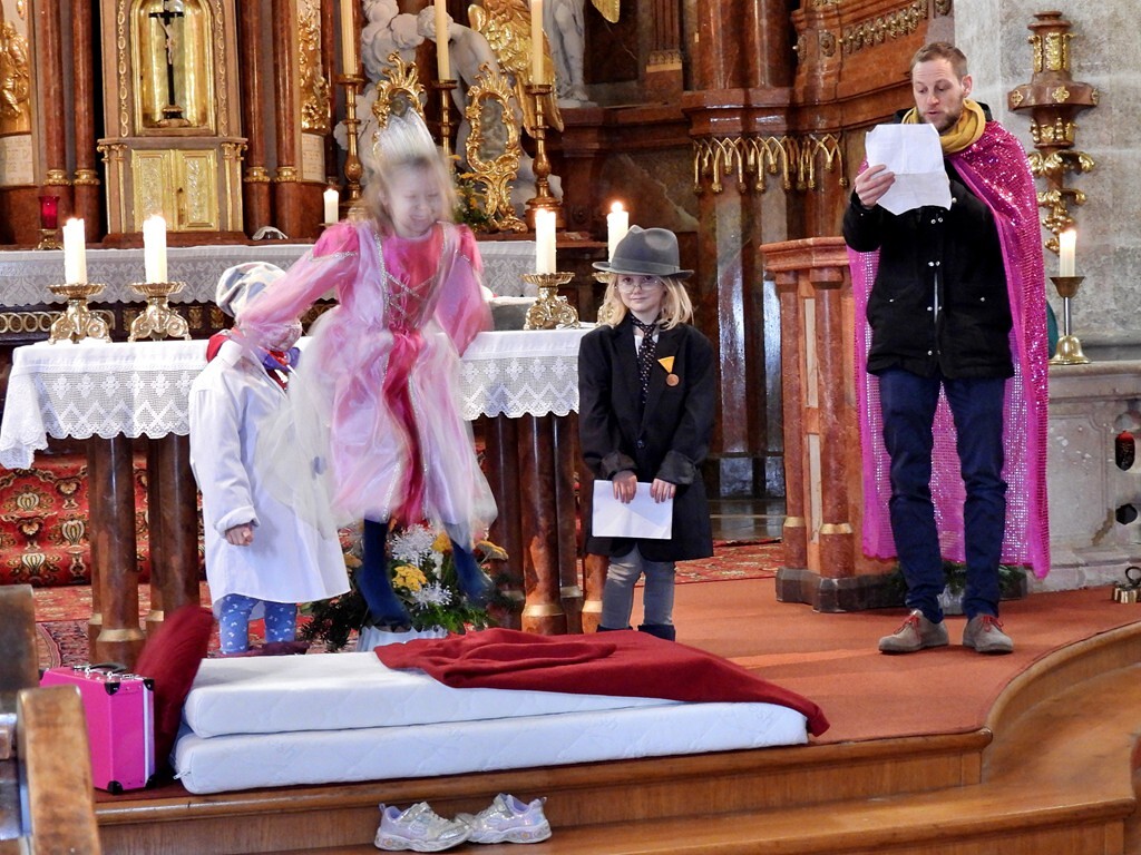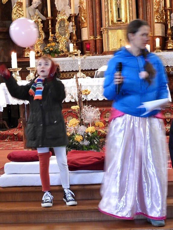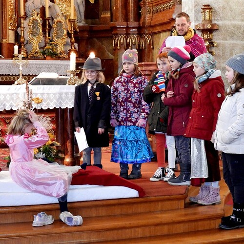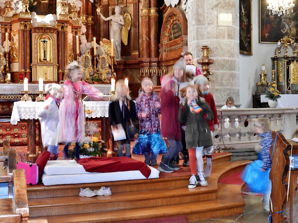 Wie die "Kirchenband" war auch der Spieleteppich wieder im Einsatz. Sehr viele Kinder (siehe Gruppenbild) waren wieder mit ihren Eltern und auch Großeltern in die Pfarrkirche gekommen. Einige Kinder stellten die vorgelesene Geschichte von der Prinzessin HUPF dar, welche zeigt, wie wichtig es ist lustig zu sein und zu lachen.