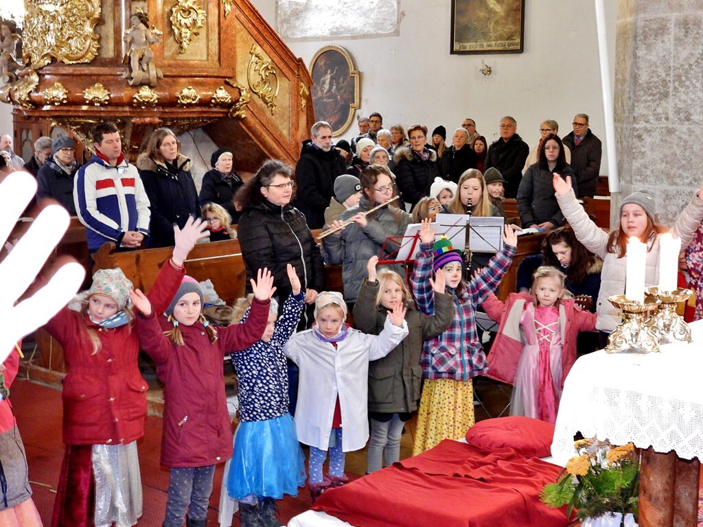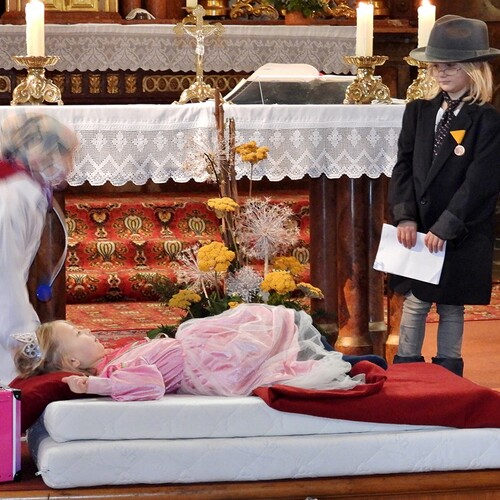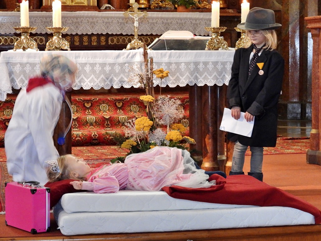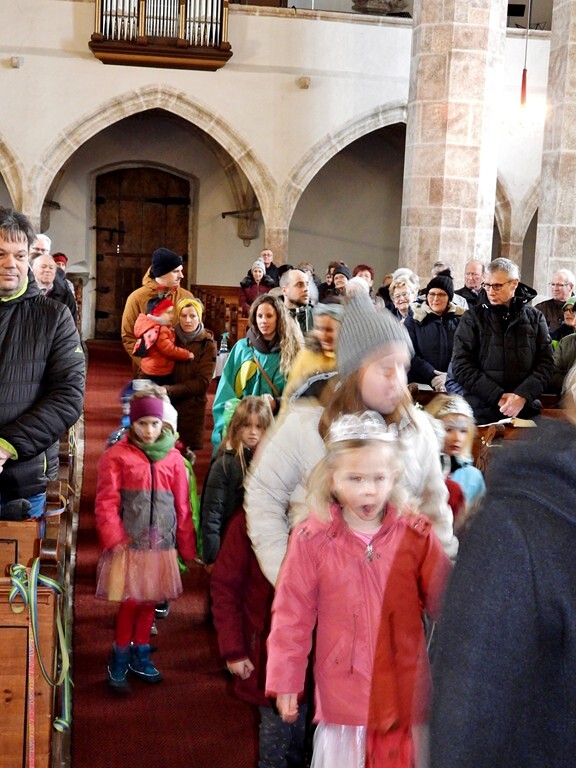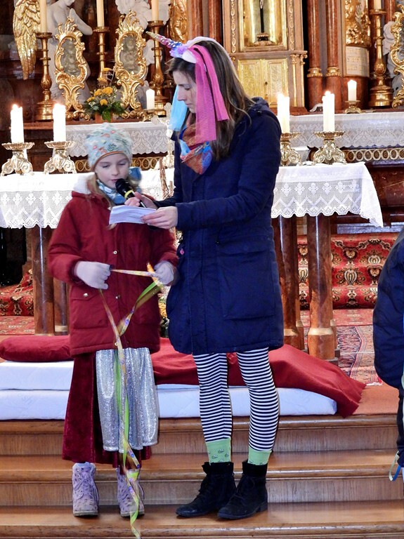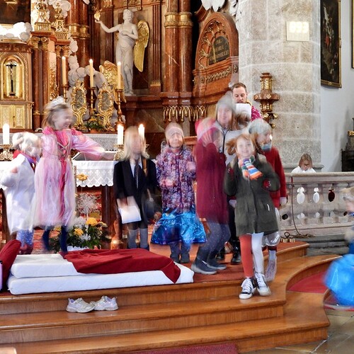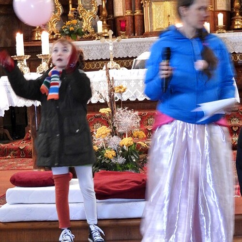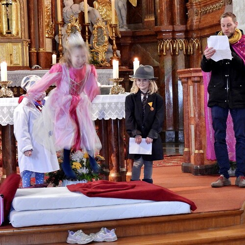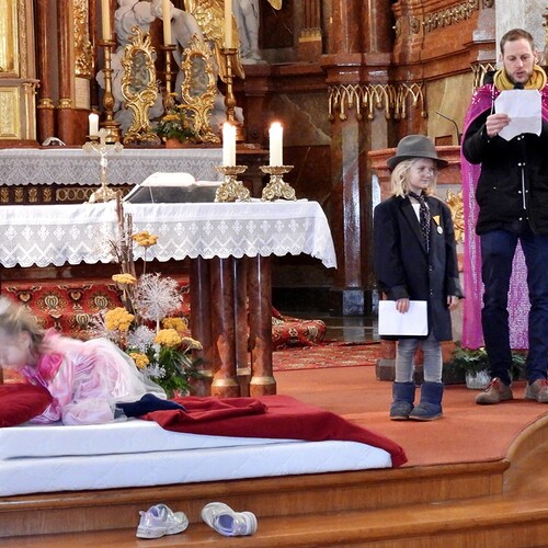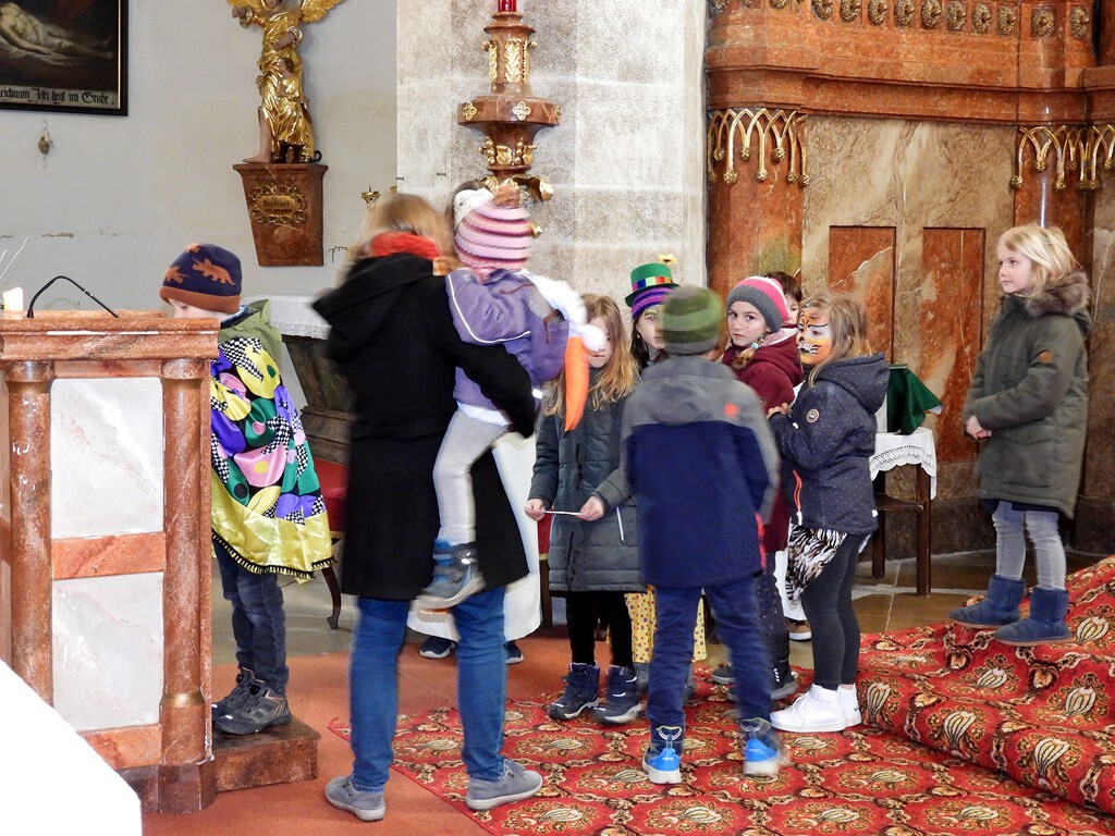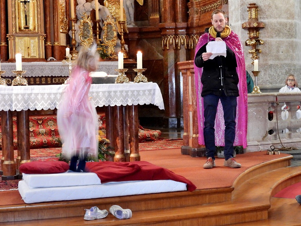 Wie die "Kirchenband" war auch der Spieleteppich wieder im Einsatz. Sehr viele Kinder (siehe Gruppenbild) waren wieder mit ihren Eltern und auch Großeltern in die Pfarrkirche gekommen. Einige Kinder stellten die vorgelesene Geschichte von der Prinzessin HUPF dar, welche zeigt, wie wichtig es ist lustig zu sein und zu lachen.