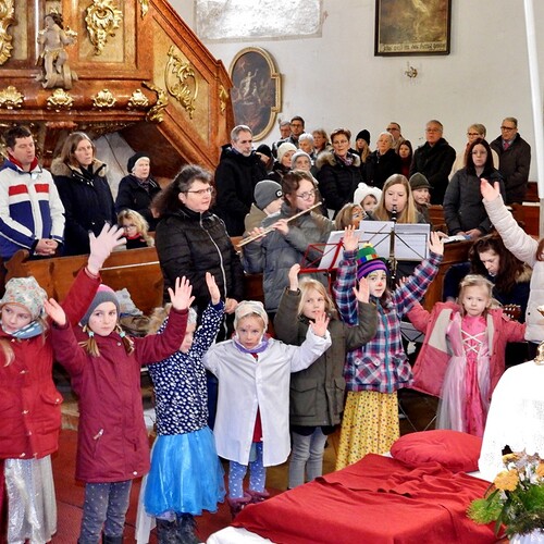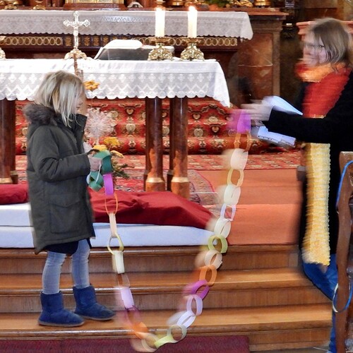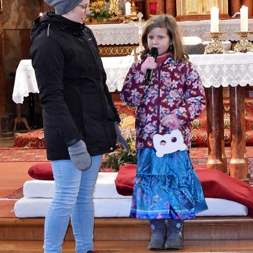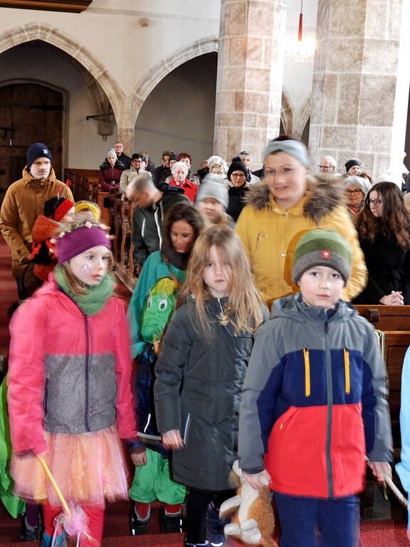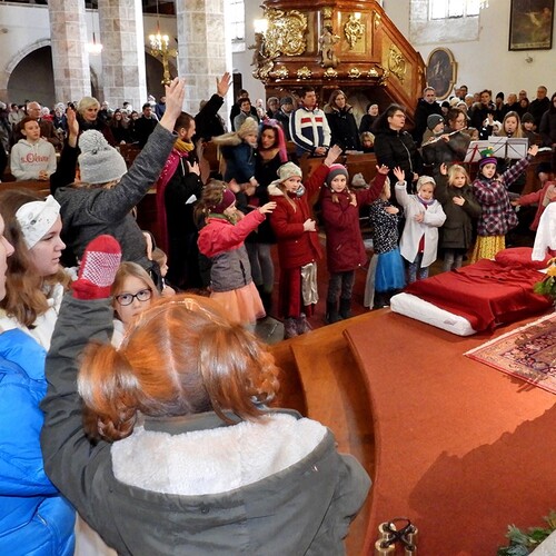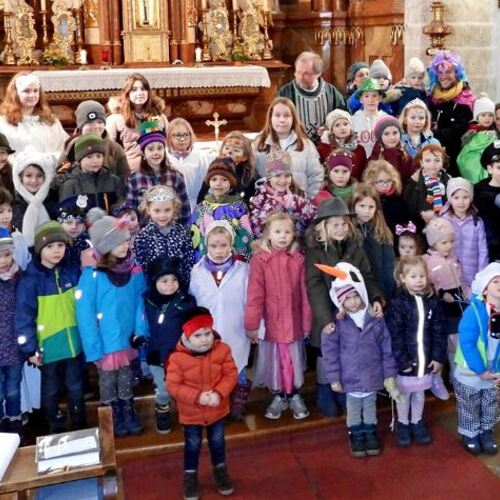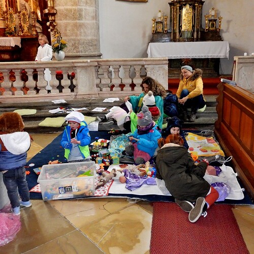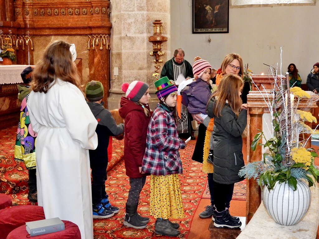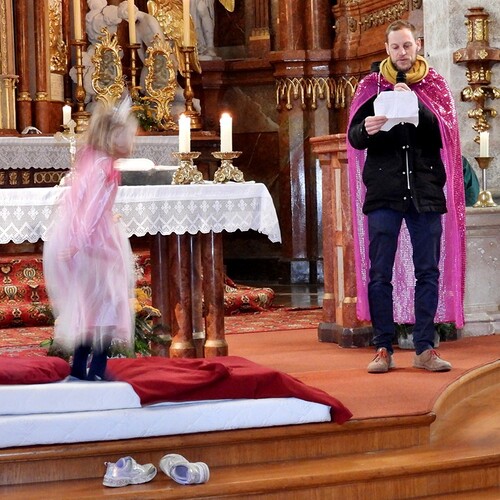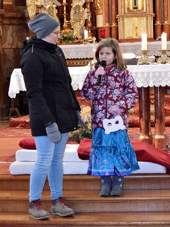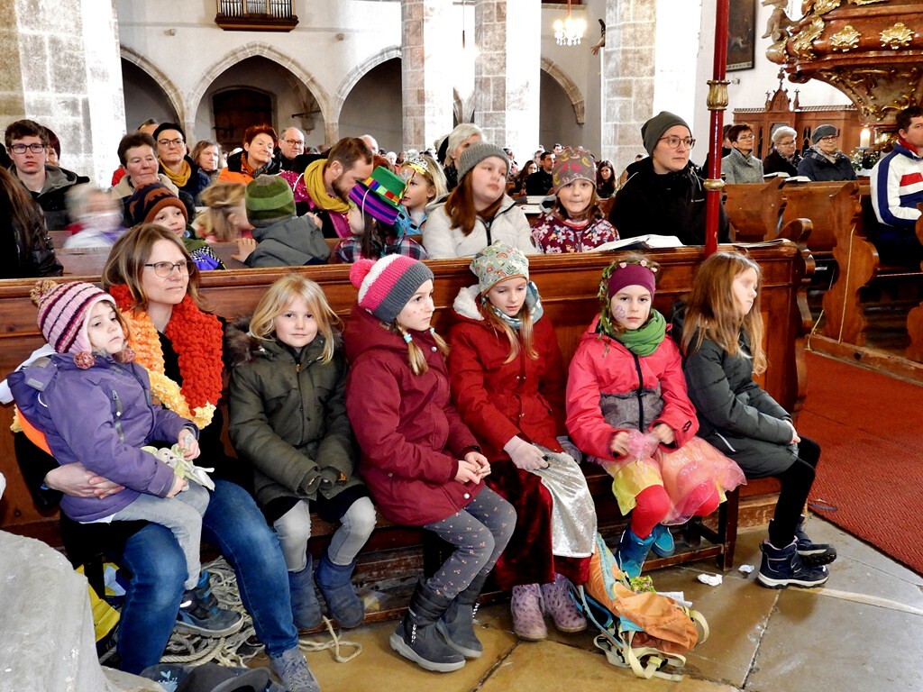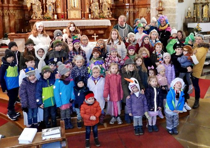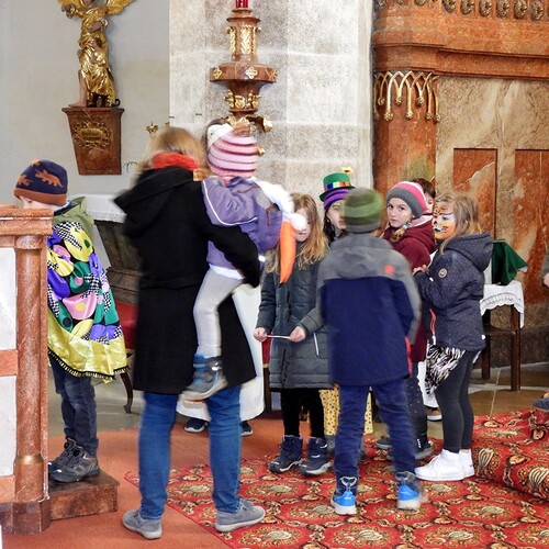 Wie die "Kirchenband" war auch der Spieleteppich wieder im Einsatz. Sehr viele Kinder (siehe Gruppenbild) waren wieder mit ihren Eltern und auch Großeltern in die Pfarrkirche gekommen. Einige Kinder stellten die vorgelesene Geschichte von der Prinzessin HUPF dar, welche zeigt, wie wichtig es ist lustig zu sein und zu lachen.