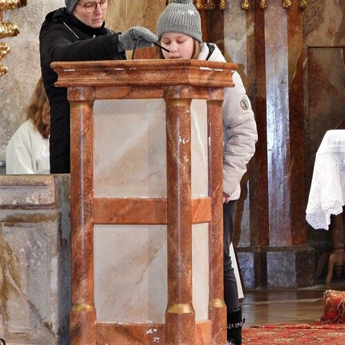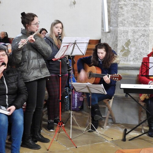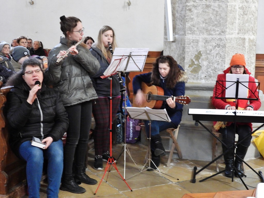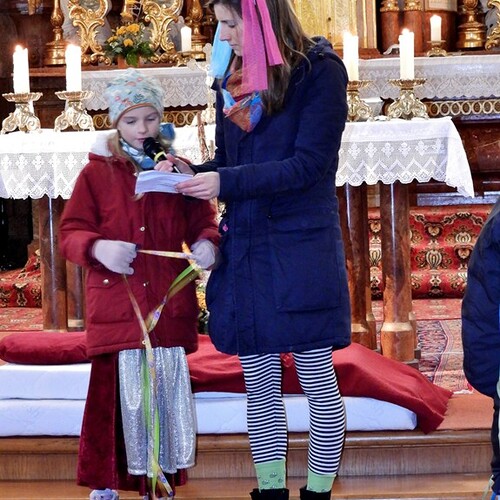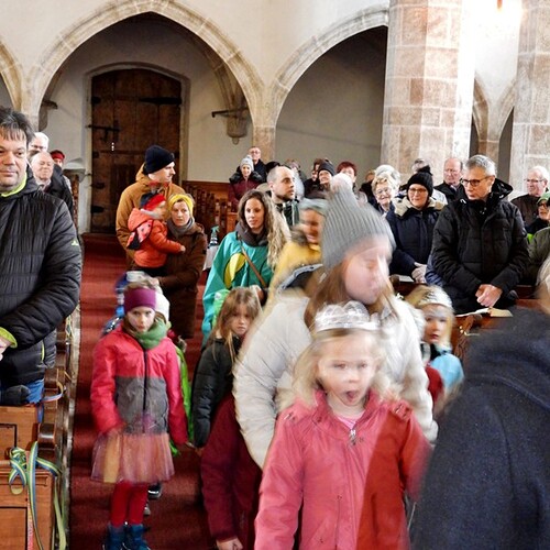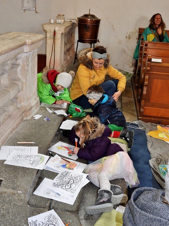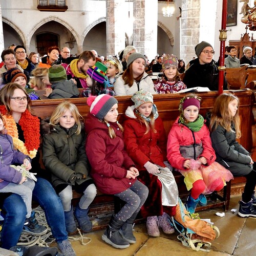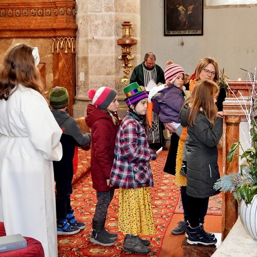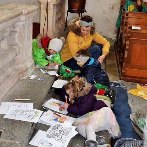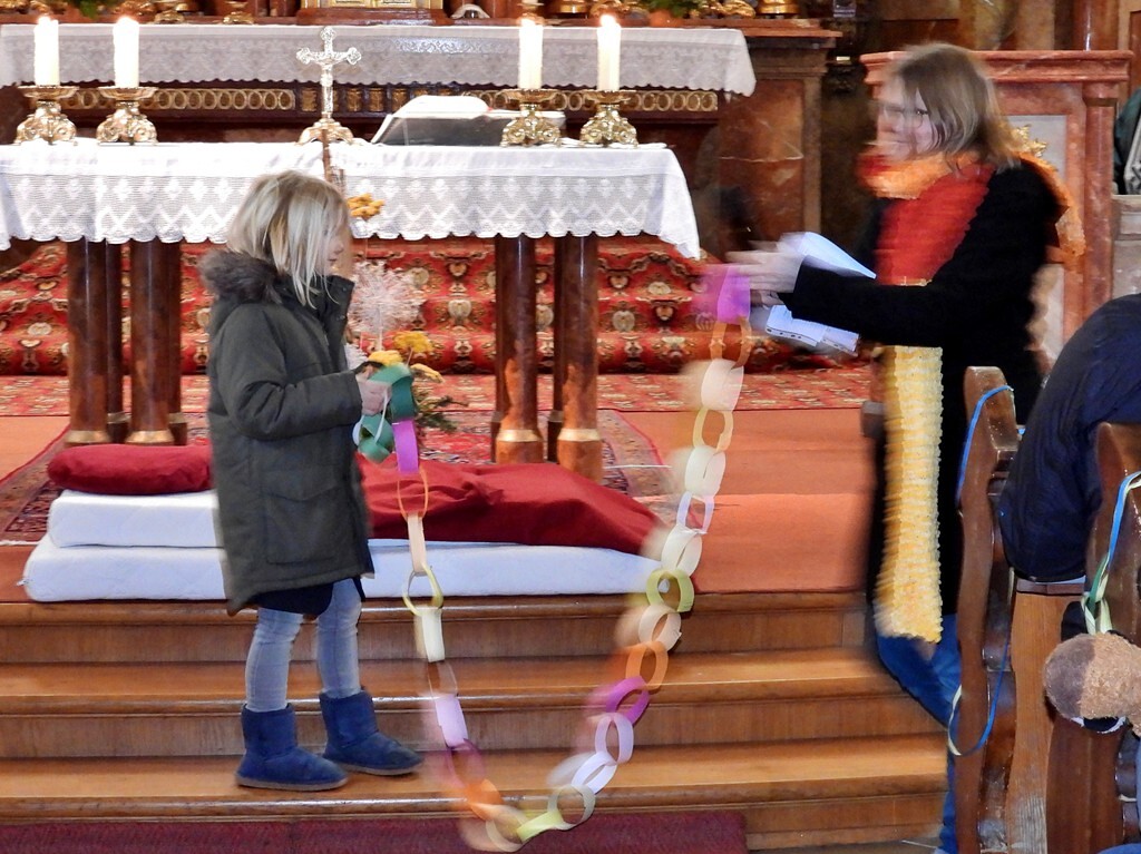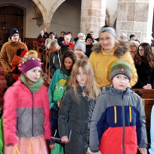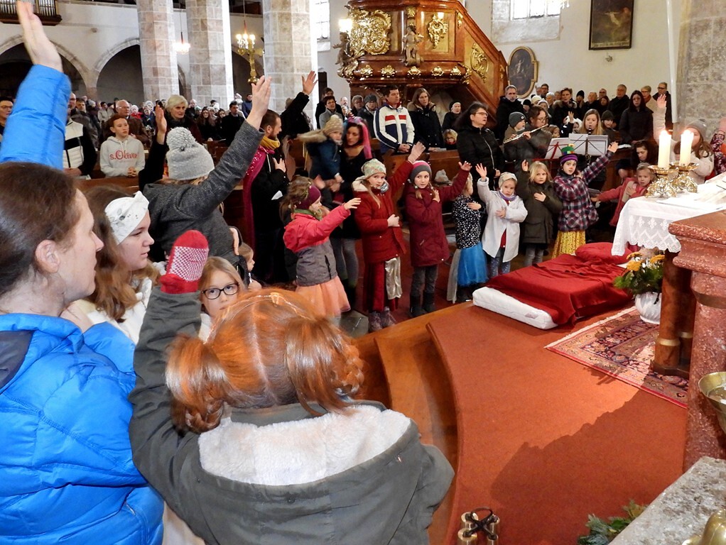 Wie die "Kirchenband" war auch der Spieleteppich wieder im Einsatz. Sehr viele Kinder (siehe Gruppenbild) waren wieder mit ihren Eltern und auch Großeltern in die Pfarrkirche gekommen. Einige Kinder stellten die vorgelesene Geschichte von der Prinzessin HUPF dar, welche zeigt, wie wichtig es ist lustig zu sein und zu lachen.