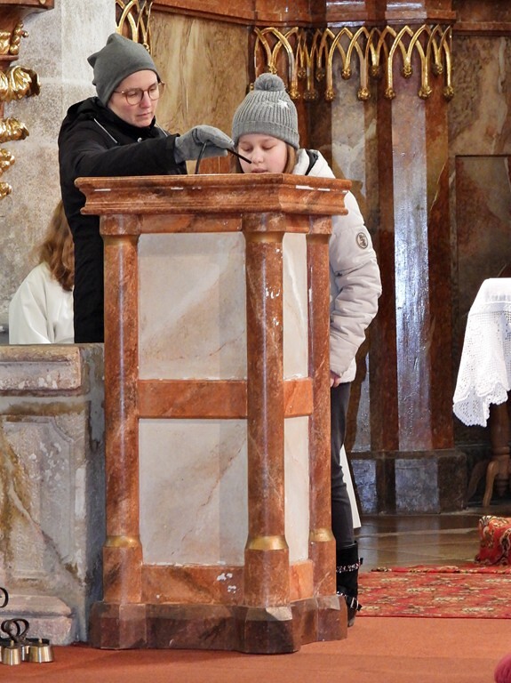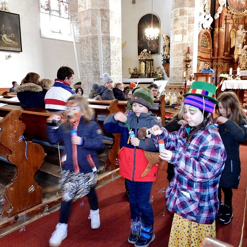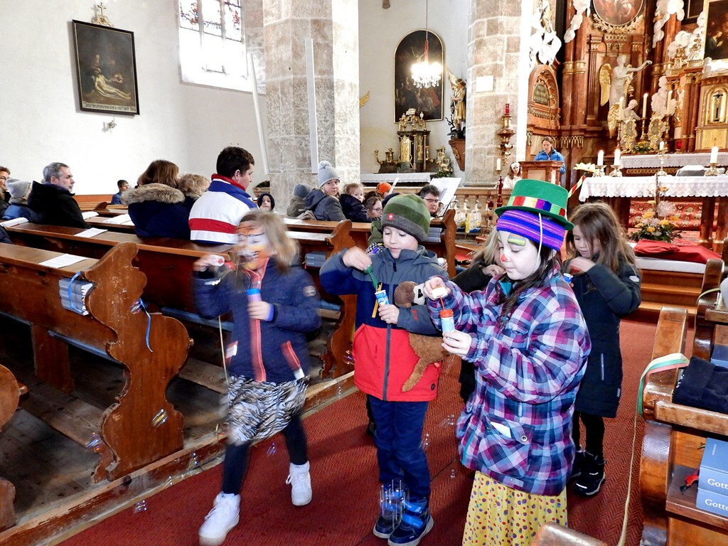 Kinder, welche anschließend die Fürbitten lasen, durften in der Kirche Seifenblasen versprühen.