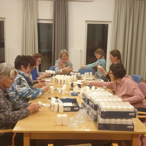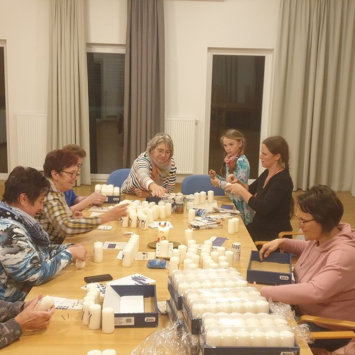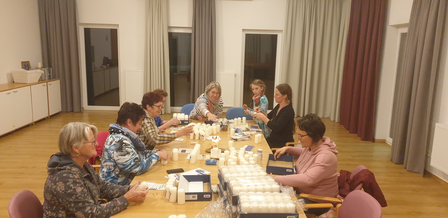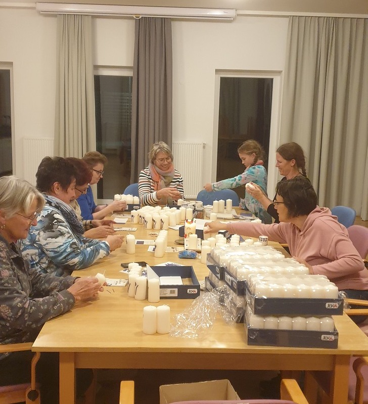 Am Donnerstag, dem 16. November 2023, versammelten sich acht Frauen und ein Mädchen im Pfarrtreff, um wie jedes Jahr die Kerzen für die Aktion "Unter jedem Christbaum brennt eine Missionskerze" gemeinsam zu gestalten.