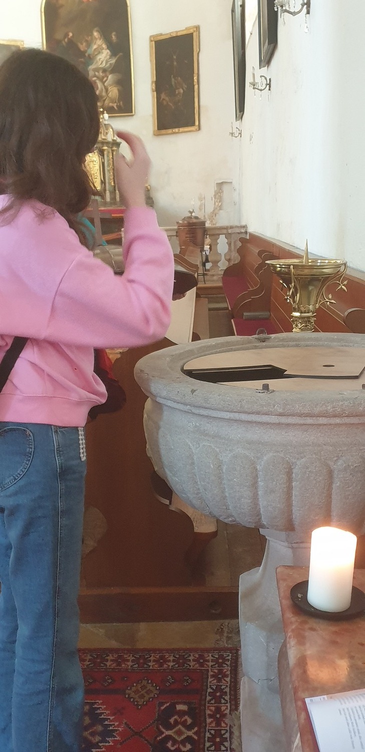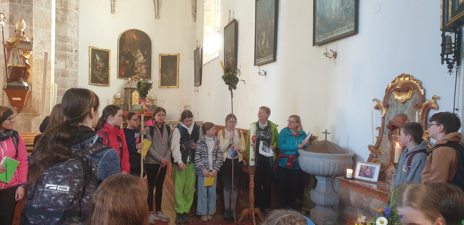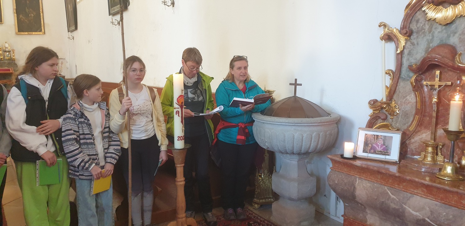 Die Pilgerung begann mit einem Besuch in der Kirche, wo die Gruppe um das Taufbecken versammelt wurde. Dort wurde gemeinsam das Kreuzzeichen gemacht, um an den Beginn ihres Glaubensweges durch die Taufe zu erinnern. Es wurde reflektiert, wie die Taufe den Anfang einer Reise mit Gott markierte, die nun in die Selbstbestimmung und bewusste Entscheidung für den Glauben führt.