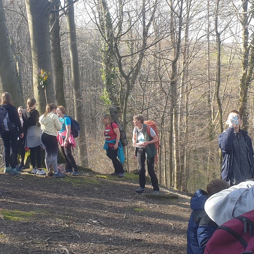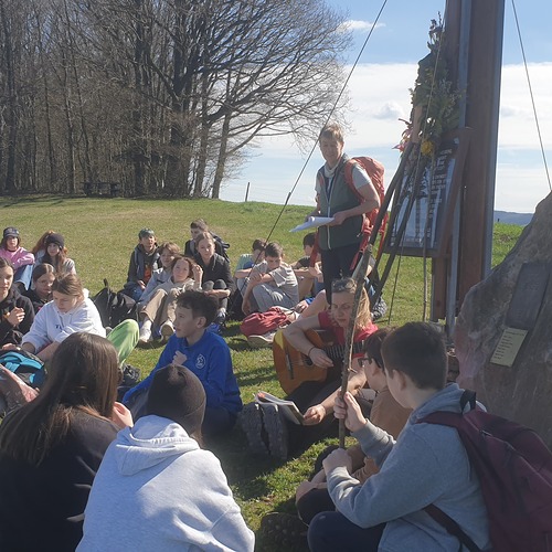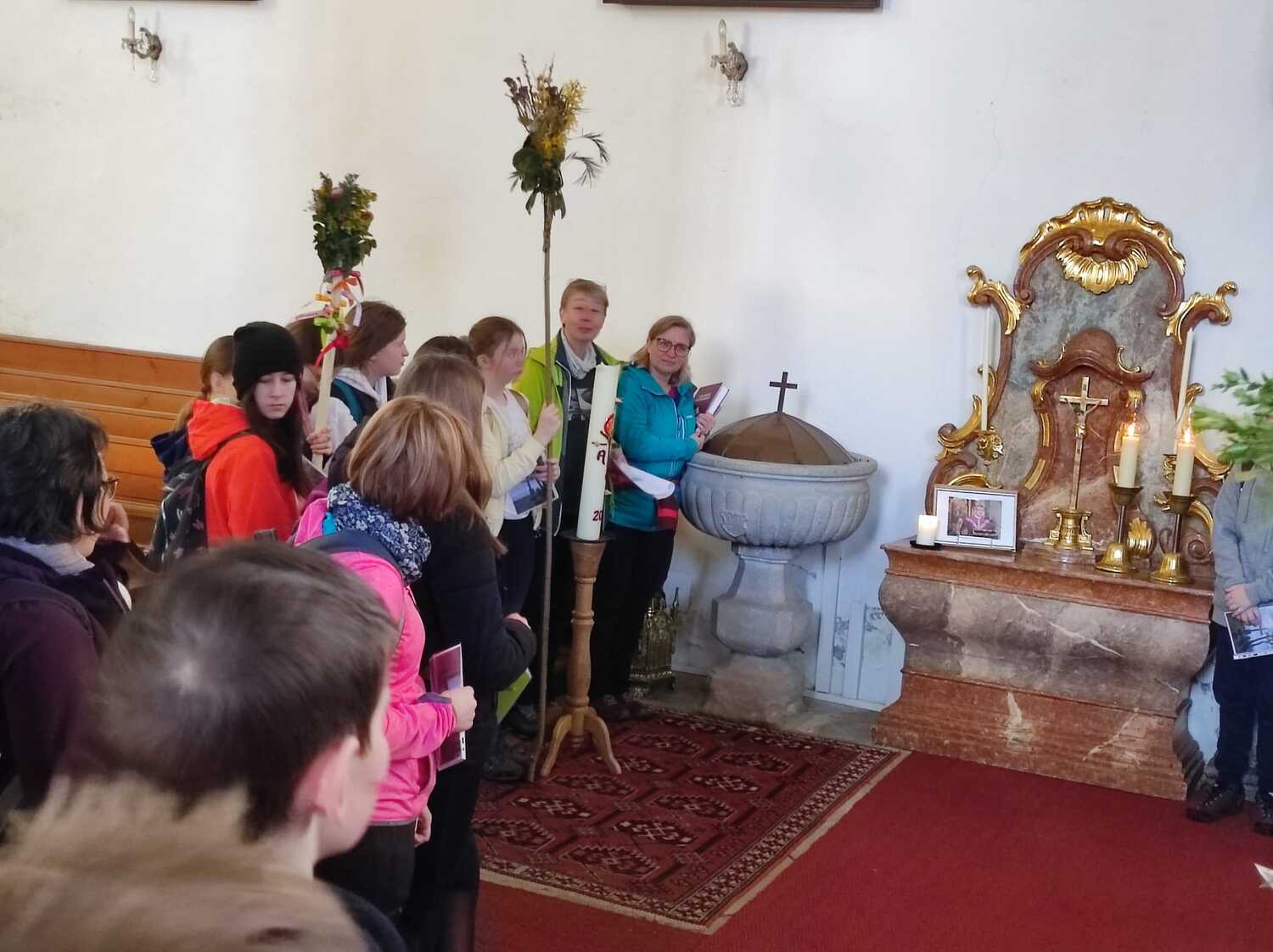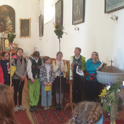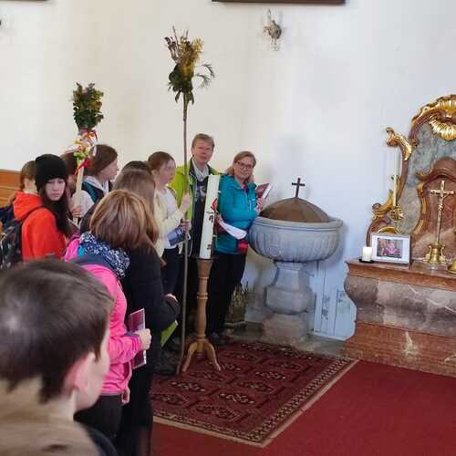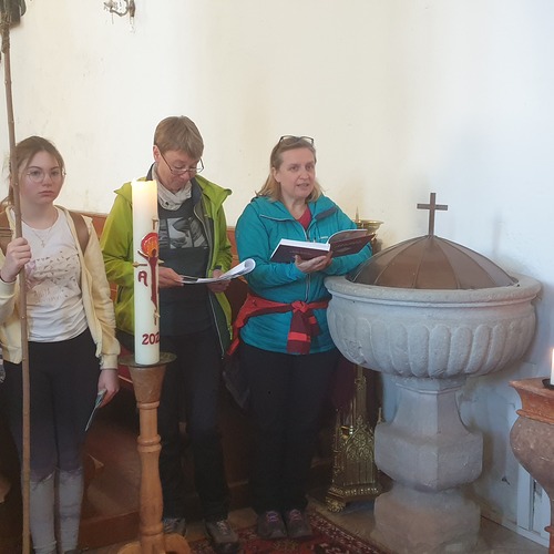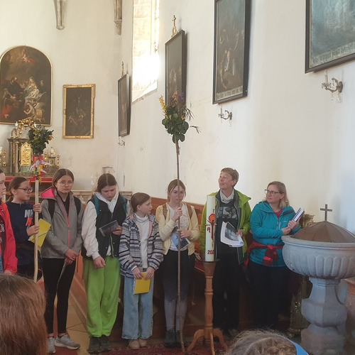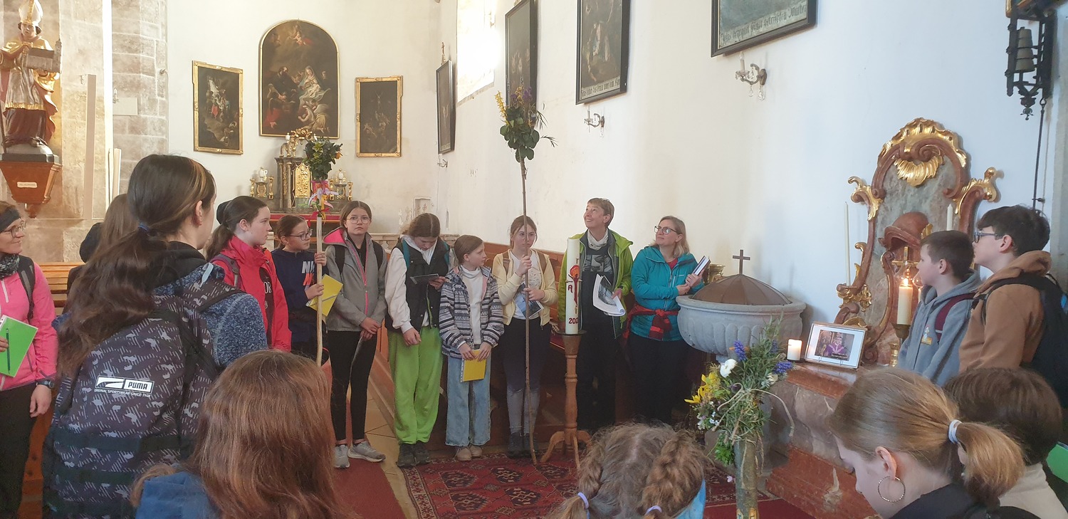 Die Pilgerung begann mit einem Besuch in der Kirche, wo die Gruppe um das Taufbecken versammelt wurde. Dort wurde gemeinsam das Kreuzzeichen gemacht, um an den Beginn ihres Glaubensweges durch die Taufe zu erinnern. Es wurde reflektiert, wie die Taufe den Anfang einer Reise mit Gott markierte, die nun in die Selbstbestimmung und bewusste Entscheidung für den Glauben führt.