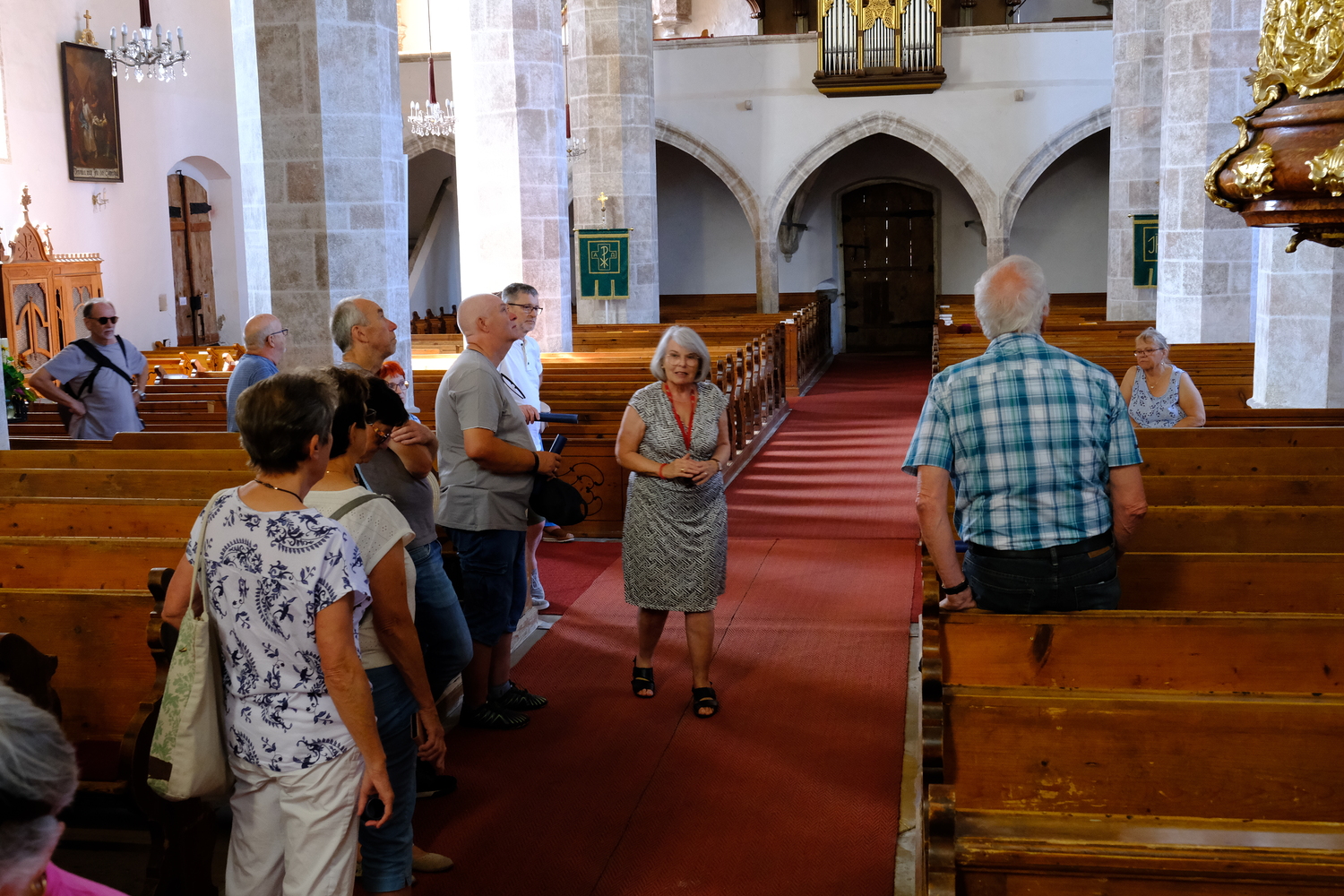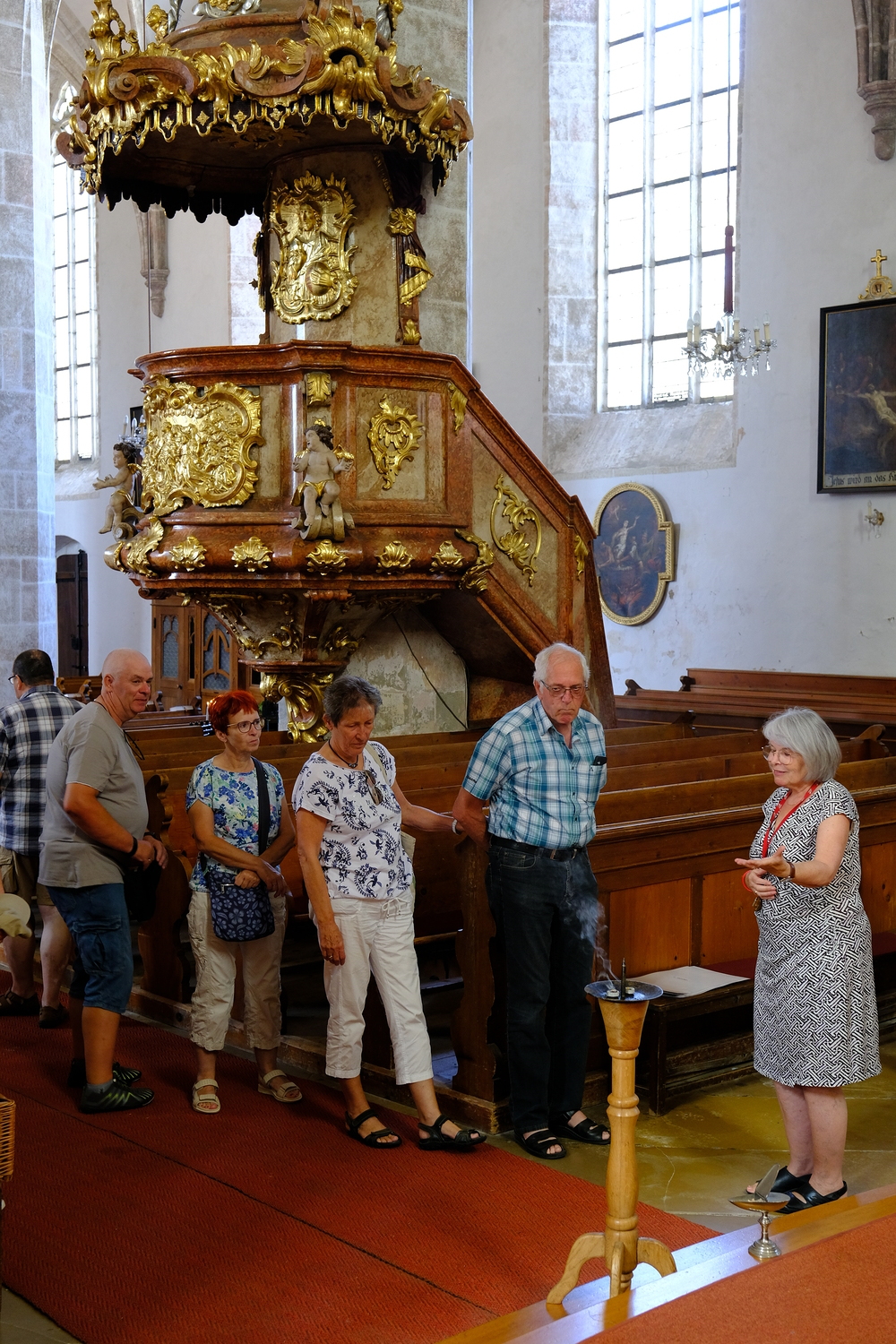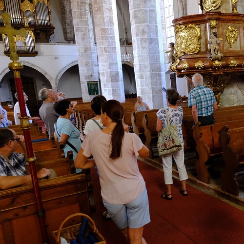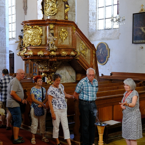 Da die Mehrheit der Kirtorfer Besucherinnen und Besucher evangelisch ist, stellte Frau Brigitte Felnhofer die Führungen unter das Motto "Kunst und Kirche im Spannungsfeld zwischen evangelischer und katholischer Konfession". Auf diese Weise konnten die Heiligenverehrung, die Marienverehrung und das barocke Lebensgefühl gut erläutert und so unsere Pfarrkirche vorgestellt werden.