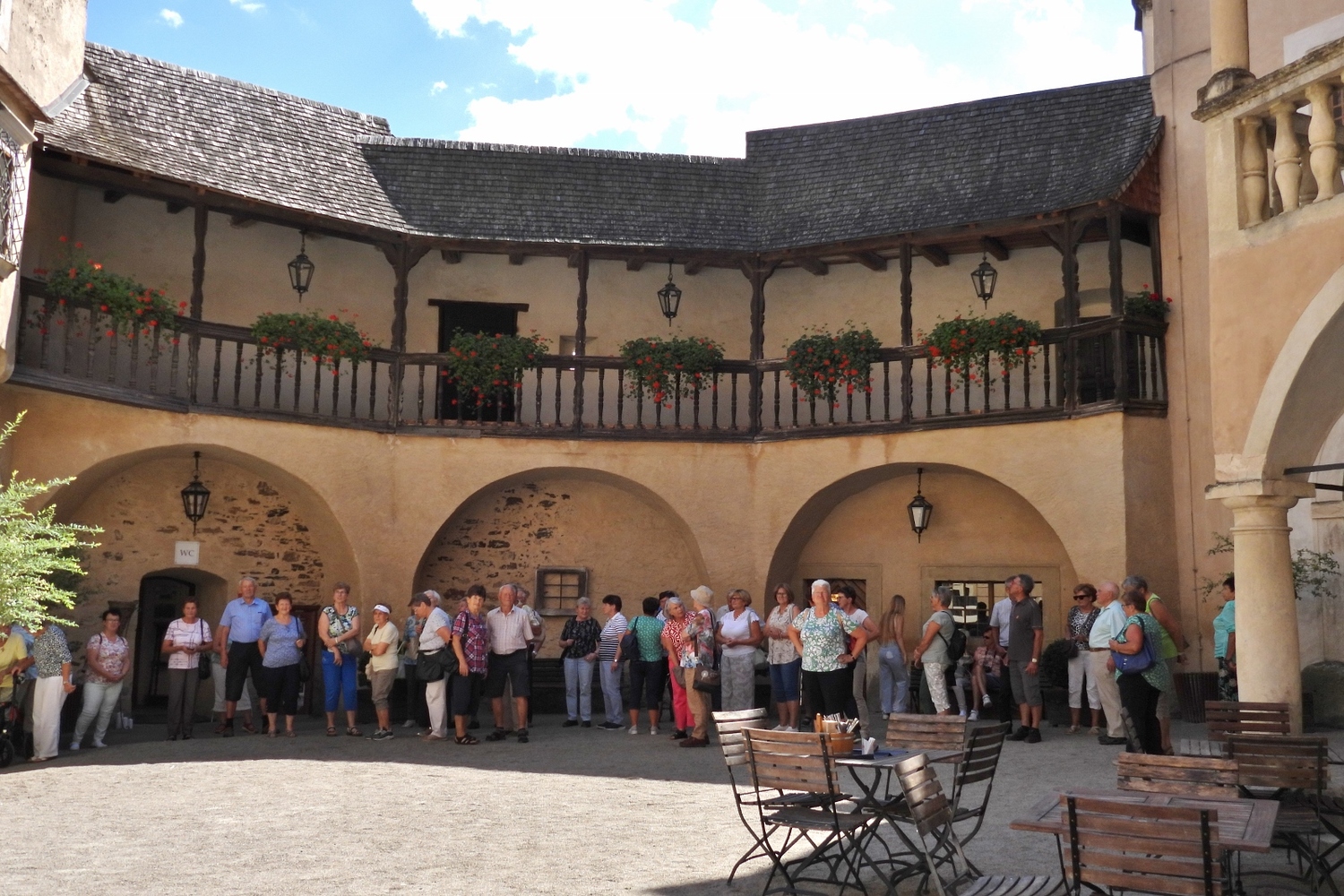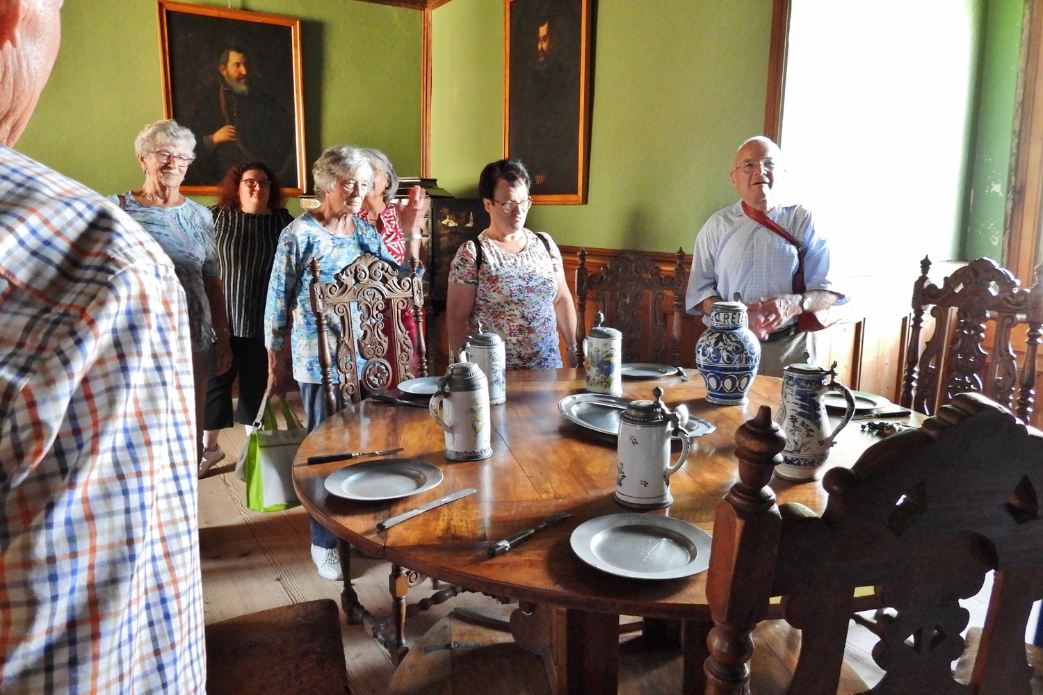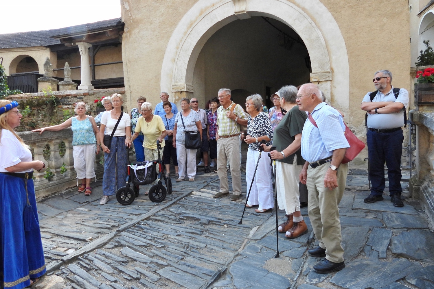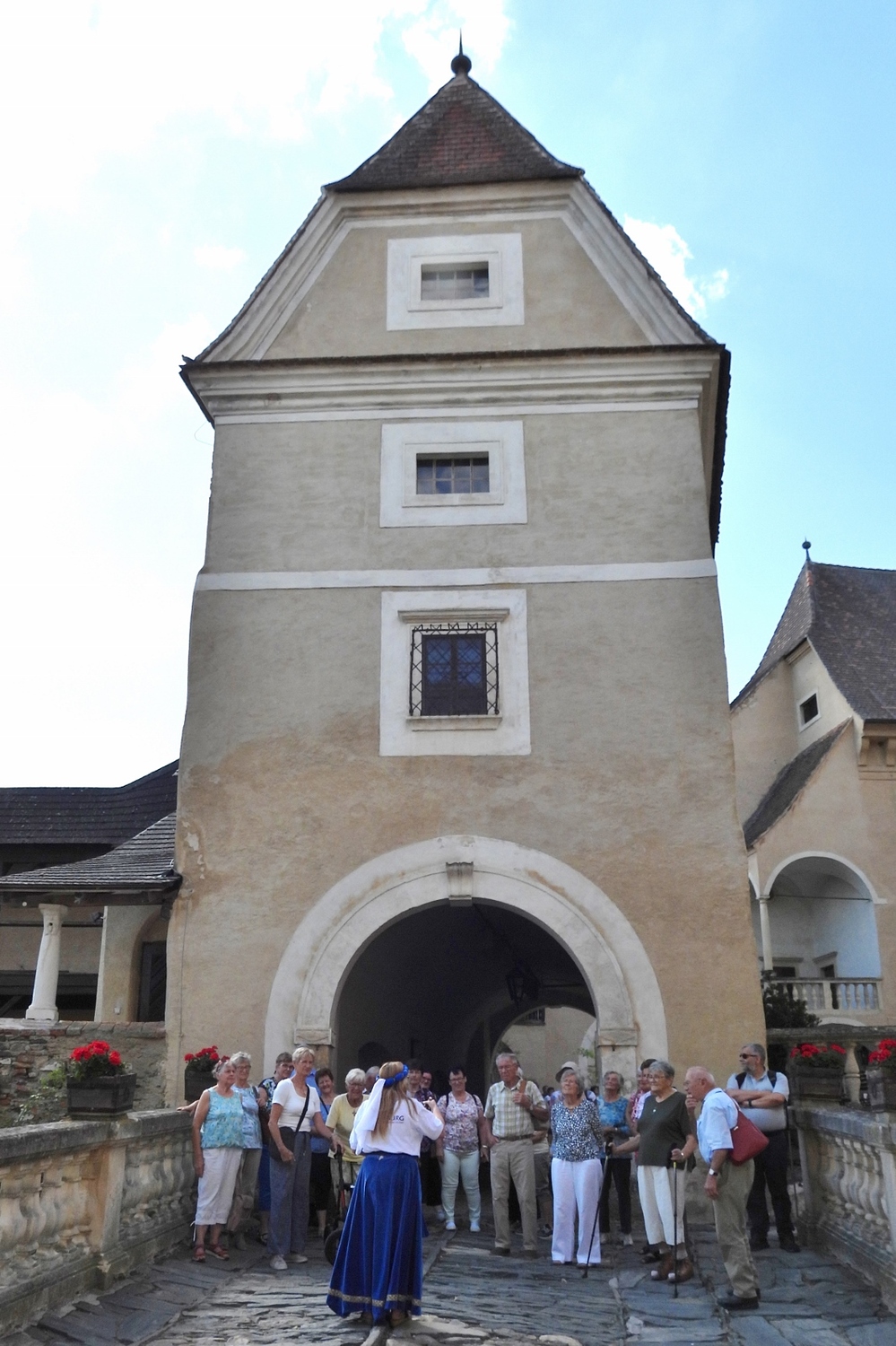 Anschließend führte die Fahrt zur Rosenburg, wo im Schlossgasthof schon das Mittagessen in Form eines Buffets vorbereitet war. Danach fand aufgeteilt in 2 Gruppen eine Führung durch das Schlossmuseum mit seinen herrschaftlichen Wohnräumen, Prunksälen, Schlosskapelle und Bibliothek statt.