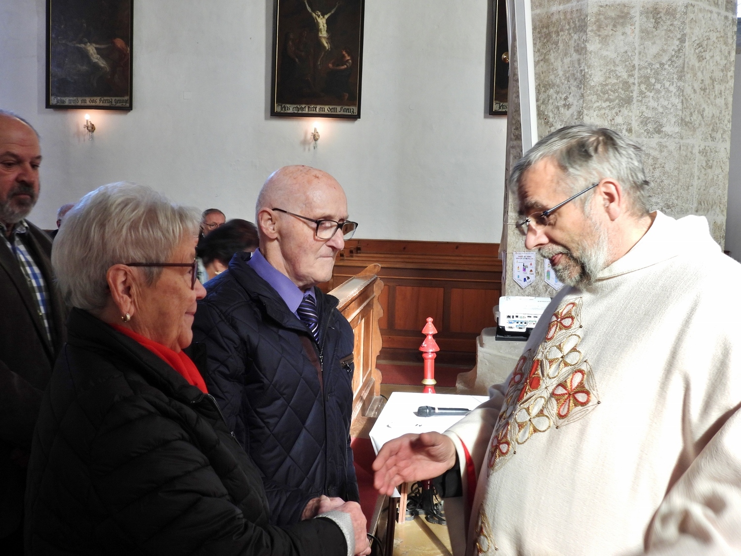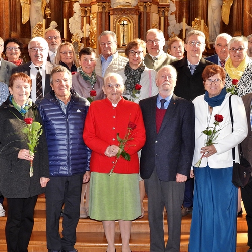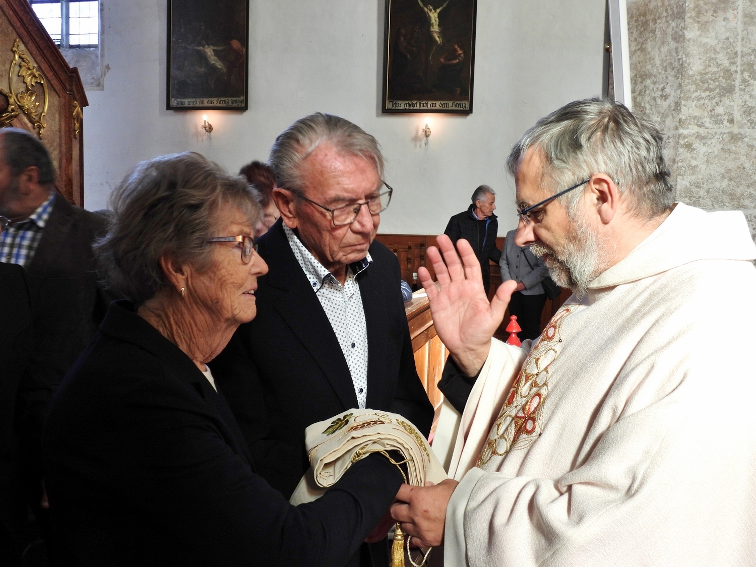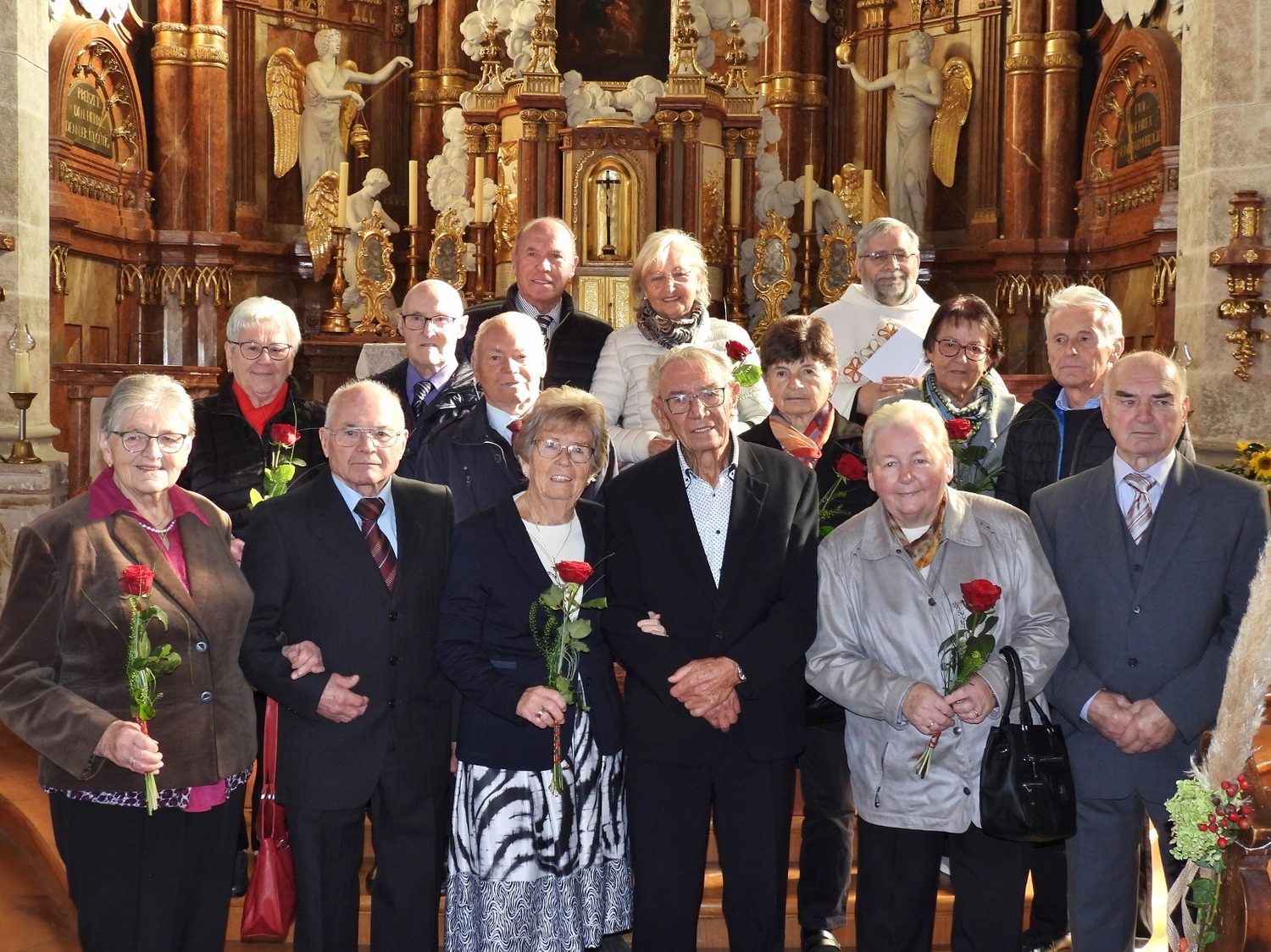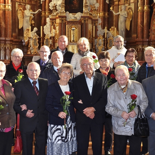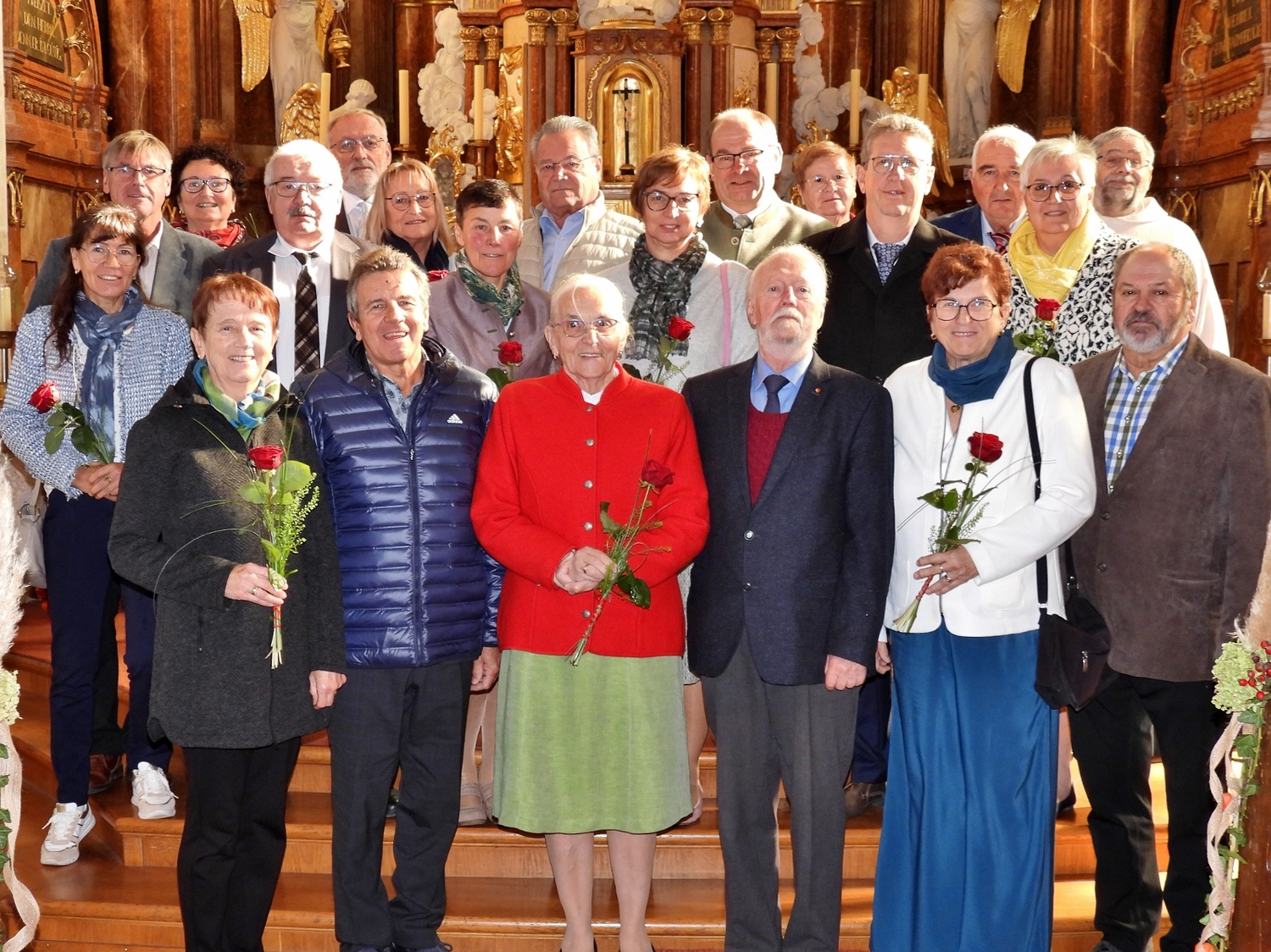 17 Jubelpaare (3 Diamantpaare, 4 Smaragdpaare, 3 Goldpaare und 7 Rubinpaare) hatten sich unter dem Turm versammelt und zogen mit Ministranten und dem Provisor P. Christian Gimbel in die Kirche ein. Die Festmesse wurde vom Pfarrchor mitgestaltet.
