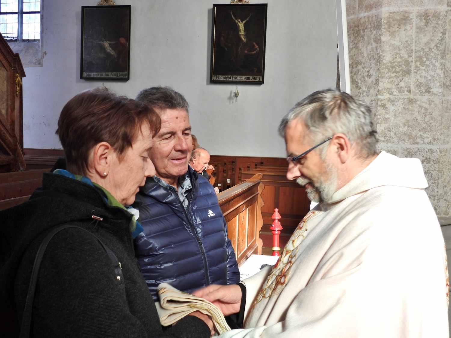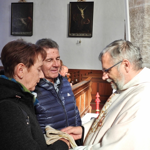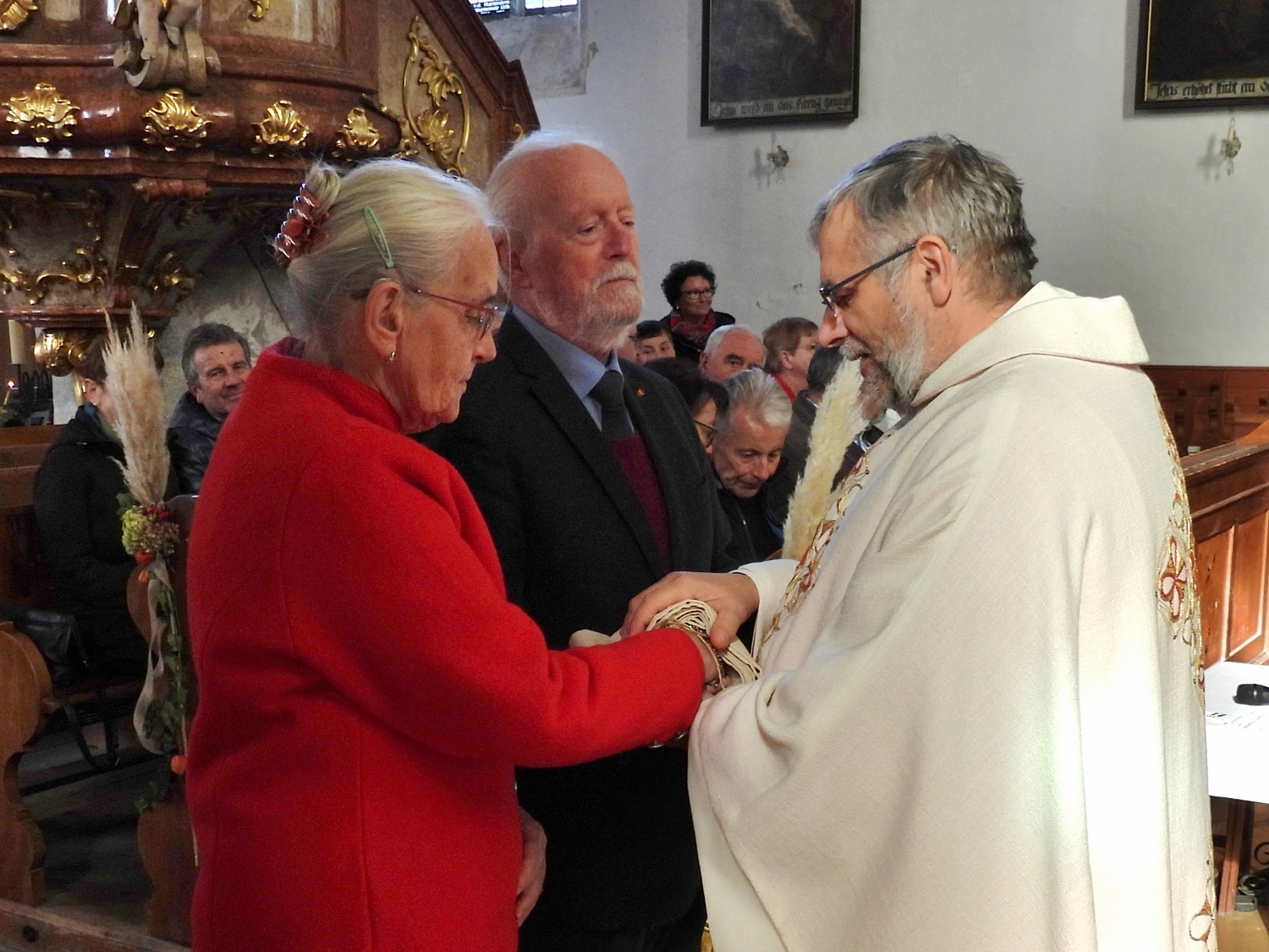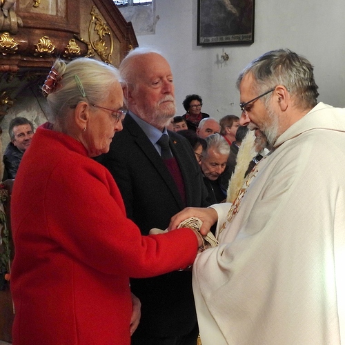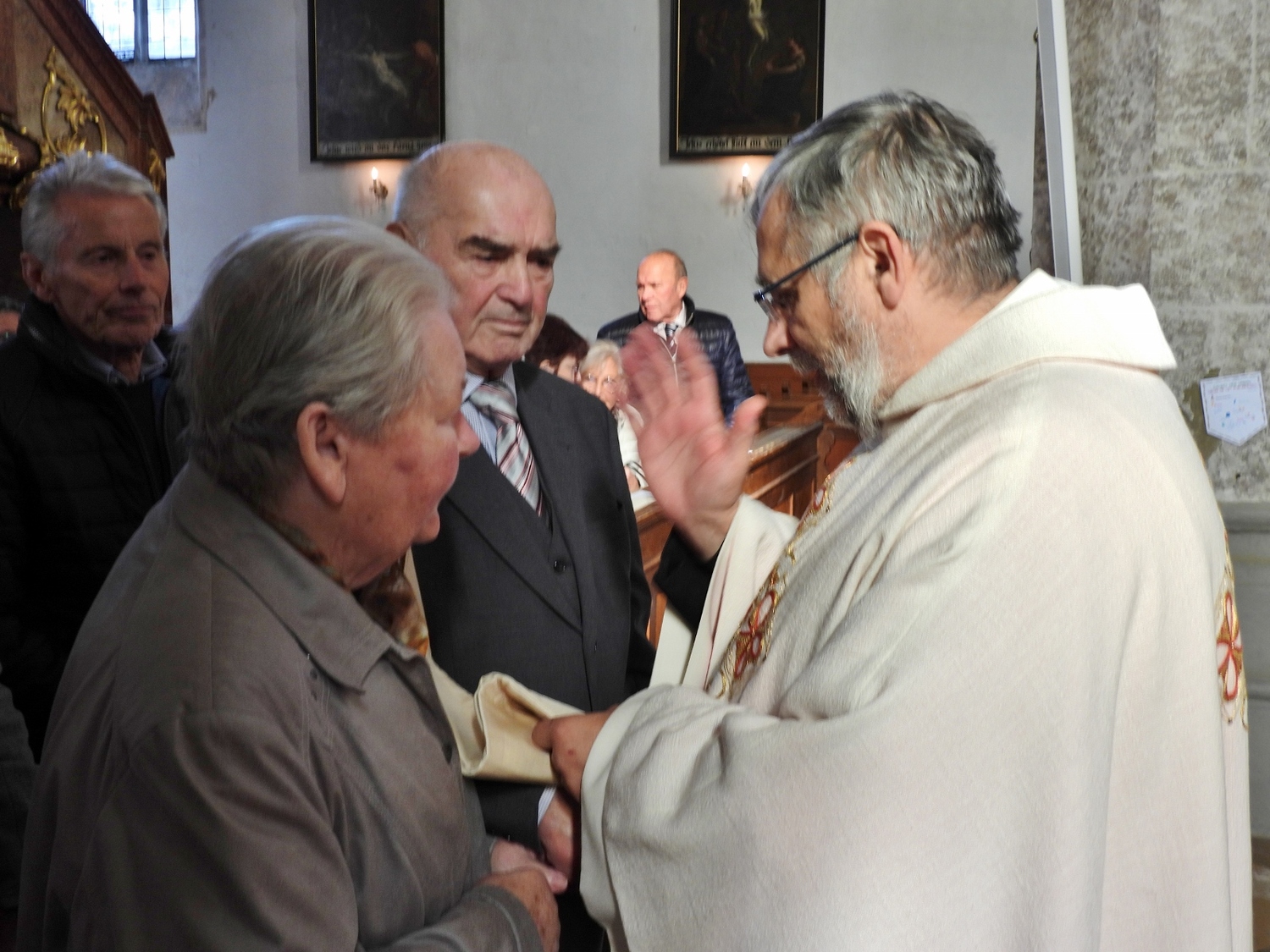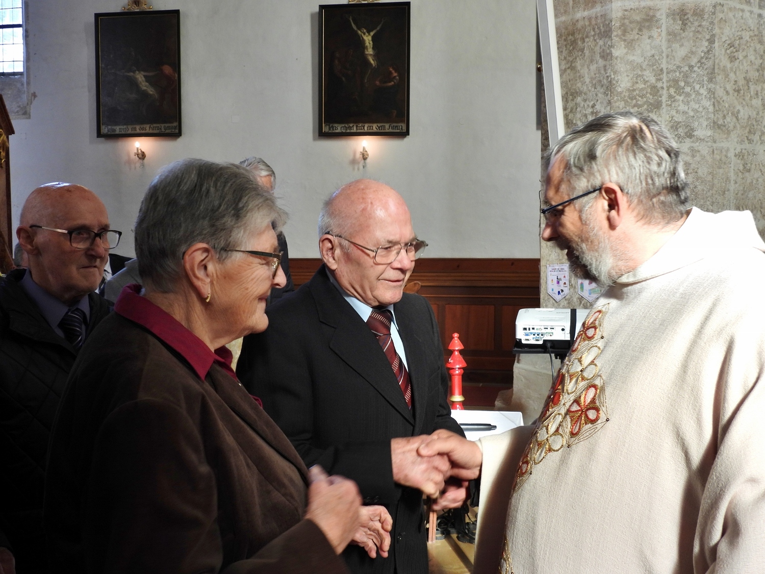 17 Jubelpaare (3 Diamantpaare, 4 Smaragdpaare, 3 Goldpaare und 7 Rubinpaare) hatten sich unter dem Turm versammelt und zogen mit Ministranten und dem Provisor P. Christian Gimbel in die Kirche ein. Die Festmesse wurde vom Pfarrchor mitgestaltet.