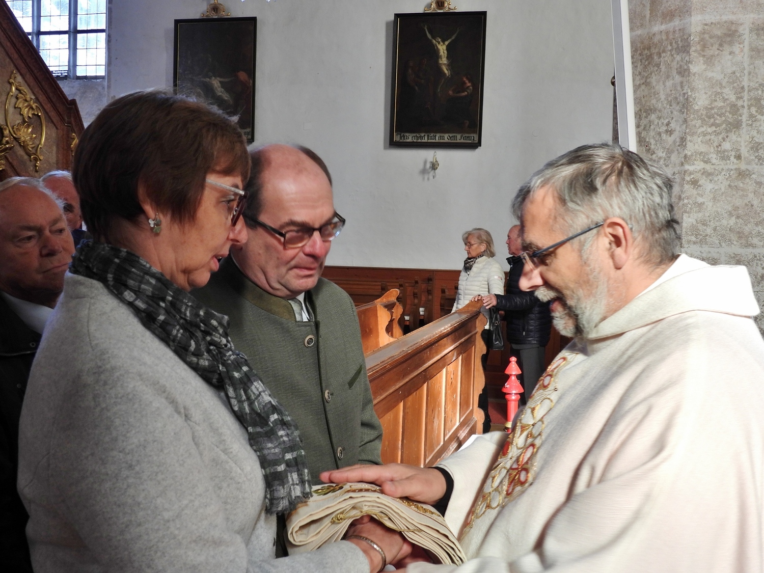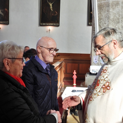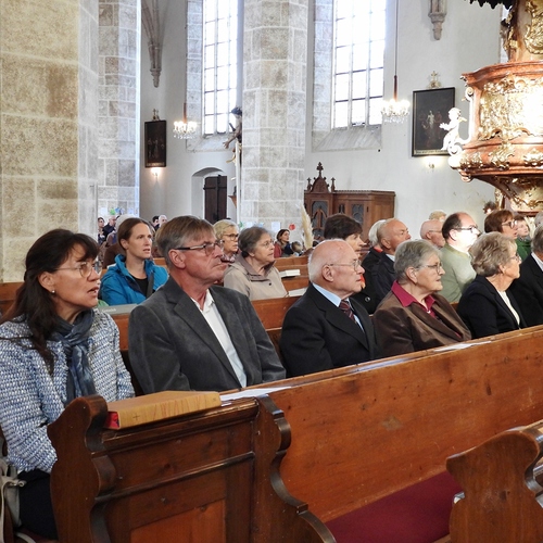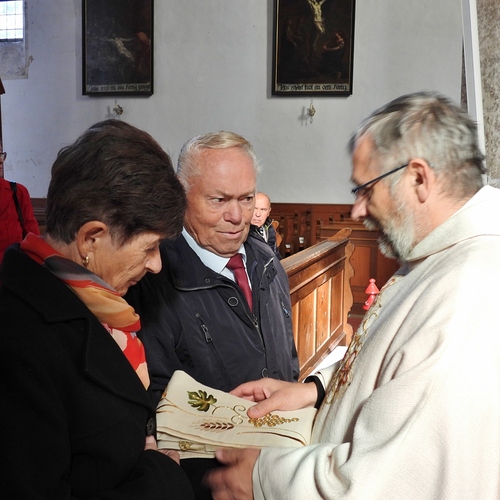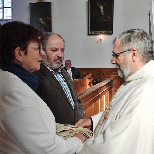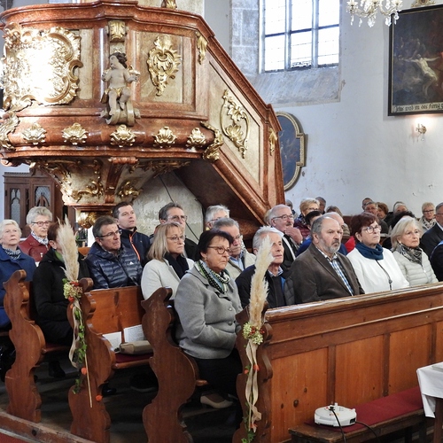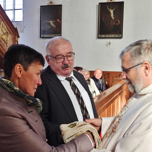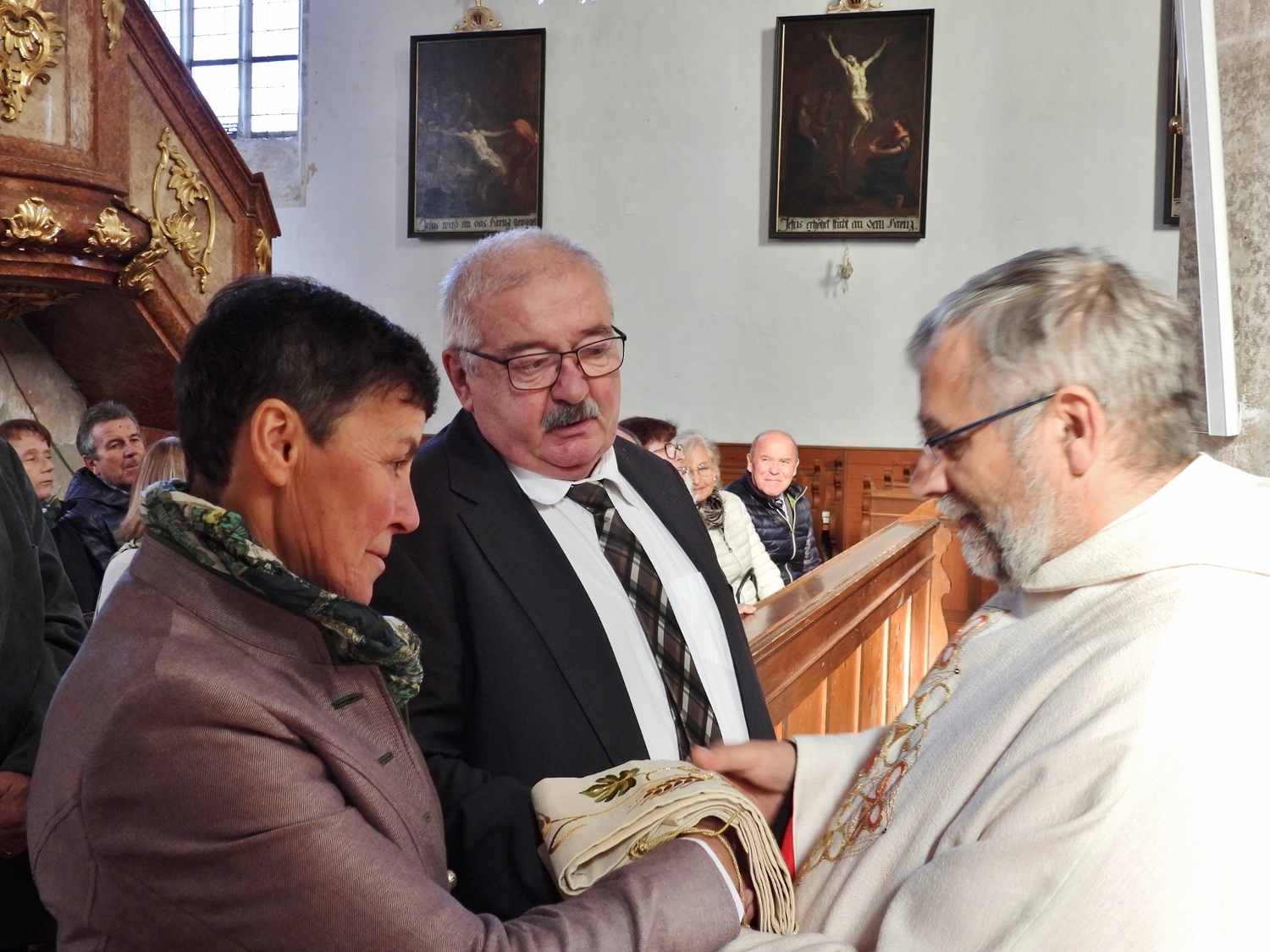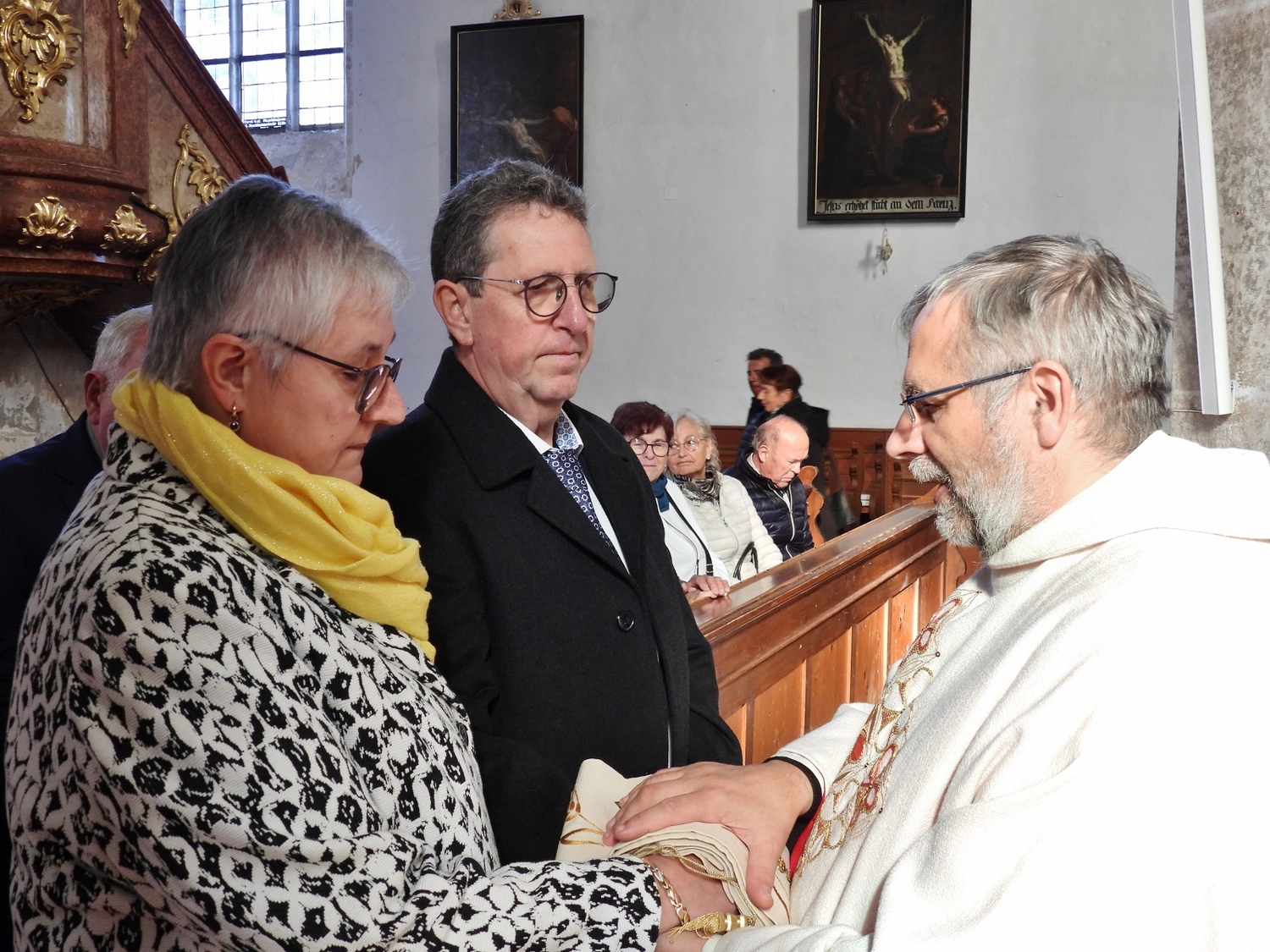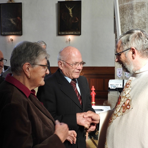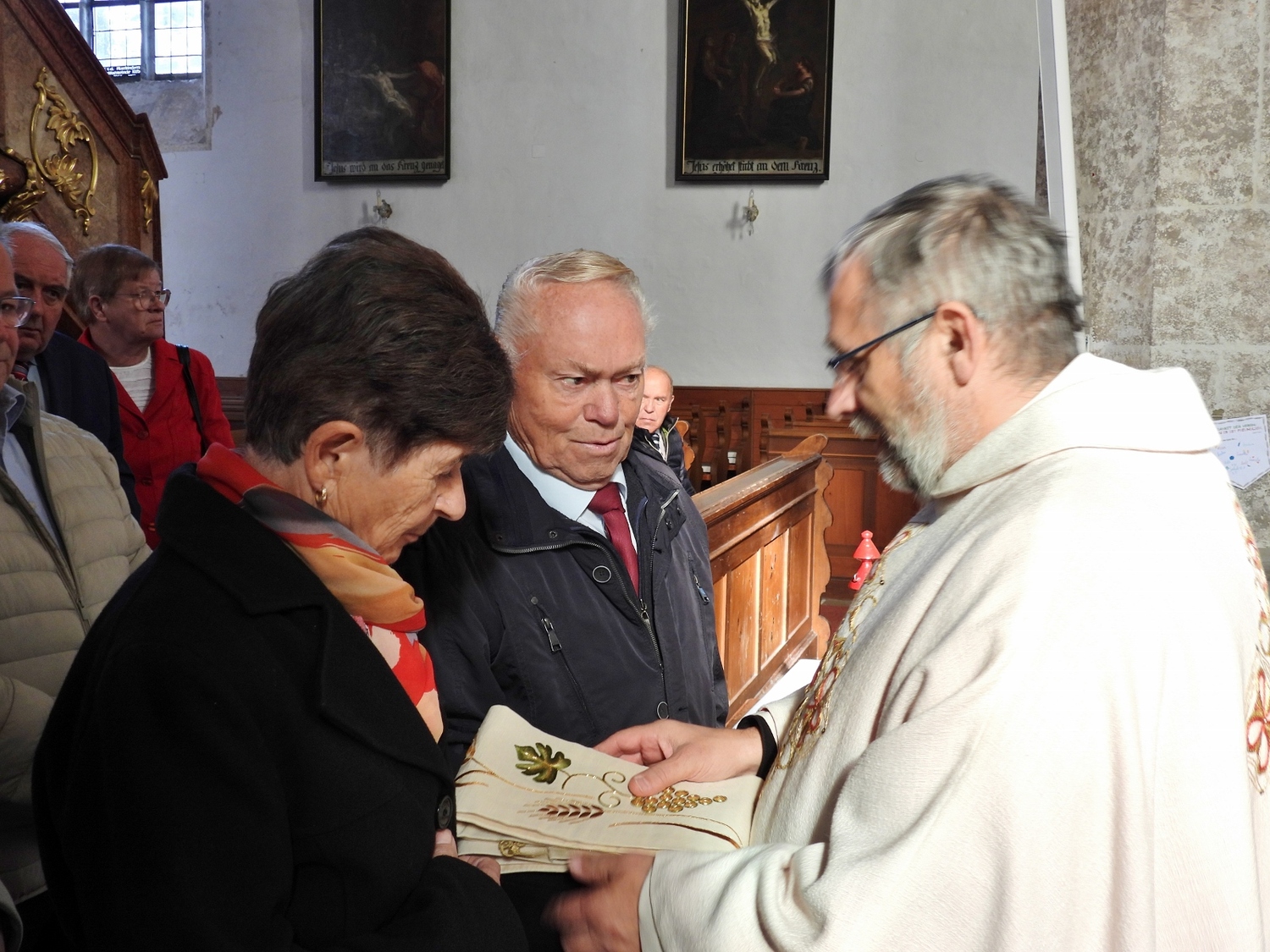 17 Jubelpaare (3 Diamantpaare, 4 Smaragdpaare, 3 Goldpaare und 7 Rubinpaare) hatten sich unter dem Turm versammelt und zogen mit Ministranten und dem Provisor P. Christian Gimbel in die Kirche ein. Die Festmesse wurde vom Pfarrchor mitgestaltet.