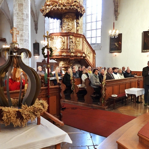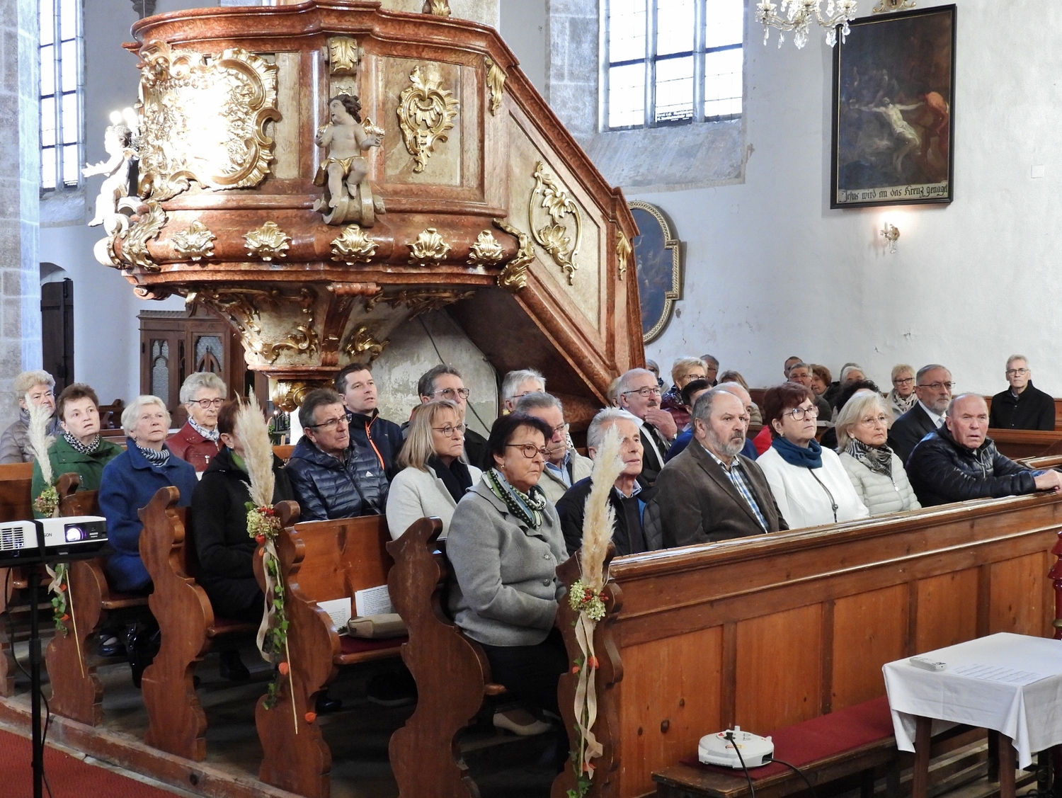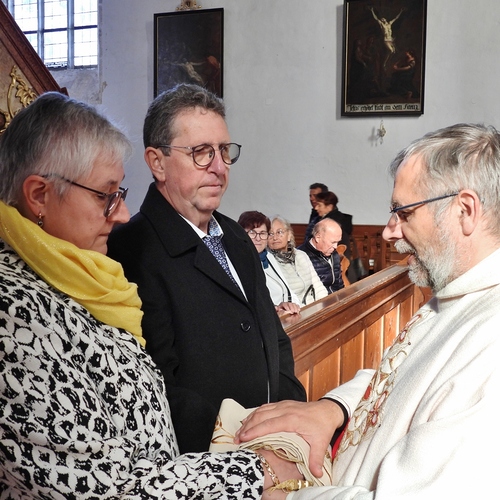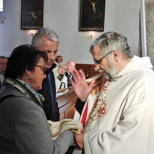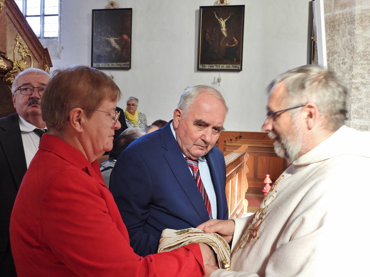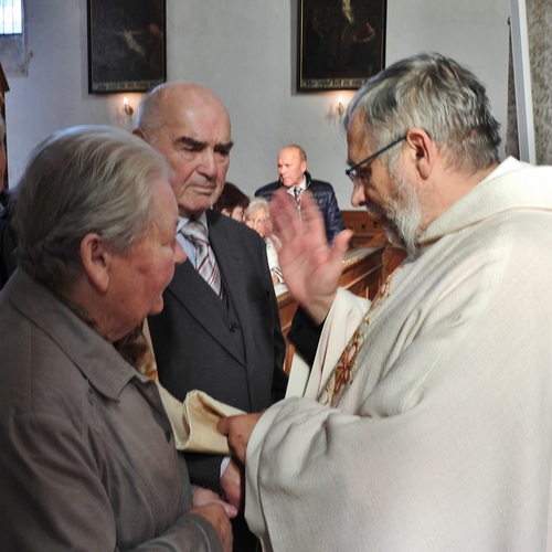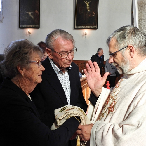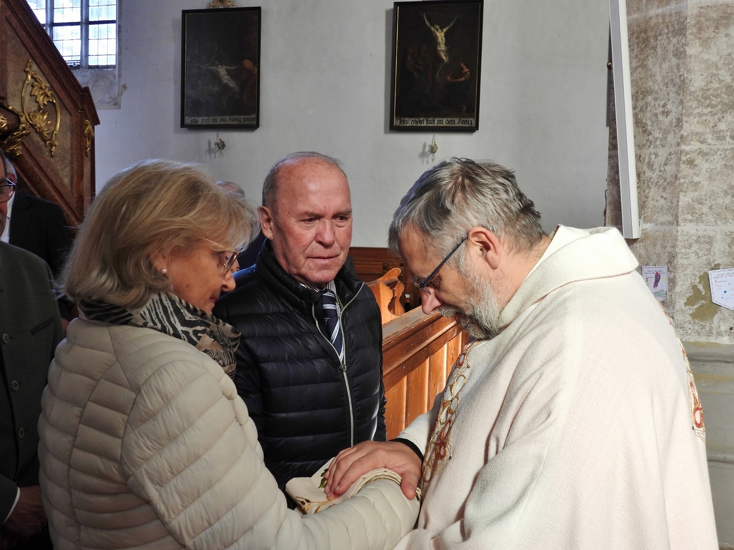 17 Jubelpaare (3 Diamantpaare, 4 Smaragdpaare, 3 Goldpaare und 7 Rubinpaare) hatten sich unter dem Turm versammelt und zogen mit Ministranten und dem Provisor P. Christian Gimbel in die Kirche ein. Die Festmesse wurde vom Pfarrchor mitgestaltet.