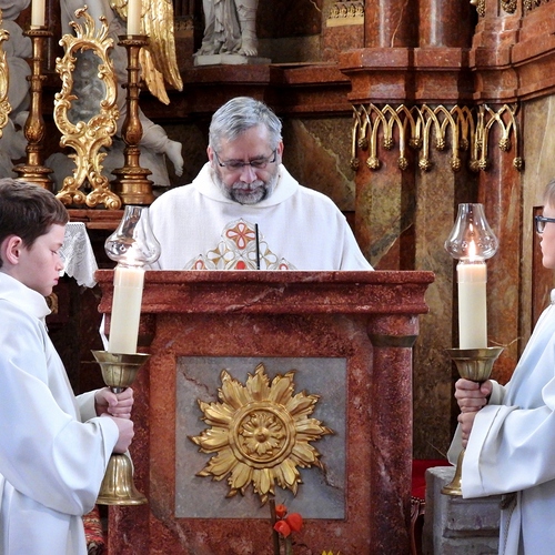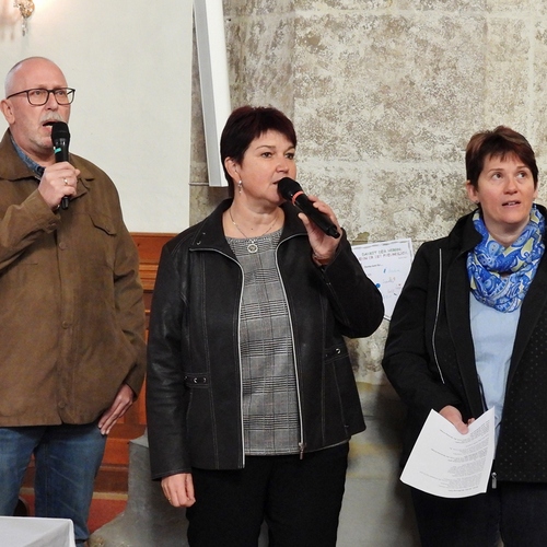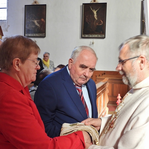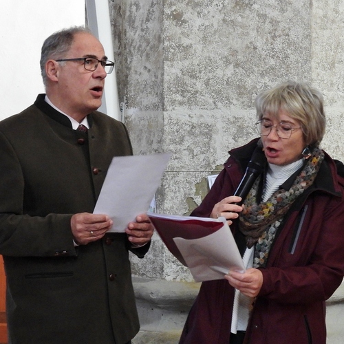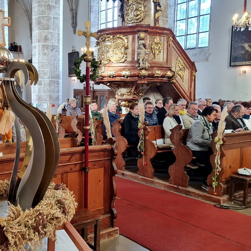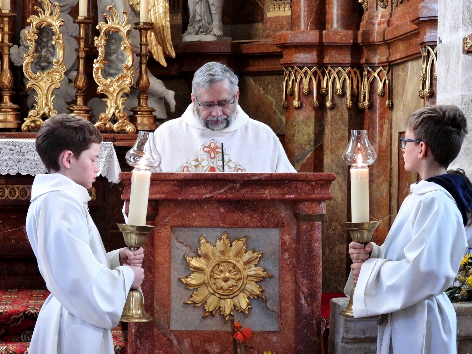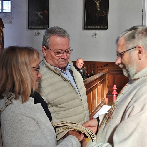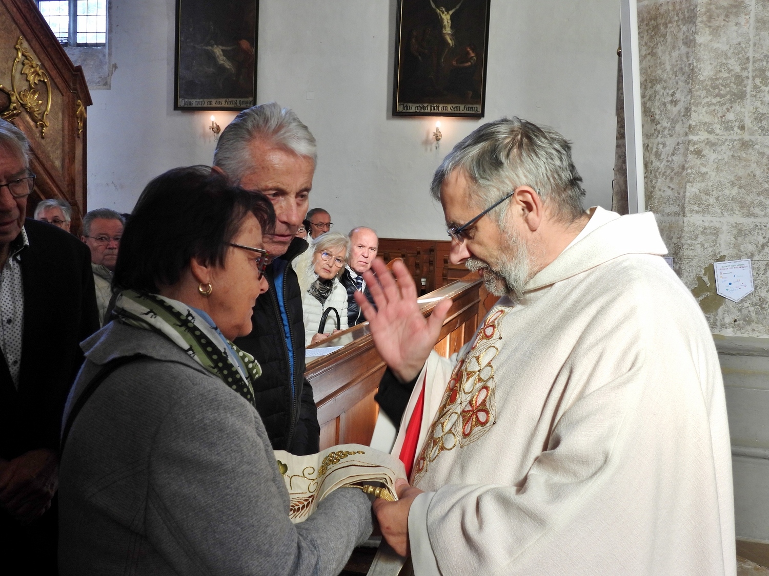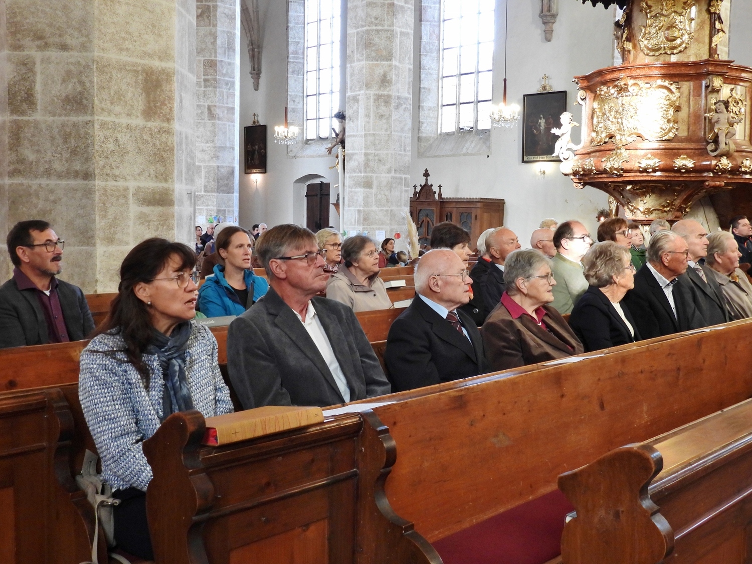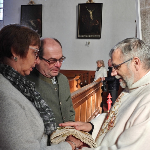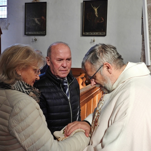 17 Jubelpaare (3 Diamantpaare, 4 Smaragdpaare, 3 Goldpaare und 7 Rubinpaare) hatten sich unter dem Turm versammelt und zogen mit Ministranten und dem Provisor P. Christian Gimbel in die Kirche ein. Die Festmesse wurde vom Pfarrchor mitgestaltet.