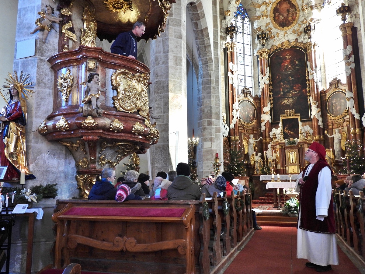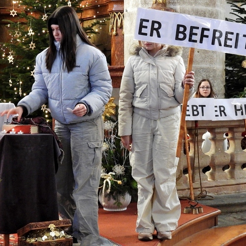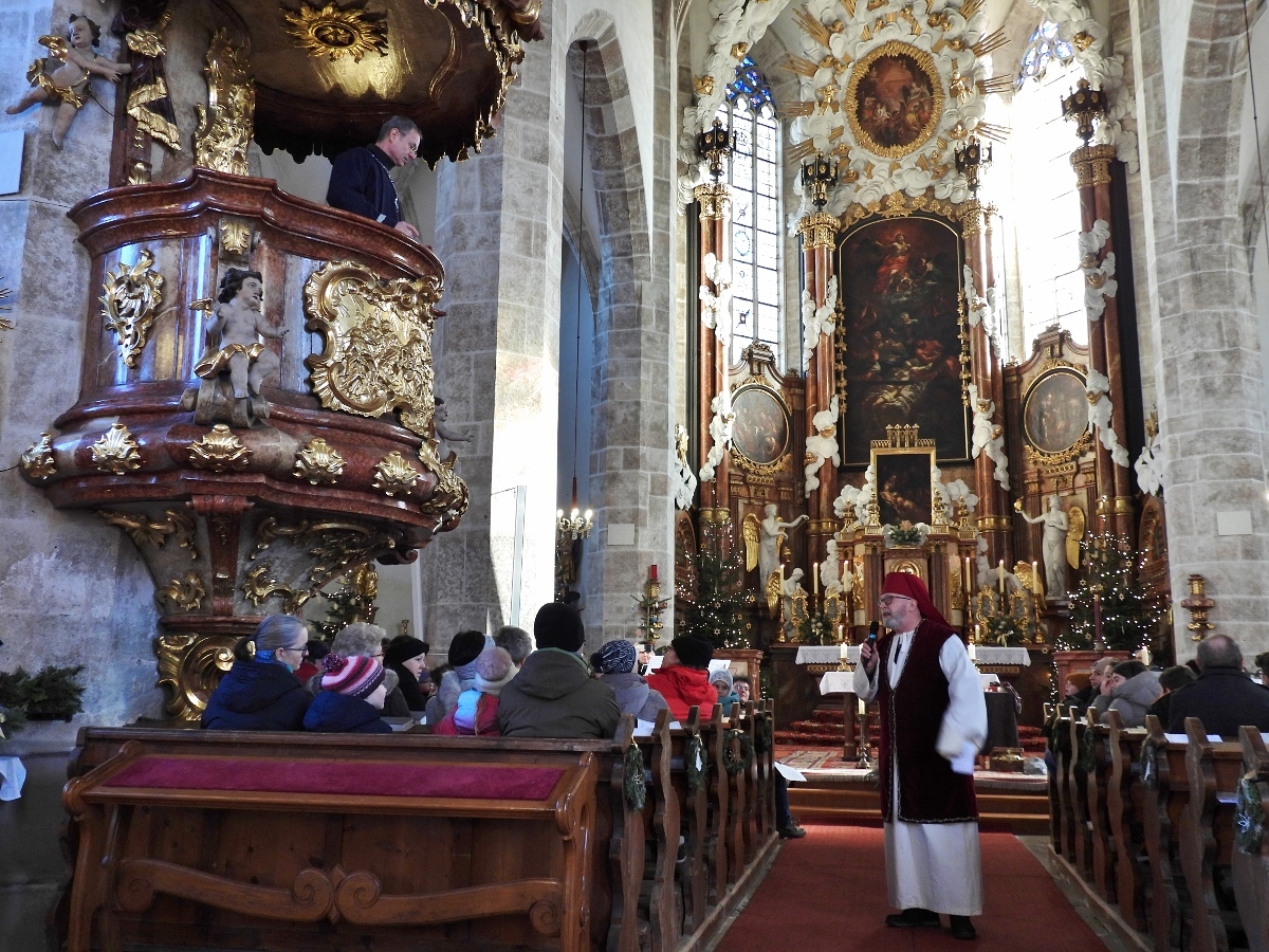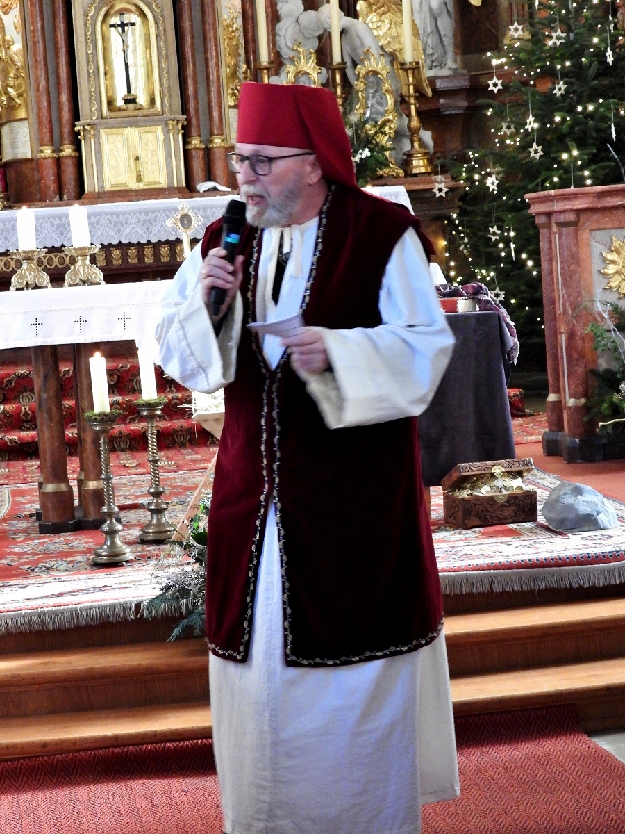 Auch zwei unserer Passionsspieler waren in ihren Rollen gekleidet und sorgten für Spannung und Neugierde, als sie sich vorstellten und alle zur Teilnahme an den Passionsspielen einluden.
