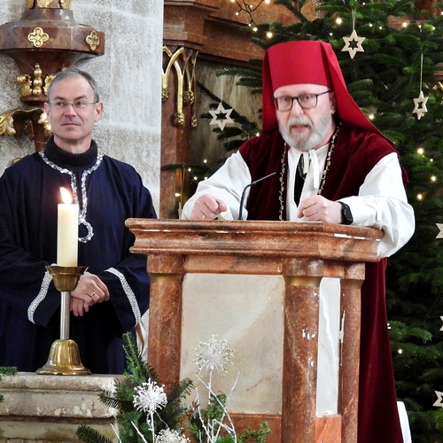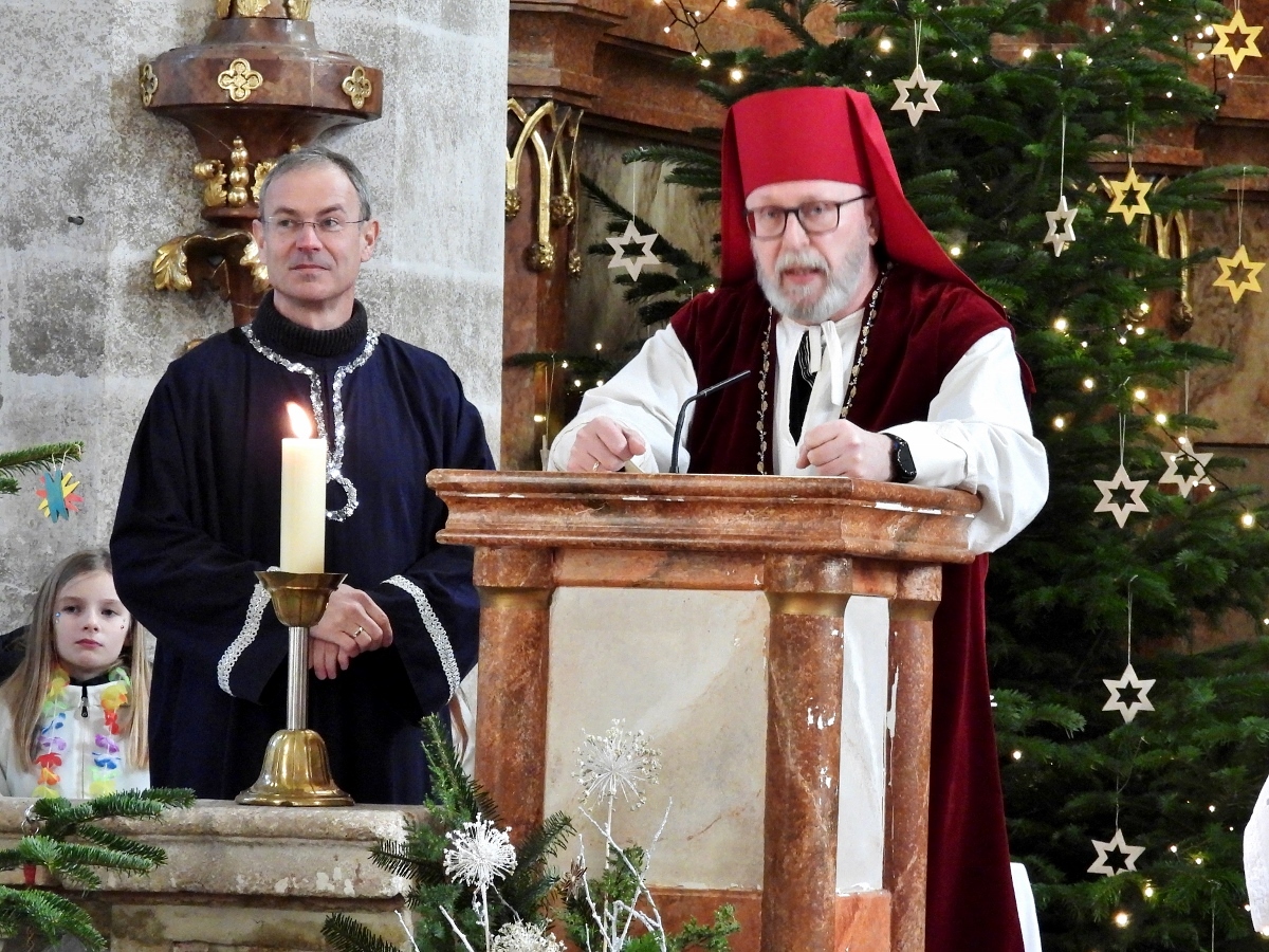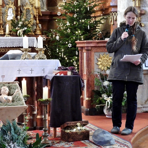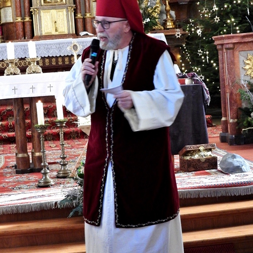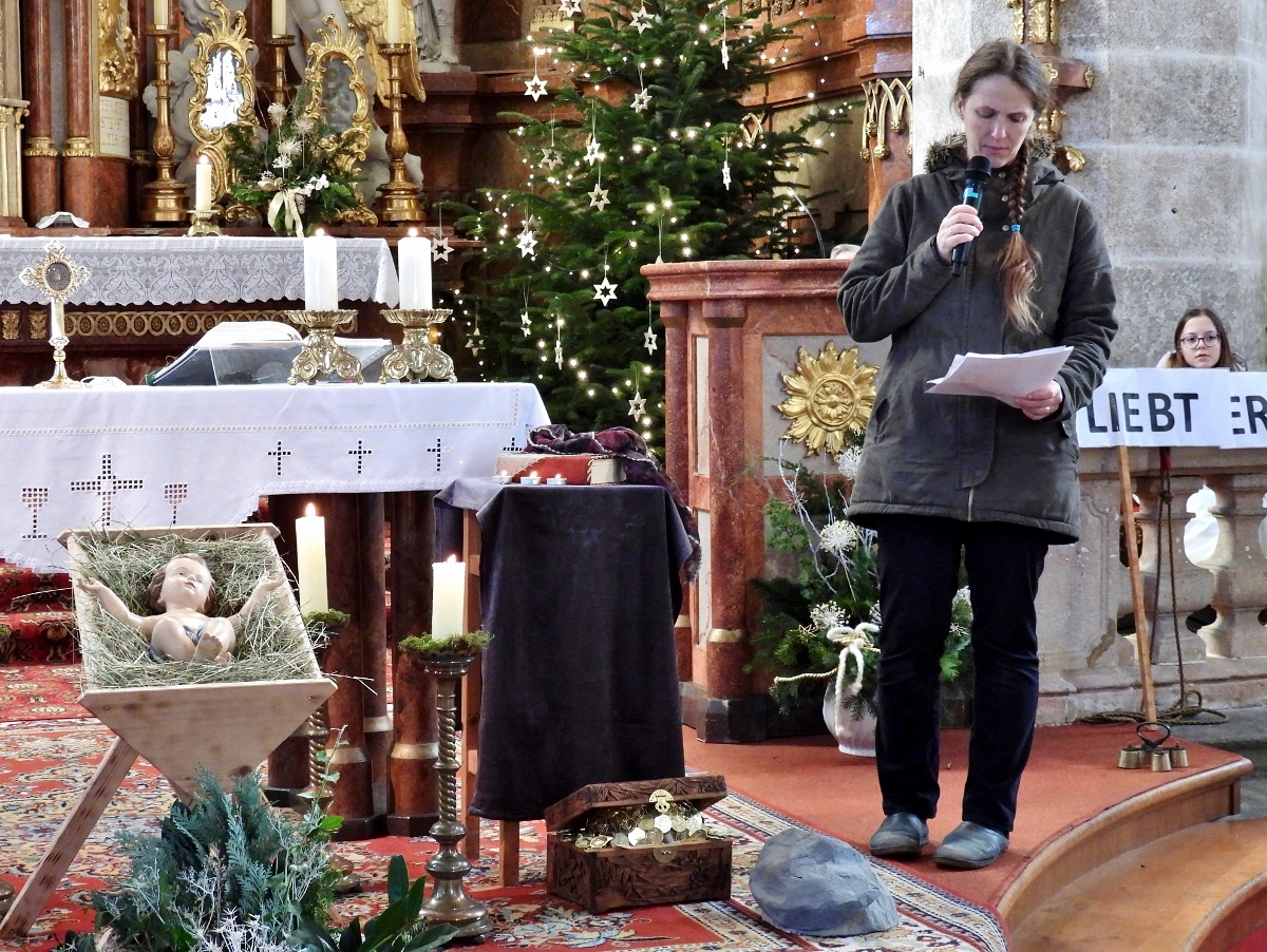 Auch zwei unserer Passionsspieler waren in ihren Rollen gekleidet und sorgten für Spannung und Neugierde, als sie sich vorstellten und alle zur Teilnahme an den Passionsspielen einluden.
