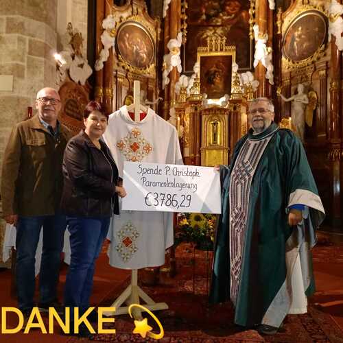 Spendenübergabe für Paramentlagerung Am Sonntag übergaben Sylvia und Bernhard Teufl den Spendenerlös in der Höhe von € 3.786,29 aus dem von ihnen organisierten Nachlassverkauf von P. Christoph Mayrhofer an P. Christian. zu den Bildern: Spendenübergabe für Paramentlagerung