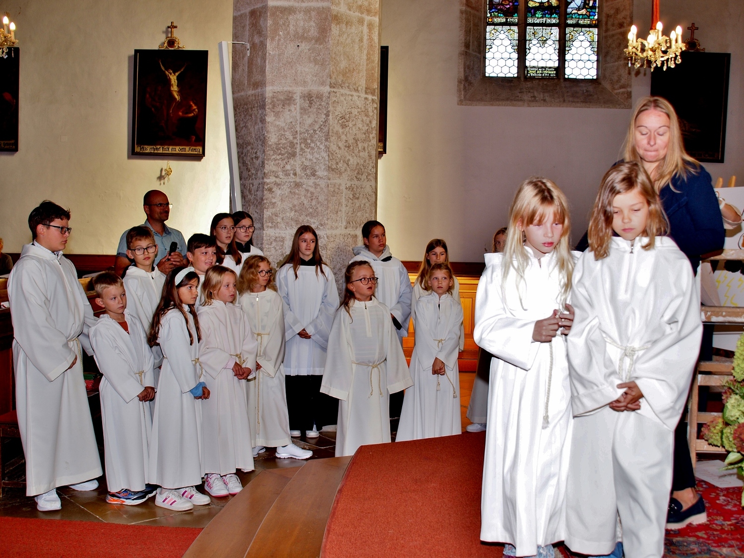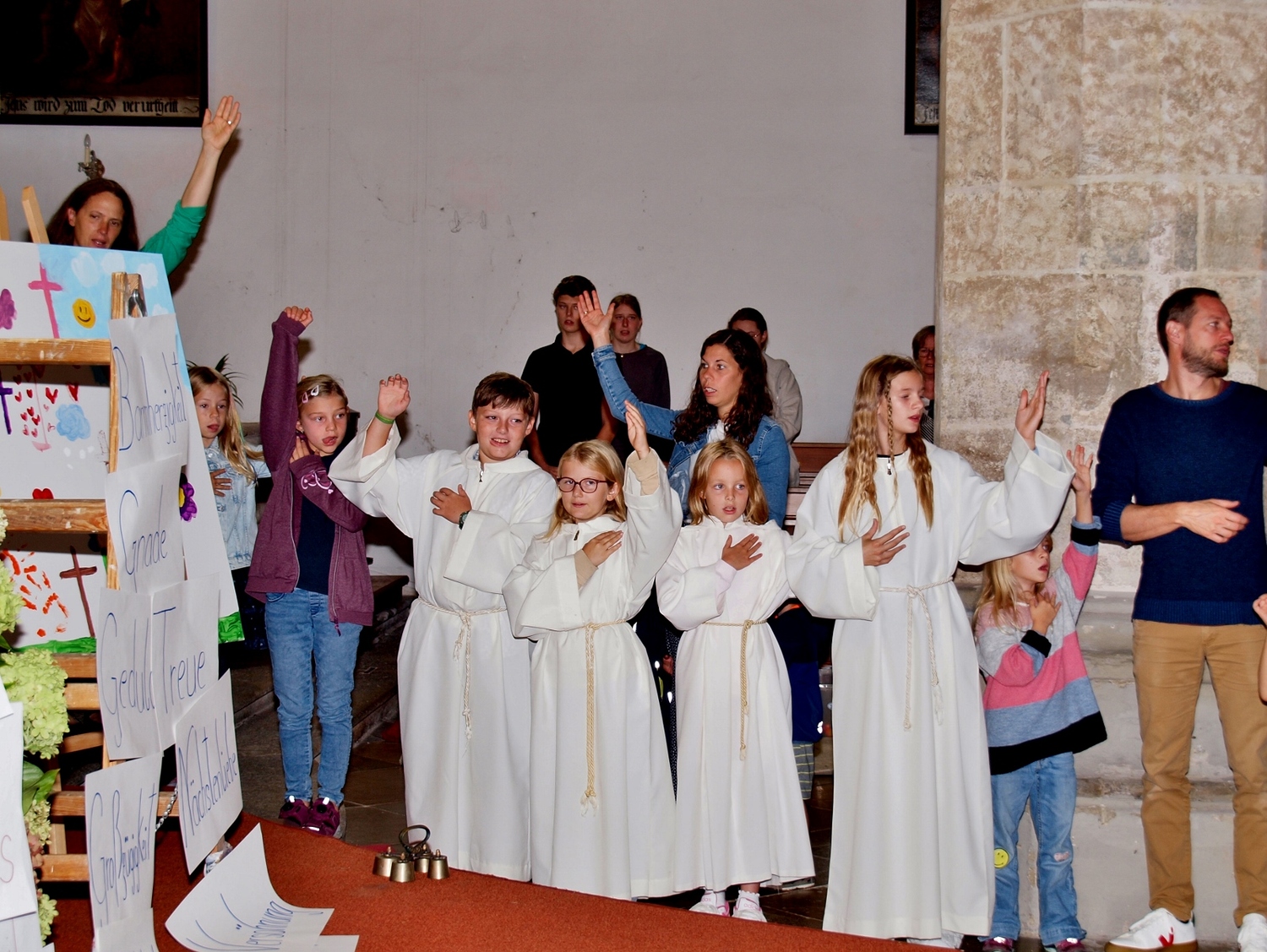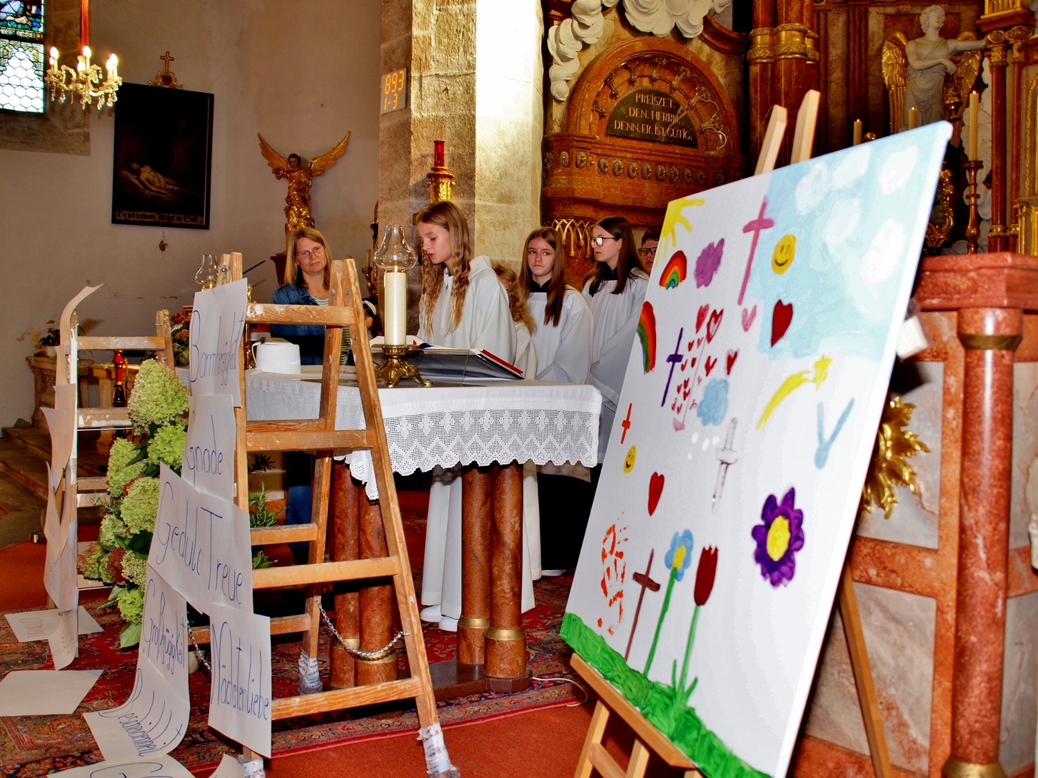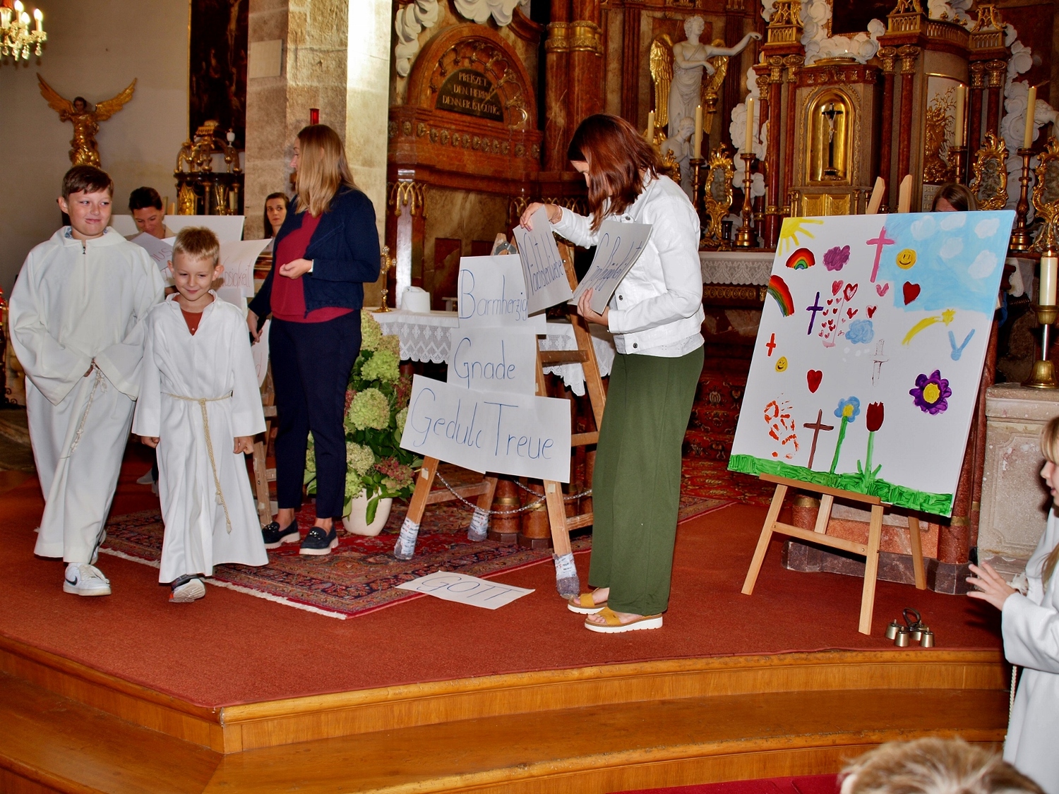 Dabei haben die Ministrantinnen und Ministranten vor der Messe ihre Mini-Stunde genutzt, um Bilder zur Veranschaulichung des Themas zu malen. Auf diesen beiden Bildern haben sie einerseits Gott bzw. das Gute und andererseits „Mammon“ als Symbol für das Schlechte in der Welt gemalt. Während der Messe haben sie sich dann symbolisch jeweils für das Gute und schlussendlich alle für Gott entschieden. Zusätzlich wurden die verdienten (Ober-)Minis von Roman geehrt, die ganz neuen vorgestellt und jene, die ein Jahr dabei waren, von Pater Christian gefragt, ob sie denn den Dienst weiterhin ausüben wollen. Es war eine schöne Familienmesse mit ganz vielen Minis, wo wieder sichtbar wurde, welch wertvolle Arbeit die letzten Jahre in diese tolle Gemeinschaft von jungen Menschen gesteckt wurde.