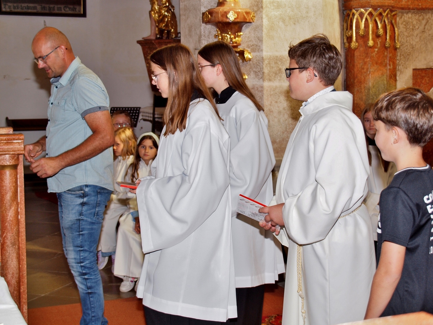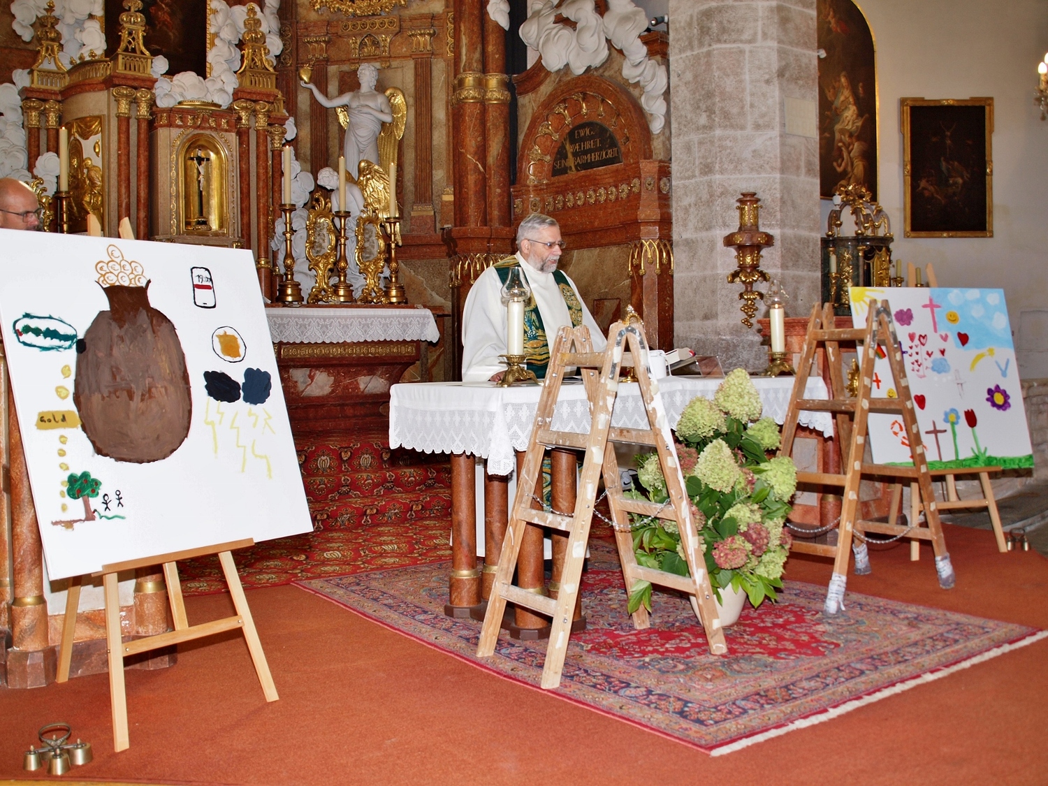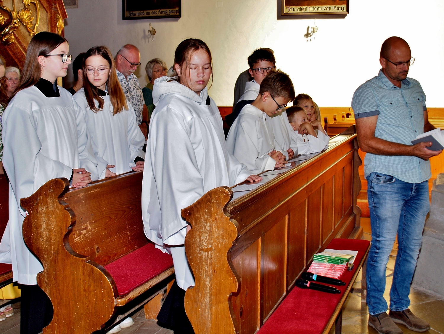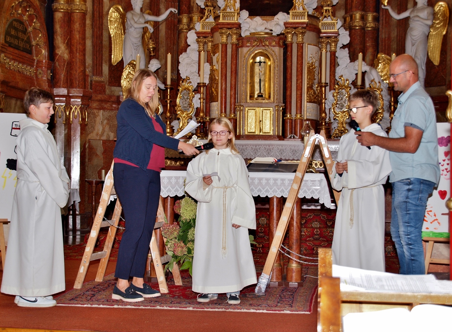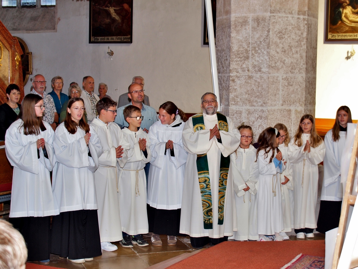 Dabei haben die Ministrantinnen und Ministranten vor der Messe ihre Mini-Stunde genutzt, um Bilder zur Veranschaulichung des Themas zu malen. Auf diesen beiden Bildern haben sie einerseits Gott bzw. das Gute und andererseits „Mammon“ als Symbol für das Schlechte in der Welt gemalt. Während der Messe haben sie sich dann symbolisch jeweils für das Gute und schlussendlich alle für Gott entschieden. Zusätzlich wurden die verdienten (Ober-)Minis von Roman geehrt, die ganz neuen vorgestellt und jene, die ein Jahr dabei waren, von Pater Christian gefragt, ob sie denn den Dienst weiterhin ausüben wollen. Es war eine schöne Familienmesse mit ganz vielen Minis, wo wieder sichtbar wurde, welch wertvolle Arbeit die letzten Jahre in diese tolle Gemeinschaft von jungen Menschen gesteckt wurde.