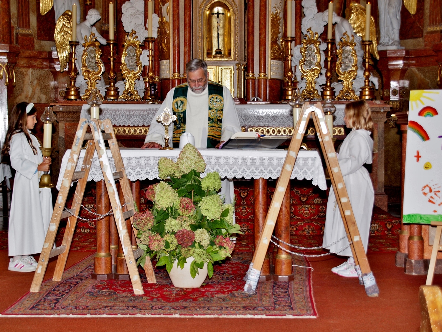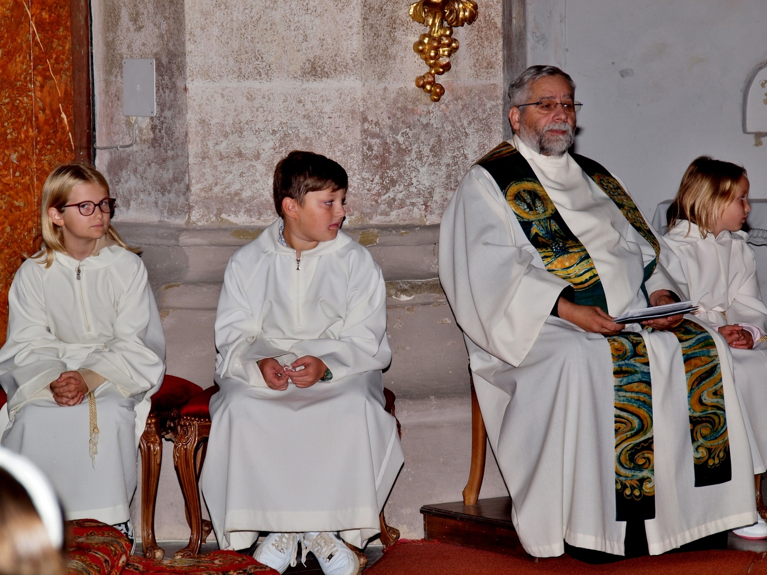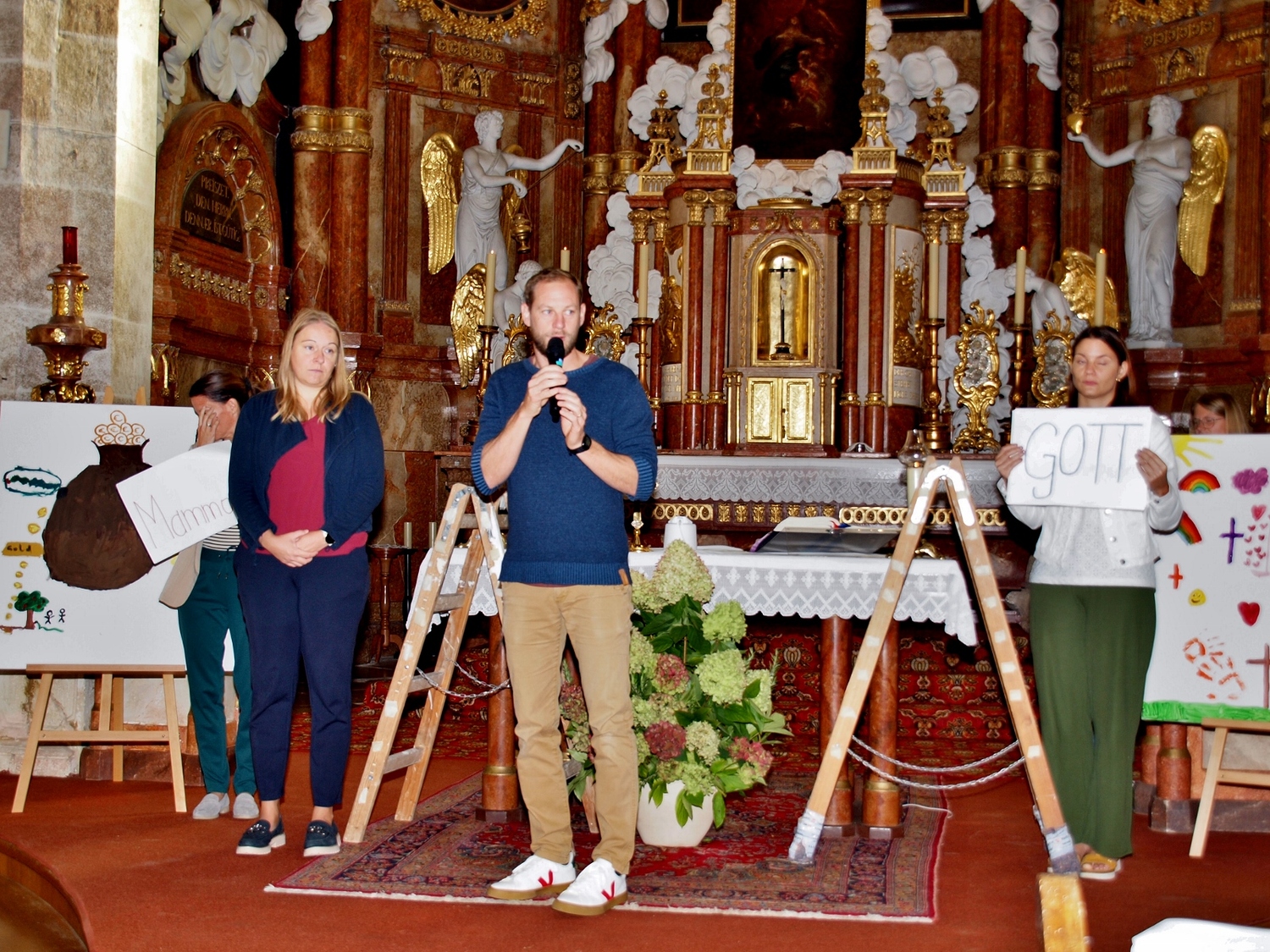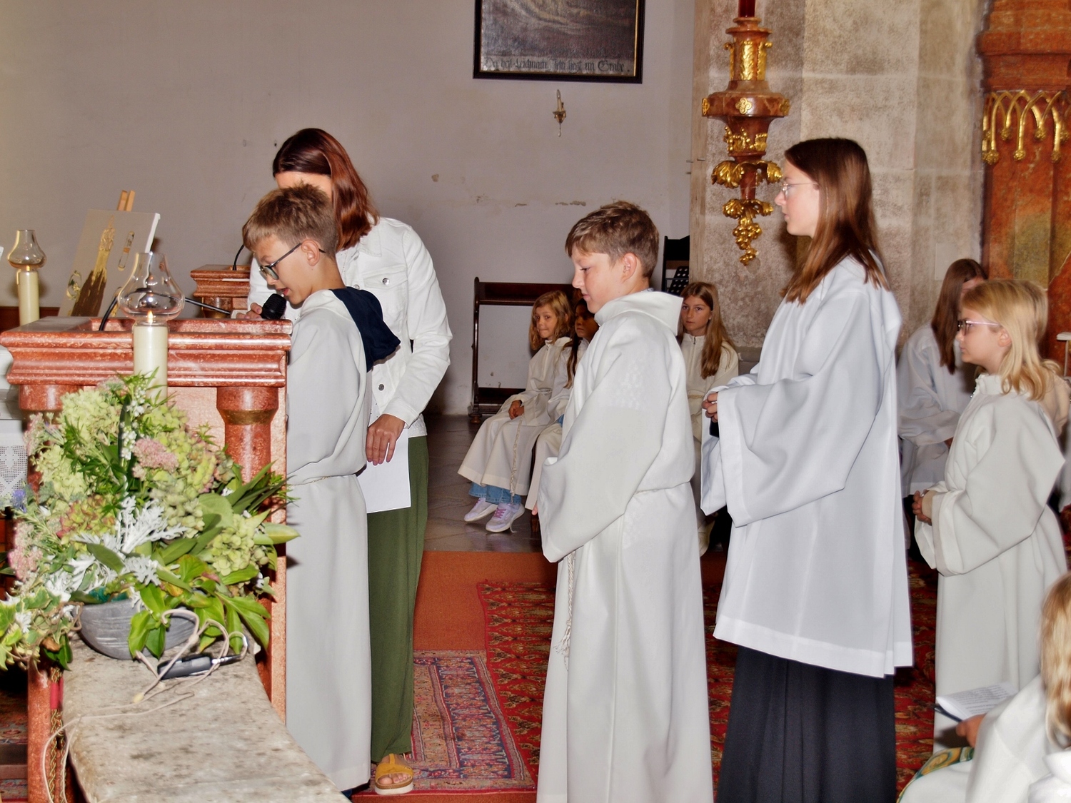 Dabei haben die Ministrantinnen und Ministranten vor der Messe ihre Mini-Stunde genutzt, um Bilder zur Veranschaulichung des Themas zu malen. Auf diesen beiden Bildern haben sie einerseits Gott bzw. das Gute und andererseits „Mammon“ als Symbol für das Schlechte in der Welt gemalt. Während der Messe haben sie sich dann symbolisch jeweils für das Gute und schlussendlich alle für Gott entschieden. Zusätzlich wurden die verdienten (Ober-)Minis von Roman geehrt, die ganz neuen vorgestellt und jene, die ein Jahr dabei waren, von Pater Christian gefragt, ob sie denn den Dienst weiterhin ausüben wollen. Es war eine schöne Familienmesse mit ganz vielen Minis, wo wieder sichtbar wurde, welch wertvolle Arbeit die letzten Jahre in diese tolle Gemeinschaft von jungen Menschen gesteckt wurde.