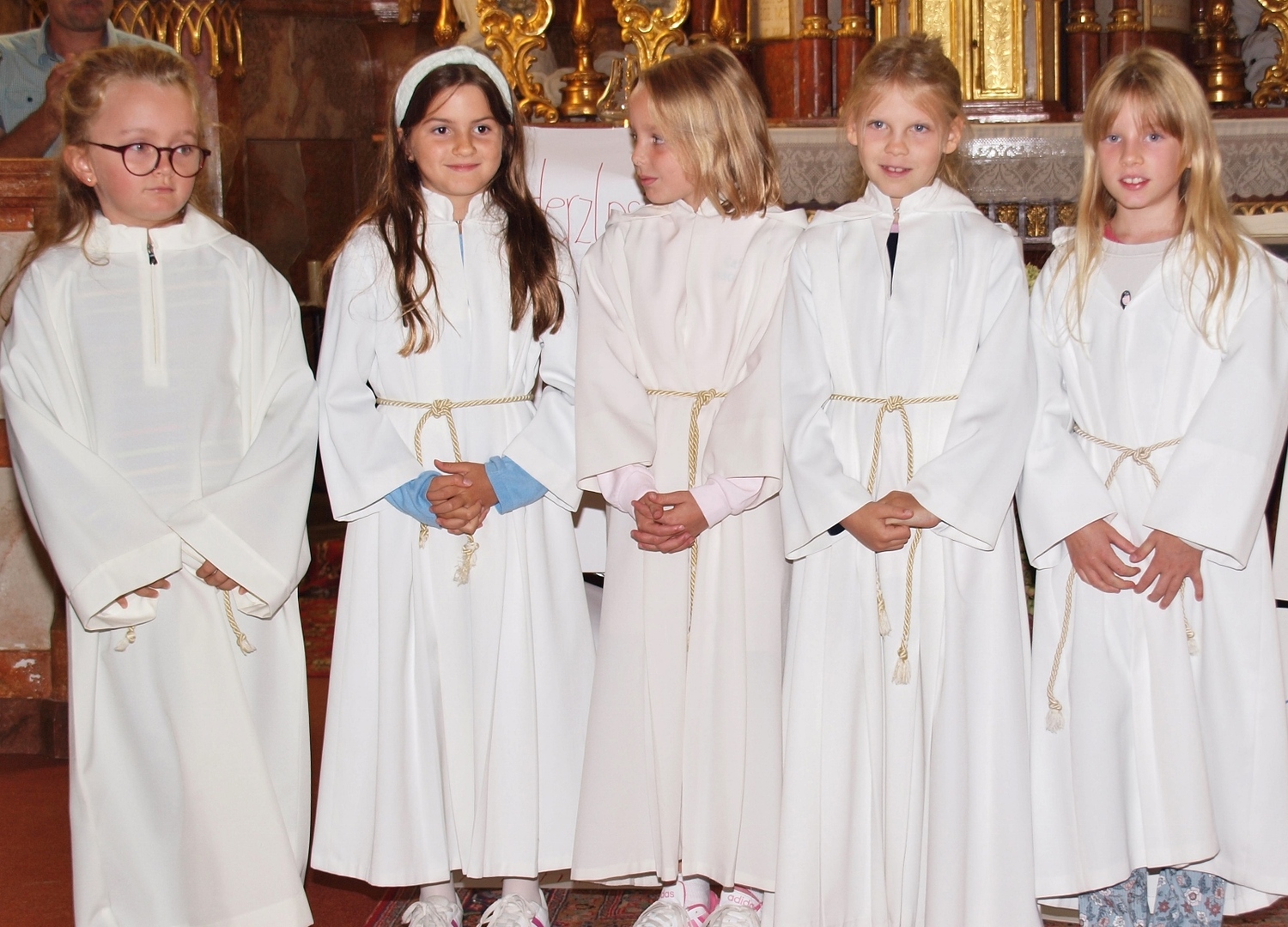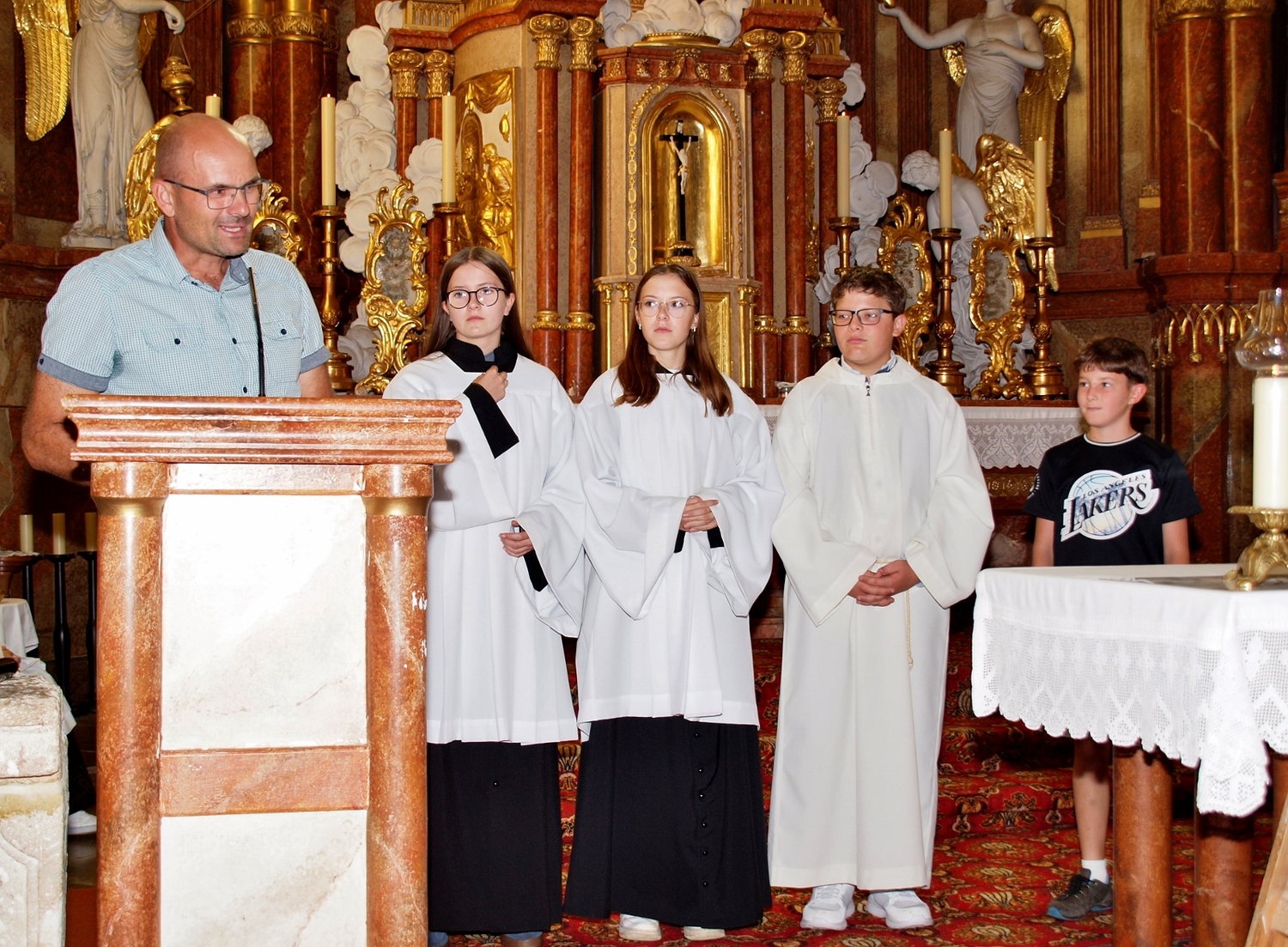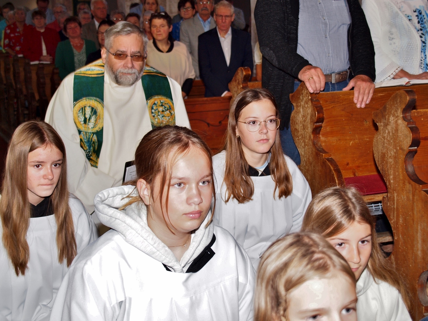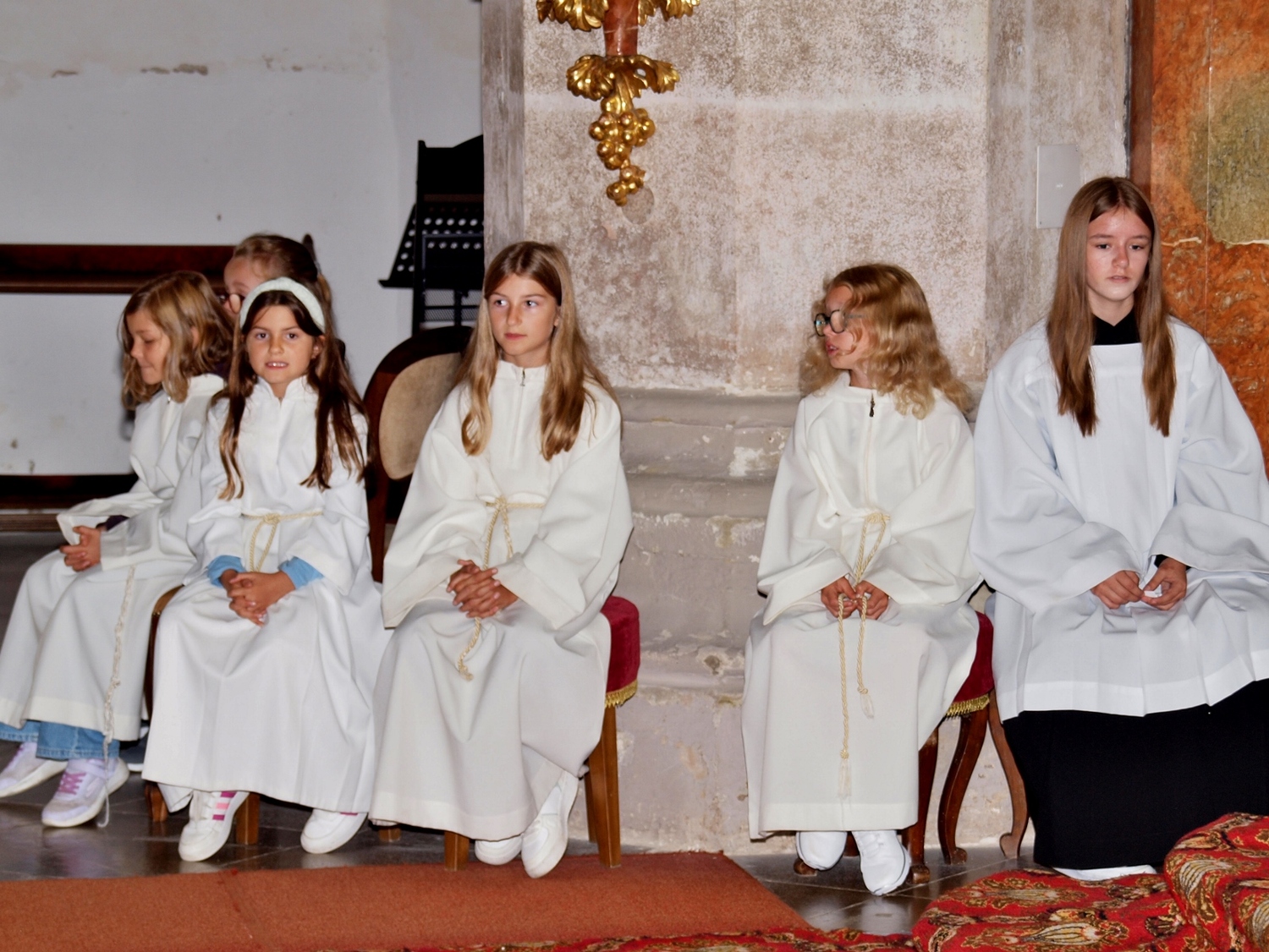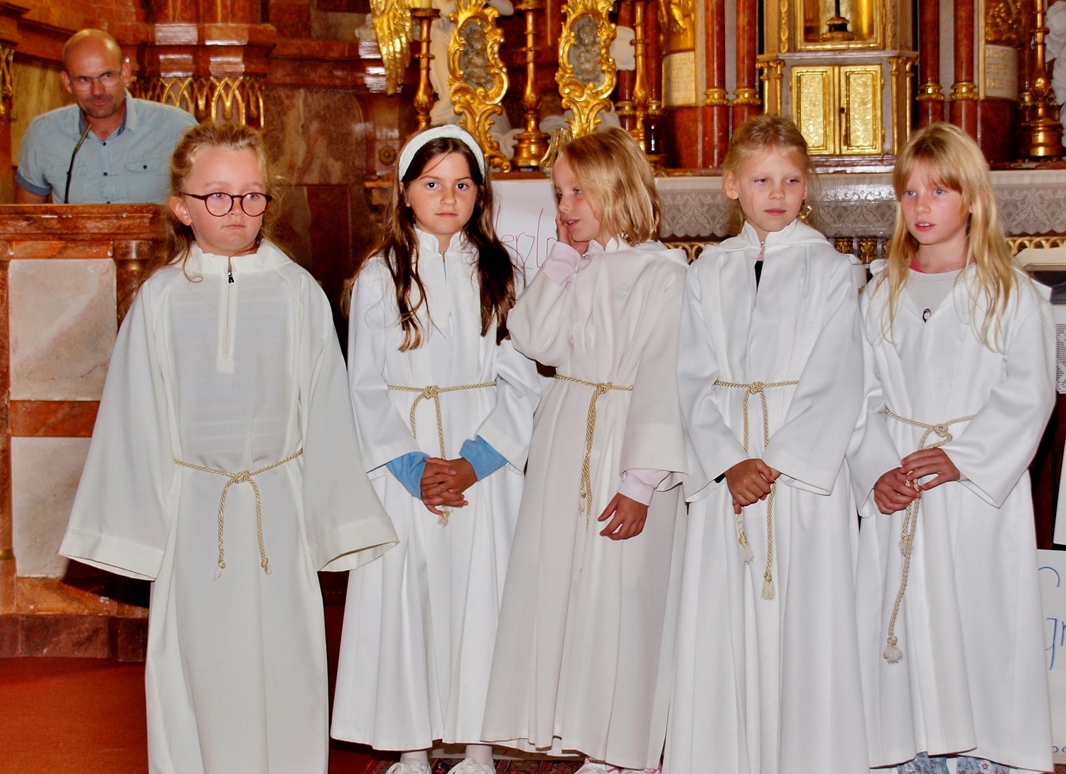 Dabei haben die Ministrantinnen und Ministranten vor der Messe ihre Mini-Stunde genutzt, um Bilder zur Veranschaulichung des Themas zu malen. Auf diesen beiden Bildern haben sie einerseits Gott bzw. das Gute und andererseits „Mammon“ als Symbol für das Schlechte in der Welt gemalt. Während der Messe haben sie sich dann symbolisch jeweils für das Gute und schlussendlich alle für Gott entschieden. Zusätzlich wurden die verdienten (Ober-)Minis von Roman geehrt, die ganz neuen vorgestellt und jene, die ein Jahr dabei waren, von Pater Christian gefragt, ob sie denn den Dienst weiterhin ausüben wollen. Es war eine schöne Familienmesse mit ganz vielen Minis, wo wieder sichtbar wurde, welch wertvolle Arbeit die letzten Jahre in diese tolle Gemeinschaft von jungen Menschen gesteckt wurde.