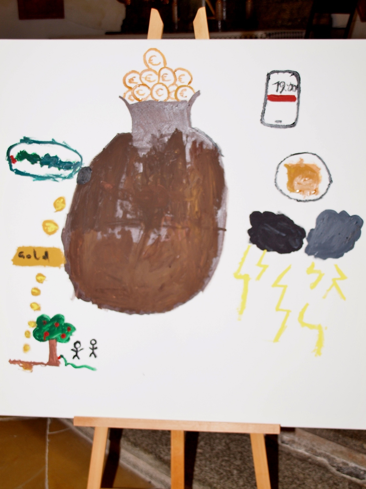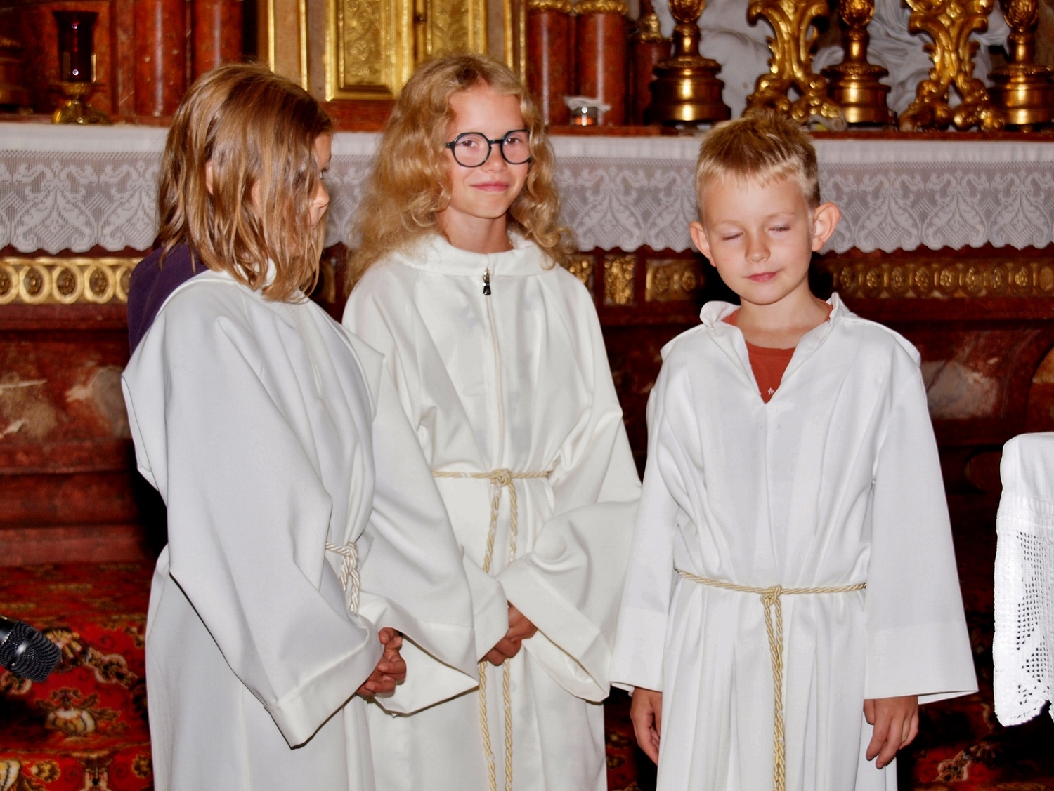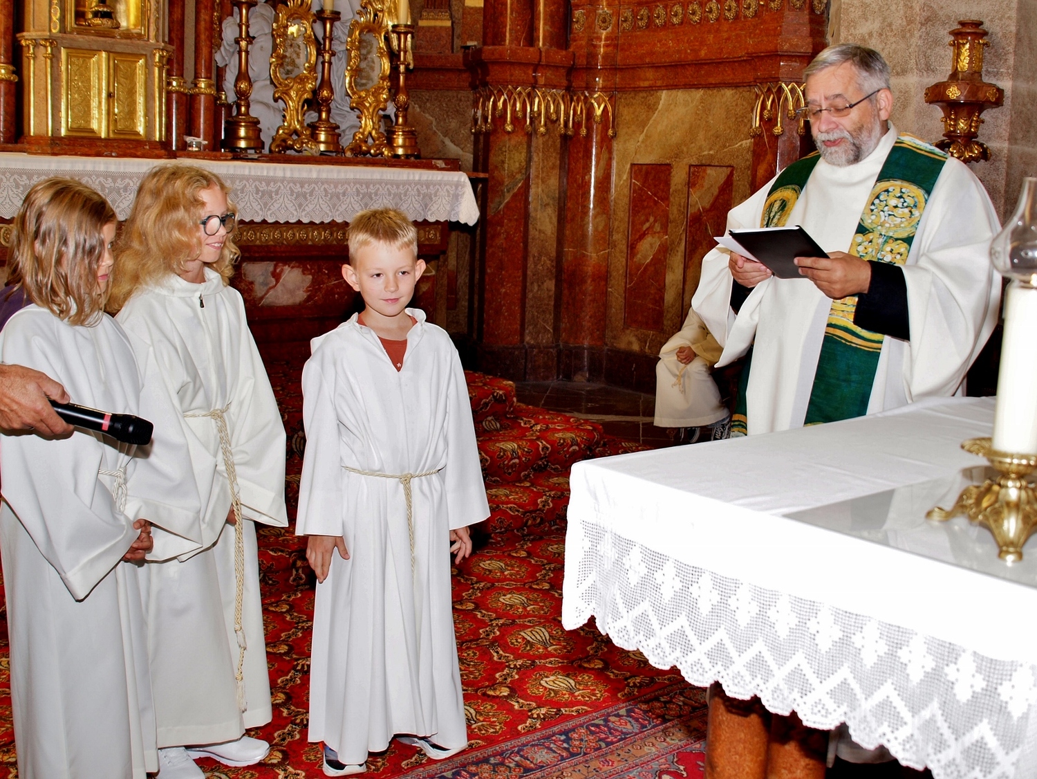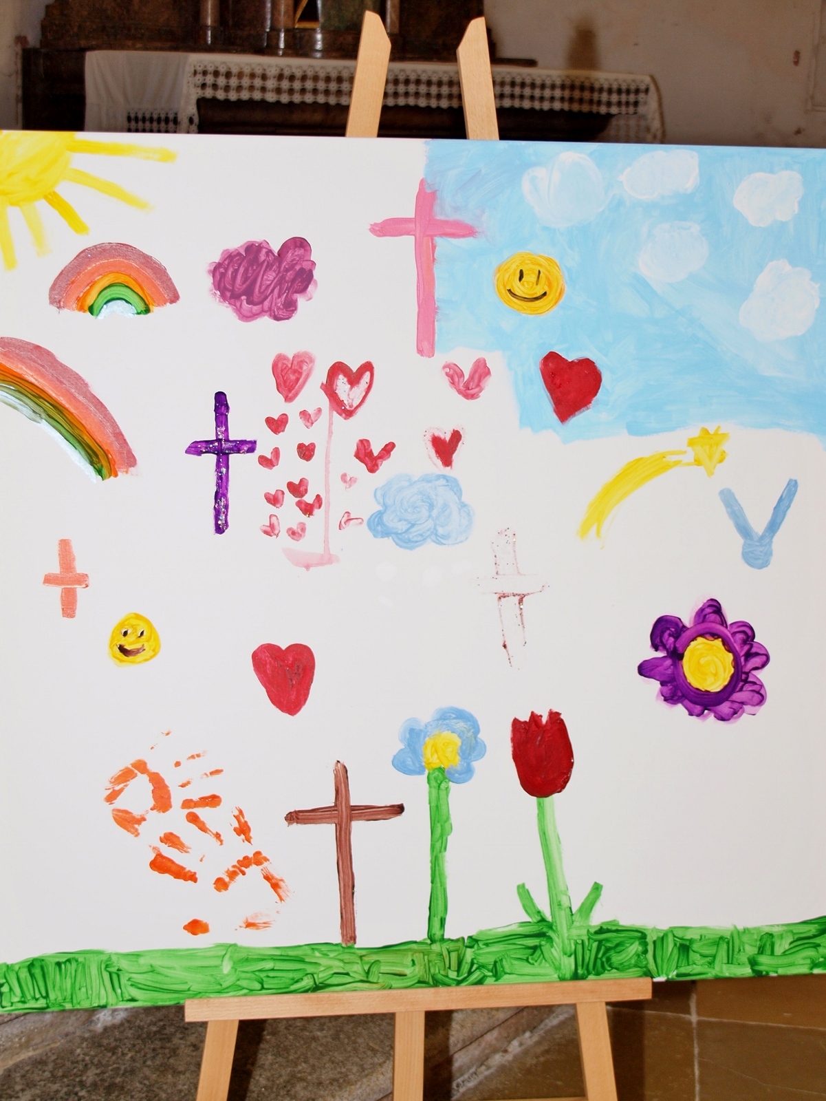 Dabei haben die Ministrantinnen und Ministranten vor der Messe ihre Mini-Stunde genutzt, um Bilder zur Veranschaulichung des Themas zu malen. Auf diesen beiden Bildern haben sie einerseits Gott bzw. das Gute und andererseits „Mammon“ als Symbol für das Schlechte in der Welt gemalt. Während der Messe haben sie sich dann symbolisch jeweils für das Gute und schlussendlich alle für Gott entschieden. Zusätzlich wurden die verdienten (Ober-)Minis von Roman geehrt, die ganz neuen vorgestellt und jene, die ein Jahr dabei waren, von Pater Christian gefragt, ob sie denn den Dienst weiterhin ausüben wollen. Es war eine schöne Familienmesse mit ganz vielen Minis, wo wieder sichtbar wurde, welch wertvolle Arbeit die letzten Jahre in diese tolle Gemeinschaft von jungen Menschen gesteckt wurde.