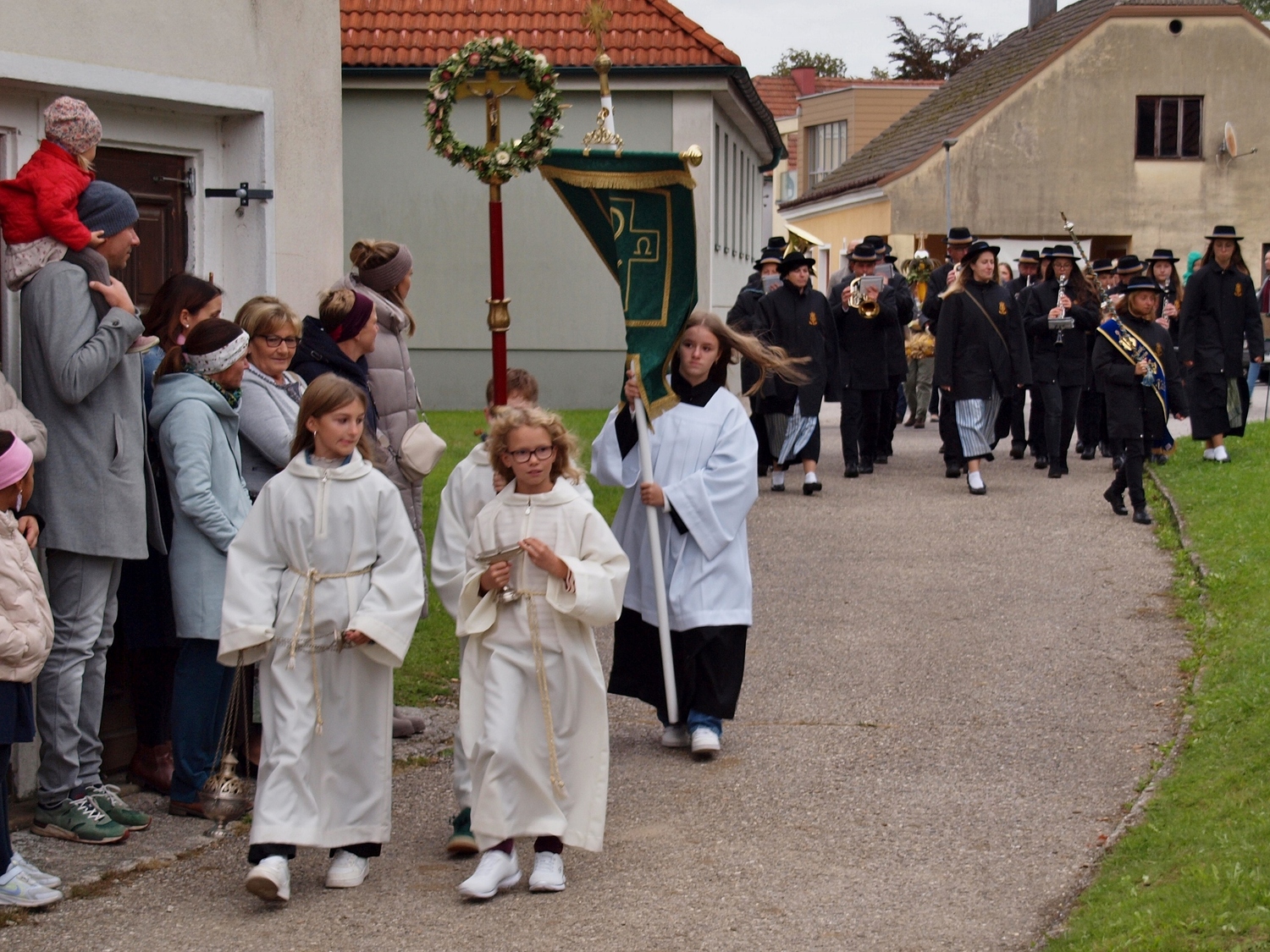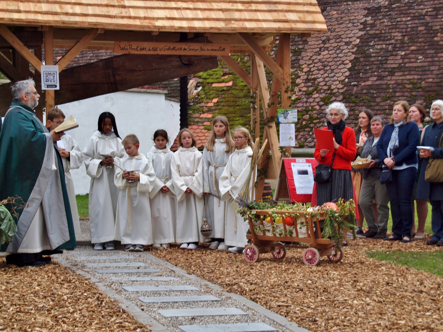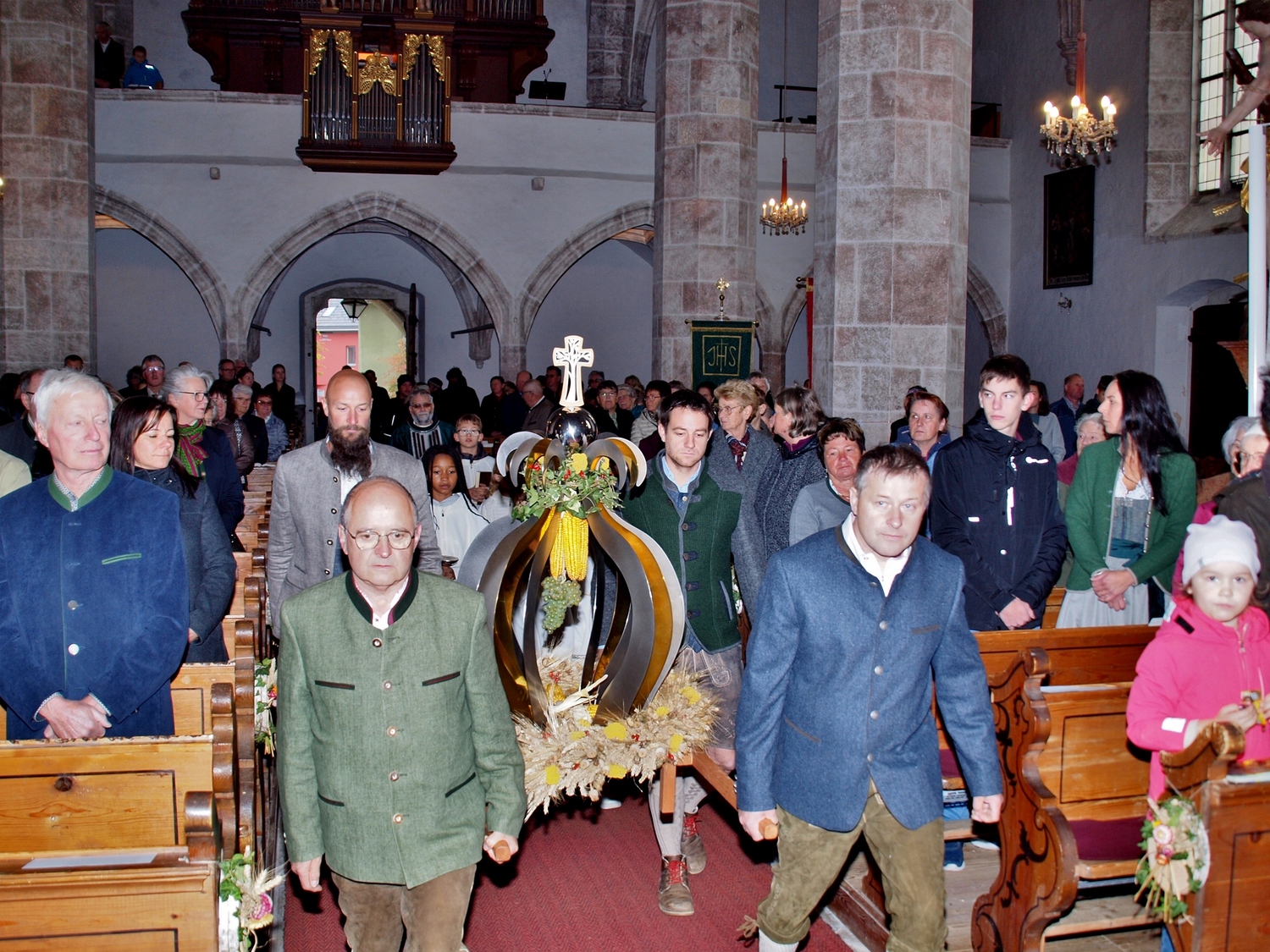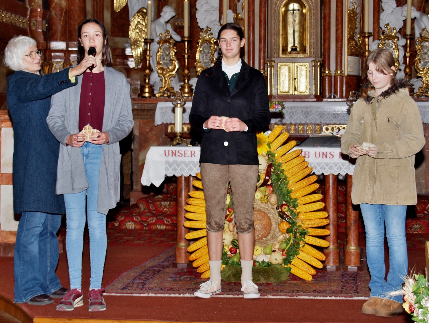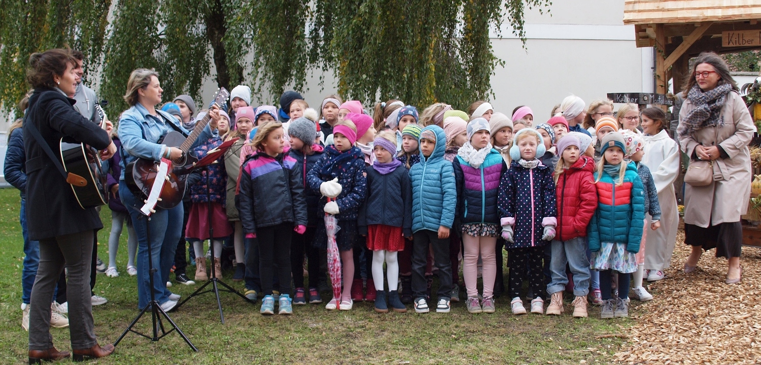 Die Vorbereitung dazu hatten dankenswerterweise die Bewohnerinnen und Bewohner von Ranzenbach, Ruttersdorf, Graben bei Kilb und Niederhofen übernommen. Begleitet von der Kilber Blasmusikkapelle, den Ministranten und P. Christian Gimbel zogen sie vom Pfarrtreff zur von der Landjugend beim Projektmarathon wiederhergestellten Mostpresse. Diese und auch die Erntekrone wurden von P. Christian gesegnet und der Volksschulchor umrahmte diese Segnung. Anschließend zogen alle in die festlich geschmückte Pfarrkirche. Der Festgottesdienst wurde von den oben genannten Bewohnerinnen und Bewohnern mitgestaltet, und nach der Messe wurden in Anlehnung an das Evangelium von der Brotvermehrung Brotstücke an die Bevölkerung verteilt.