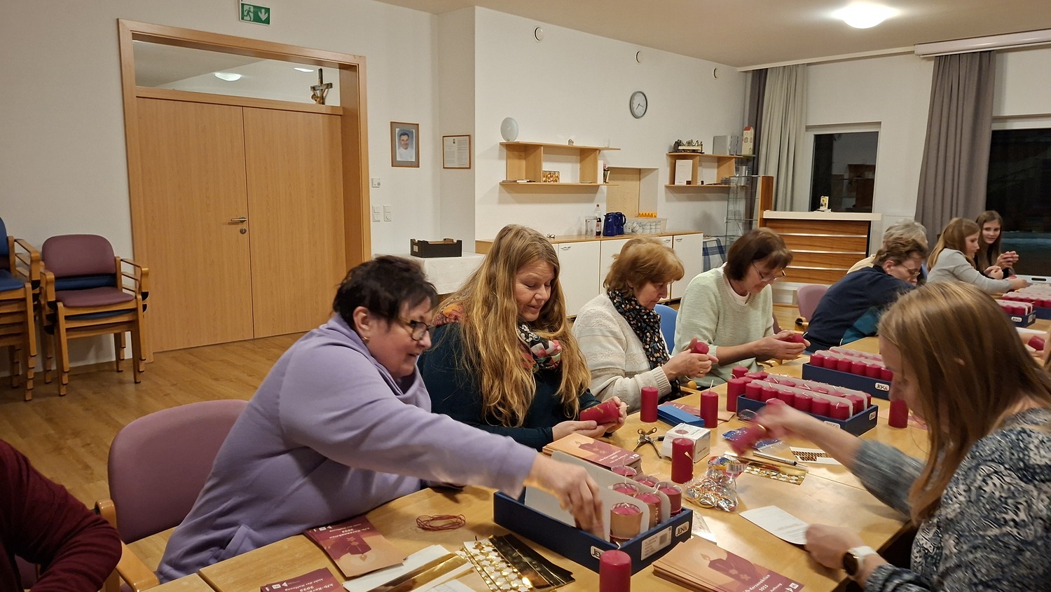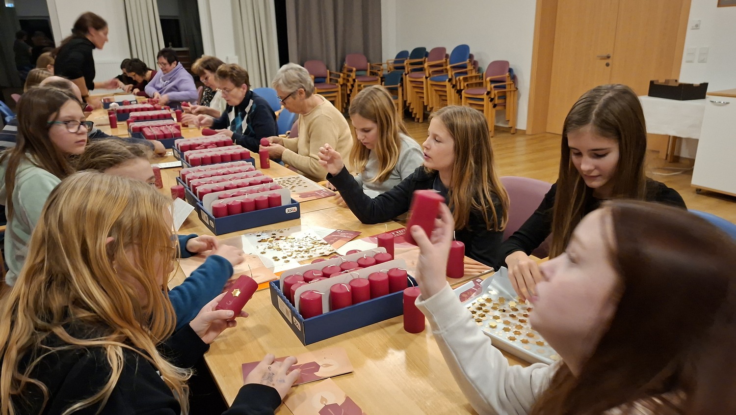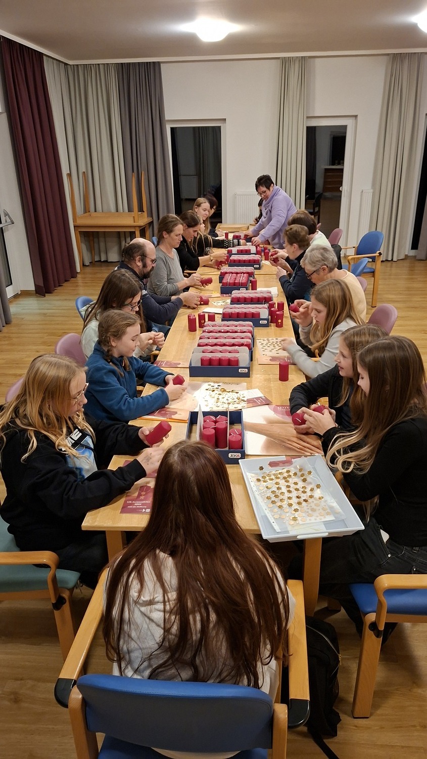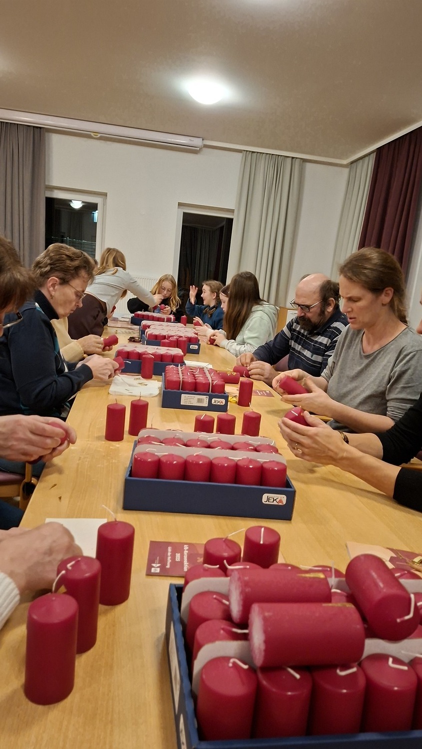 Insgesamt 21 Personen – 11 Frauen, 1 Jugendliche, 1 Mann sowie eine Firmgruppe – waren mit großer Freude und viel Kreativität dabei. Mit großer Motivation entstanden wunderschöne Kerzen, die nun darauf warten, Gutes zu bewirken.