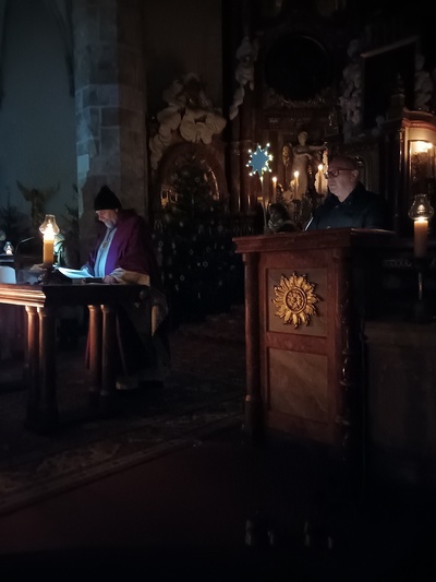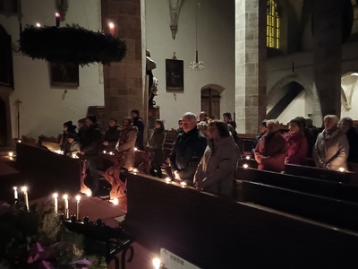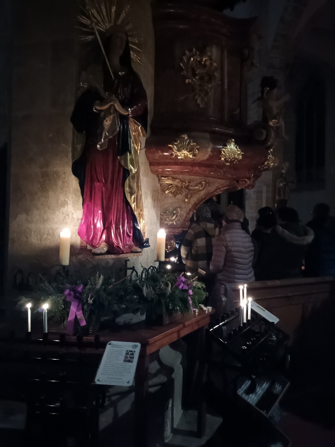 P. Christian zog bei Kerzenschein mit den Minis in die Kirche ein und eröffnete die Roratemesse mit dem Lied „Wir sagen euch an den lieben Advent“ .