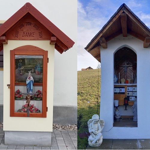 Zwei neue Marterl in unserer Pfarre Im Jahr 2024 wurden von der Familie Bernhuber und der Familie Hollerer, Petersberg Materl errichtet. zu den Bildern: Zwei neue Marterl in unserer Pfarre