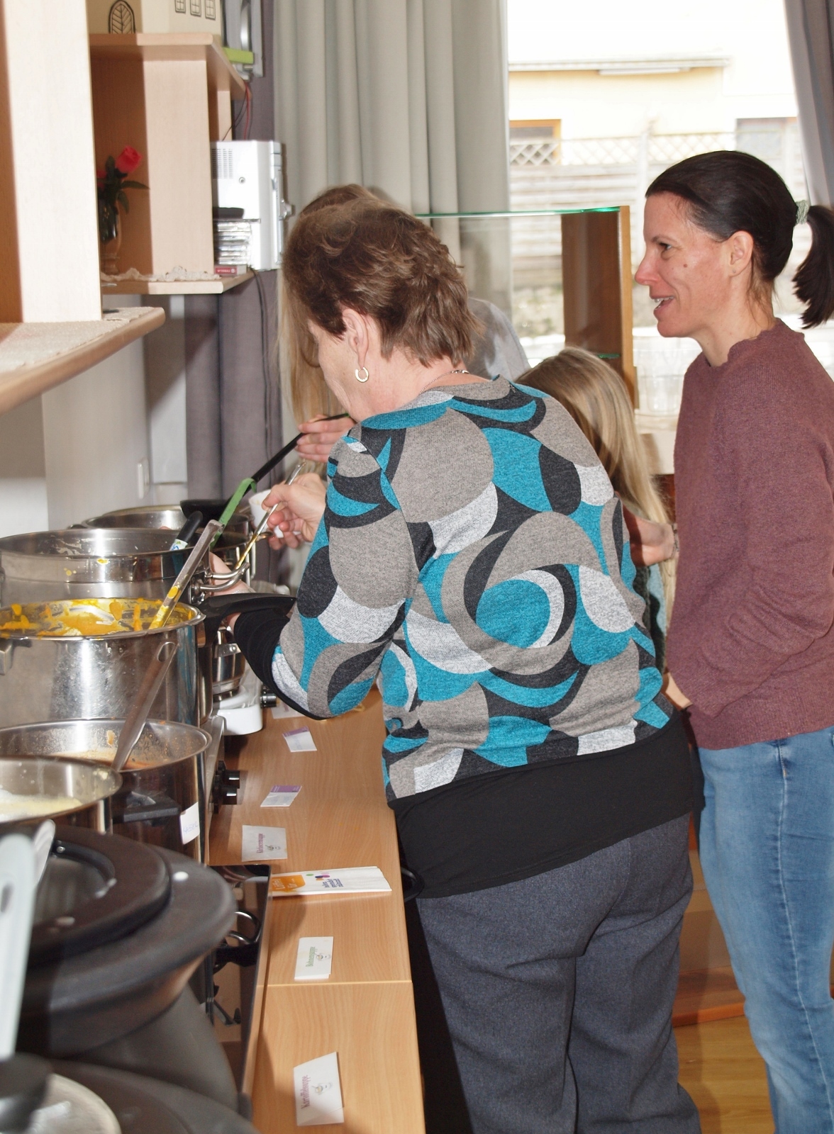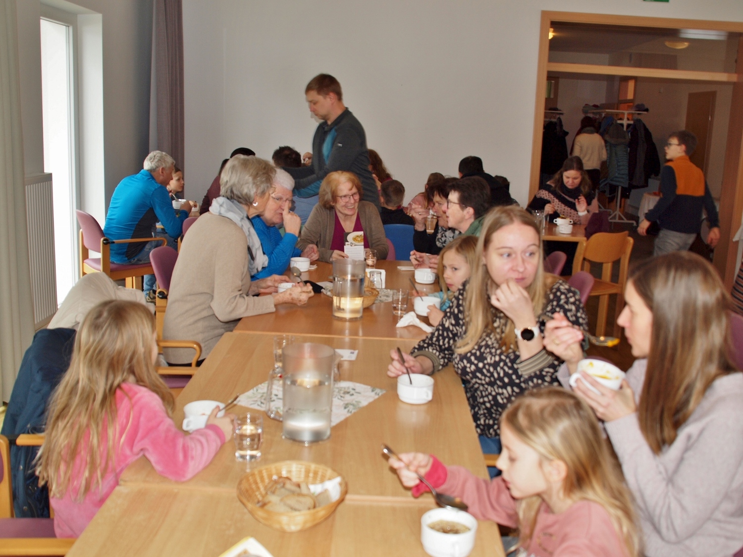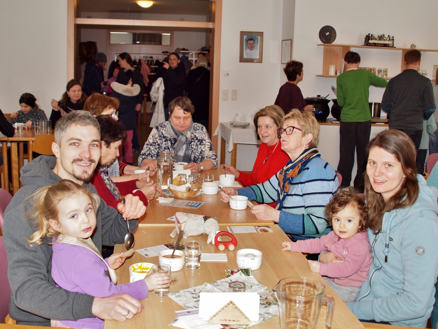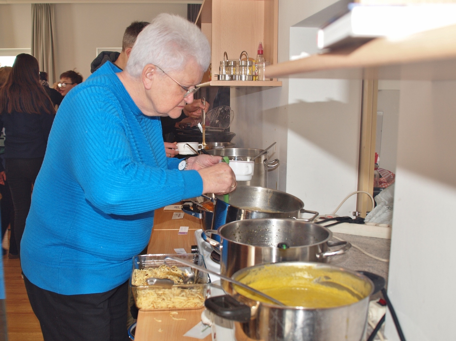 Die absoluten Renner waren die Einmachknöderlsuppe, Frittatensuppe, und Knoblauchcremesuppe, die schon bald leer waren. Aber auch die anderen sieben Suppensorten erfreuten die Gäste. Die Aktion Familienfasttag, die Frauenprojekte in aller Welt, heuer besonders in Indien, unterstützt, konnte mit 730,95 € aus der Pfarraktion gefördert werden. Die Generation 50+ veranstaltete ihr Suppenessen ebenfalls im Pfarrtreff, wo die fast 30 Besucher und Besucherinnen 377 € spendeten. Unterhaltsam war auch der Austausch über gerechte Aufteilung der Hausarbeit, wie es in der Bildungsarbeit in Indien gefördert wird.