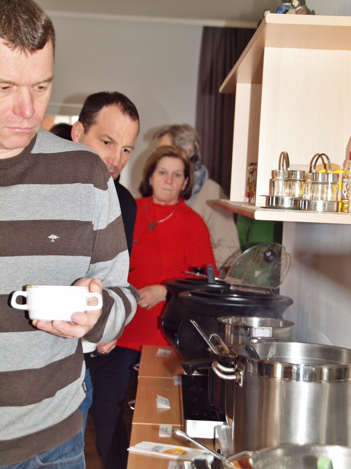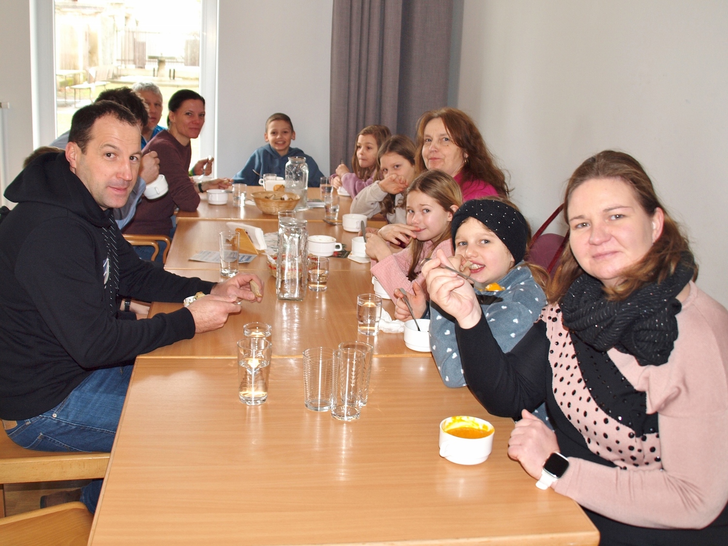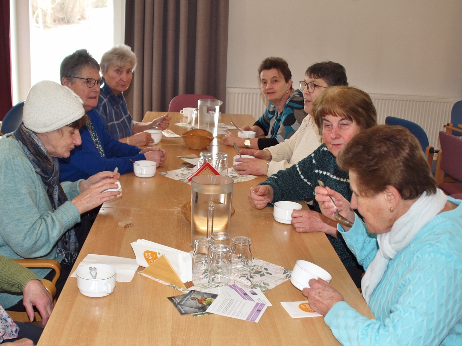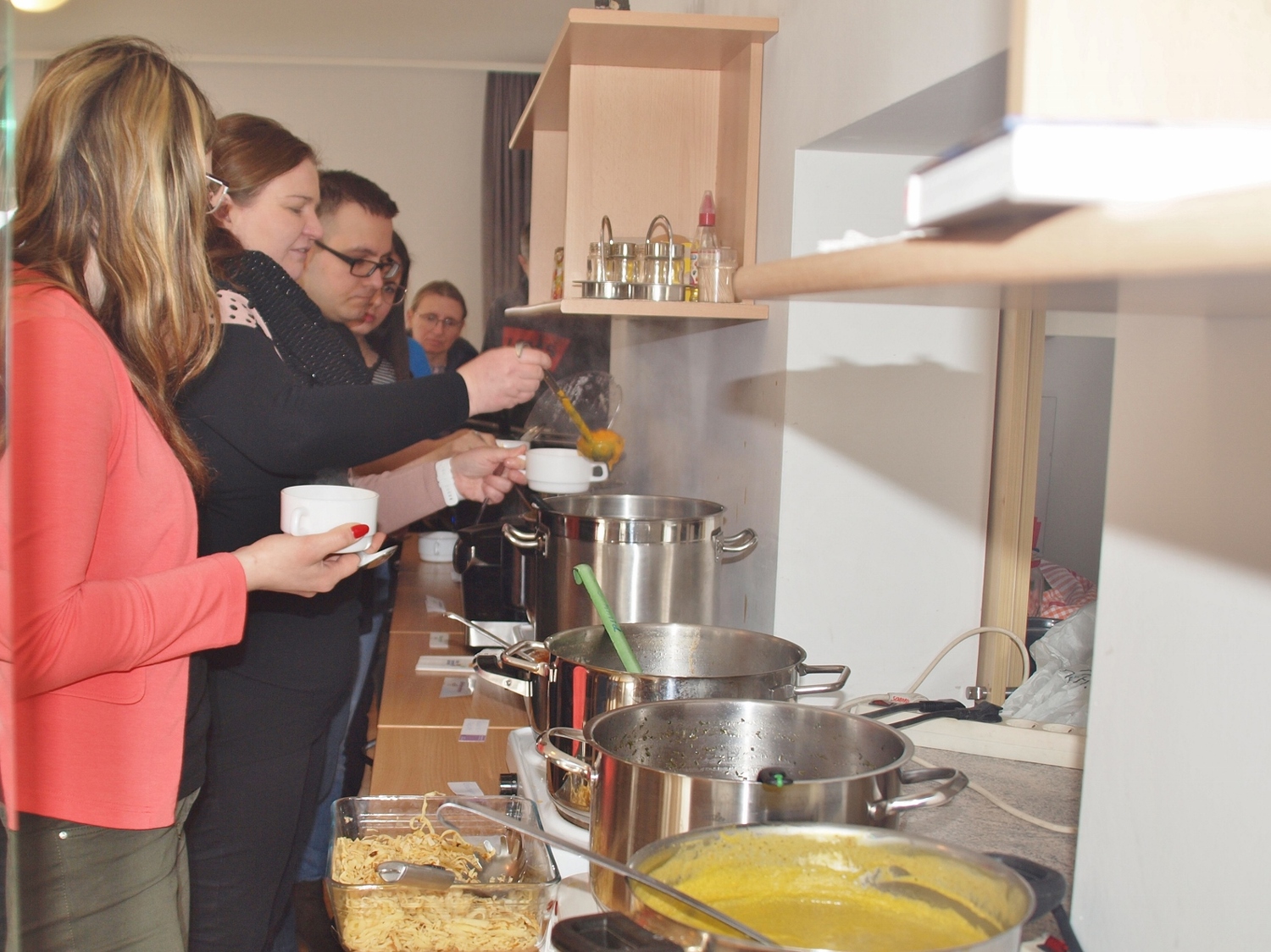 Die absoluten Renner waren die Einmachknöderlsuppe, Frittatensuppe, und Knoblauchcremesuppe, die schon bald leer waren. Aber auch die anderen sieben Suppensorten erfreuten die Gäste. Die Aktion Familienfasttag, die Frauenprojekte in aller Welt, heuer besonders in Indien, unterstützt, konnte mit 730,95 € aus der Pfarraktion gefördert werden. Die Generation 50+ veranstaltete ihr Suppenessen ebenfalls im Pfarrtreff, wo die fast 30 Besucher und Besucherinnen 377 € spendeten. Unterhaltsam war auch der Austausch über gerechte Aufteilung der Hausarbeit, wie es in der Bildungsarbeit in Indien gefördert wird.