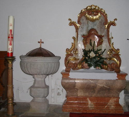 Vermutlich vom gleichen Künstler stammt auch die mit reicher Rocailleschnitzerei versehene Kredenz neben dem Taufstein. Dieser ist gleichfalls ein beachtenswertes Stück, das an der Vorderseite des runden und gerippten Beckens ein kleines Schild mit der Jahreszahl 1586 besitzt. Neben dem Taufstein und dem Taufaltärchen hängt an der Wand über dem Sakristeieingang ein größeres, altarbildartiges Gemälde mit der Taufe Christi, ein Werk von Johann Wetzl (1800).