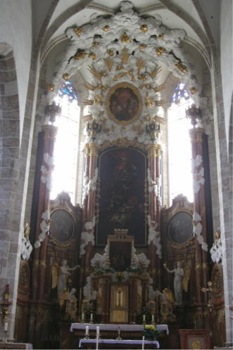 Das beherrschendste Ausstattungsstück der Kirche ist unbestritten der Hochaltar, der den Chorschluss in seiner vollen Breite und Höhe einnimmt. Der Altar besteht aus Holz und ist in seinen konstruktiven Teilen bräunlich marmoriert. Der Aufbau besteht im wesentlichen aus Bündeln von jeweils drei schlanken Rundsäulen, die vor den Wandpfeilern in den vier Ecken des Chorschlusses stehen und ungefähr in zwei Drittel der Raumhöhe reichen. Die Säulenbündel sind im unteren Teil etwas stärker und wirken durch das vergoldete Querband bis zu dieser Höhe gleichsam als Sockel. Darüber schlingen sich um die Säulen spiralenförmig weiß gefasste Wolken mit einigen aufgesetzten, vergoldeten Engelsköpfchen. Über den vergoldeten, ineinander übergehenden Palmettenkapitellen sind schwarze, mit Maßwerk und Rosetten verzierte Urnen aufgesetzt. Die Gewölberippen sind mit Wolken und zahlreichen vergoldeten Engelsköpfchen überzogen. Der Bereich des Sockelgeschosses ist seitlich auf die frontal gegenüberliegende Nord- und Südseite des Chorschlusses vorgezogen und schließt mit einem ausladenden Profilgesimse ab, unter dem ein doppelt verschränkter Spitzbogenfries mit Krabbenenden herumgeführt ist. Darüber ist an der östlichen Chorwand, zwischen den zwei Säulenbündeln eingespannt, das mächtige Altargemälde von Martin Johann Schmidt (genannt der „Kremser Schmidt“) angebracht (signiert: „M. J. Schmidt fecit 1796“). Das Bild ist ziemlich dunkel, so dass auf den ersten Blick kaum zu entnehmen ist, was eigentlich dargestellt ist. Durch den für das Bild ungünstigen seitlichen Lichteinfall von den Fenstern der Chorschrägen her wird ein genaues Erkennen des Dargestellten noch zusätzlich erschwert. Das Bild zeigt im unteren Teil das Martyrium der Apostel Simon und Judas Thaddäus und im oberen Teil Christus, von Engeln umgeben. Über diesem Hauptbild ist noch ein ovales Oberbild vorhanden, das eine Schar von Engeln zeigt, die den Namen Jahwe anbeten. Das Bild ist mit einem überaus reichen Wolken- und Strahlenkranz umgeben, vor dem auch noch einige Engelsputti und zahlreiche Engelsköpfe schweben.