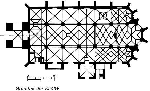 Im westlichen Joch ist in der vollen Breite der drei Schiffe, jedoch nicht in der vollen Tiefe des ersten Joches, die Empore eingebaut. Sie wird von vier schlanken, achtseitigen Pfeilern über runden Sockeln getragen und öffnet sich zu den drei Langhausschiffen in fünf Spitzbögen mit profilierter Rahmung. Unter der Empore ergeben sich demnach fünf Gewölbejoche, wobei das südliche teilweise durch den Emporenaufgang verbaut ist.