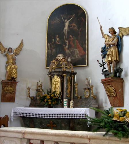 Seitenaltar im Südchor: ein architektonischer Aufbau in der üblichen Art ist nicht (mehr) vorhanden, sondern lediglich ein verhältnismäßig einfacher, marmorierter und teilweise vergoldeter Tabernakel sowie ein Altarbild an der bloßen Wand darüber. Der Tabernakel ist ähnlich dem am Hochaltar mit Säulen und neugotischen Spitzbogenmotiven verziert. Bekrönt ist er mit einem Laubbündel, in welchem sich die Paradiesesschlange mit einem Apfel im Maul windet. Das Altarbild darüber zeigt die Anbetung des Christkindes durch viele große und kleine Engel. Das Gemälde stammt vermutlich von Andreas Rudroff, einem Schüler des Kremser Schmidt. Das Bild links vom Mittelbild zeigt die Kreuzabnahme. Es stammt vermutlich auch von Rudroff und ist eine freie Nachbildung eines Gemäldes von Rubens. Das Bild auf der rechten Seite stellt eine figurenreiche Kreuzigung Christi dar. Als Schöpfer dieses Gemäldes kann wohl Martin Johann Schmidt selbst gelten.