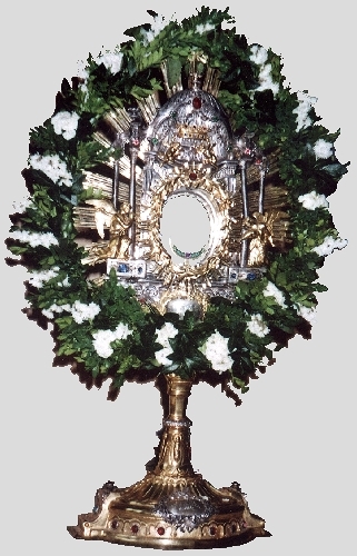 Säulenpaar. Auf den abgerundeten Seitenflächen ist links und rechts ein vergoldetes Relief mit Darstellungen der Jünger von Emmaus und Mose vor dem brennenden Dornbusch zu sehen. Unterhalb dieser Reliefs steht jeweils die entsprechende Bibelstelle geschrieben. Der Tabernakel schließt nach oben zu mit einer Spitzbogenbalustrade ab, die über den Säulchen eine Art Kreuzblumenaufsatz trägt. Den bekrönenden Abschluss des Tabernakels bildet ein vergoldeter Rahmen mit Spitzbogenfries und vier Fialen für Wechselbilder. Seitlich des Tabernakels kniet jeweils ein anbetender Engel.