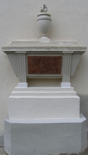 Rechts vom Eingang steht ein einfaches, klassizistisches Grabmal für Anna Wilhelmina Reichsfreiin von Wickenburg (1792) aus Sandstein mit Sarkophag und aufgesetzter Flammenvase. Die vierte und ungefähr die Hälfte der fünften Achse werden durch den zweigeschossigen Sakristei- und Oratoriumsanbau verdeckt. Unterhalb des Dachgesimses sind mehrere kleine Rundöffnungen vorhanden, die der Durchlüftung des Dachbodens dienen.