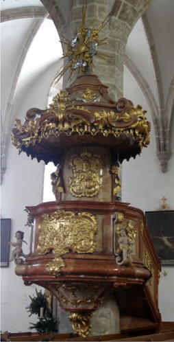 Ein künstlerisch bedeutendes Ausstattungsstück ist die Kanzel am ersten Chorpfeiler links. Der Kanzelfuß ist reich mit Rocailleschnitzereien verziert, an der Vorderseite der von Volutenbändern mit aufgesetzten Putten gegliederten Brüstung ist ein vergoldetes Relief mit einer Pfingstdarstellung angebracht. Der Schalldeckel ist mit reichem Rocaille- und Volutenschmuck versehen und wird vom Auge Gottes in der Glorie bekrönt. Die Kanzel ist ein Werk des Bildhauers Andreas Gruber aus St. Pölten (1754).